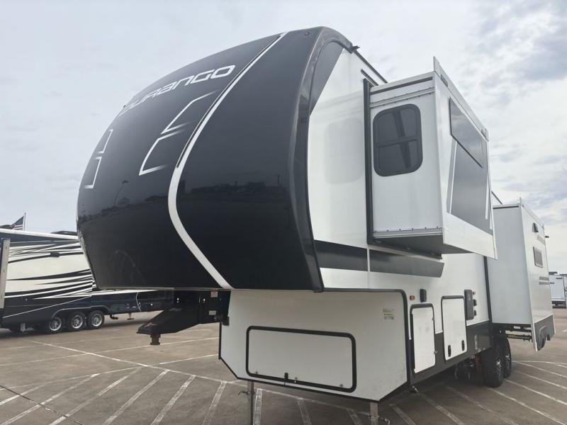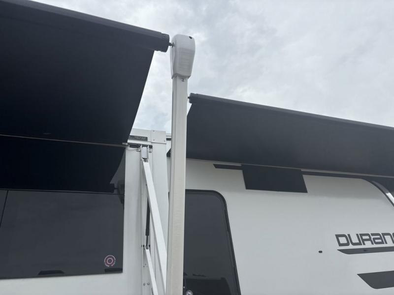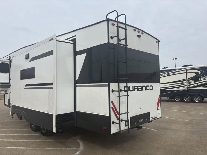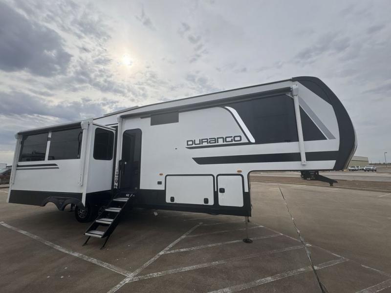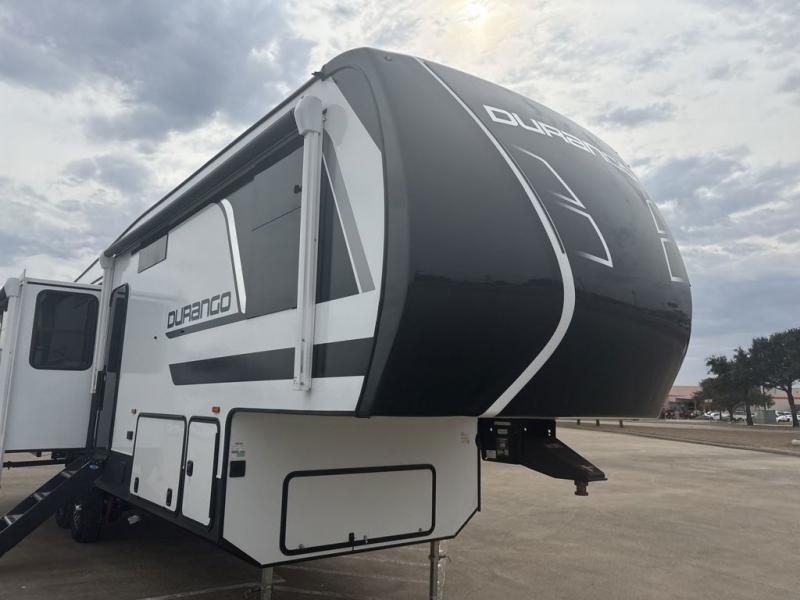 Enjoy full time living, an affordable price, and a wide body construction for more living space with every one of these KZ Durango light high-profile fifth wheels! These luxury units can be used all year round with the all-weather insulation package, the 3" x 14" foam-core in-floor straight-line heating system with a 35,000 BTU furnace, and the 15,000 BTU ducted roof A/C which optimizes the airflow by an average of 40% for better performance, cooling time, and reduction of noise. A few other construction features you will appreciate include a one piece, seamless walk-on Tufflex roofing material, Pex® in-floor heated waterlines, and a Lamilux® gelcoat fiberglass exterior. Inside, blancher maple & morel fog cabinetry , a king size bed, and smart TVs will have you feeling like you never left home!