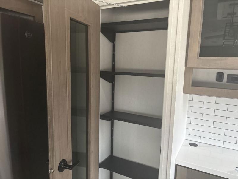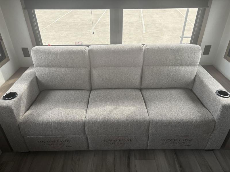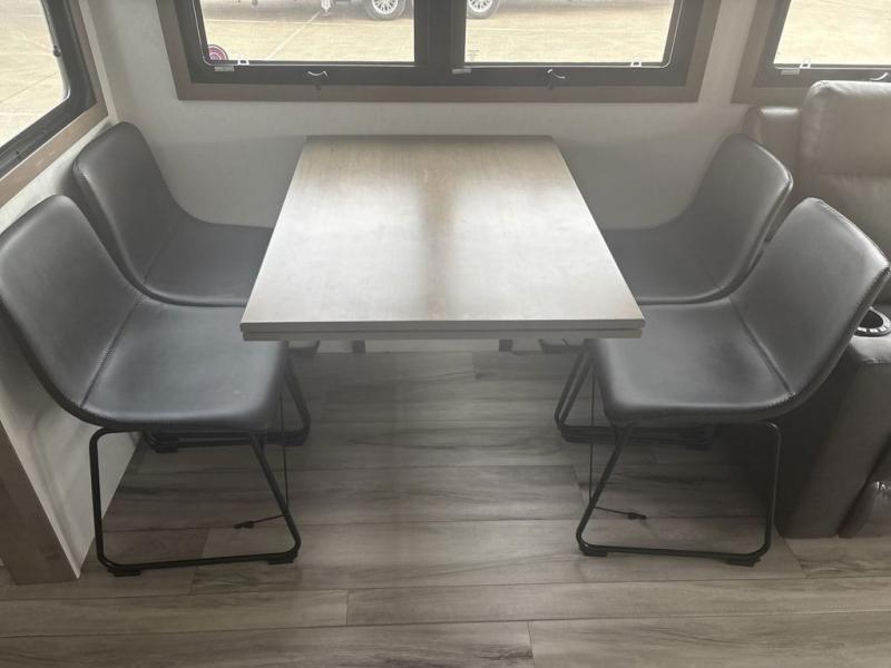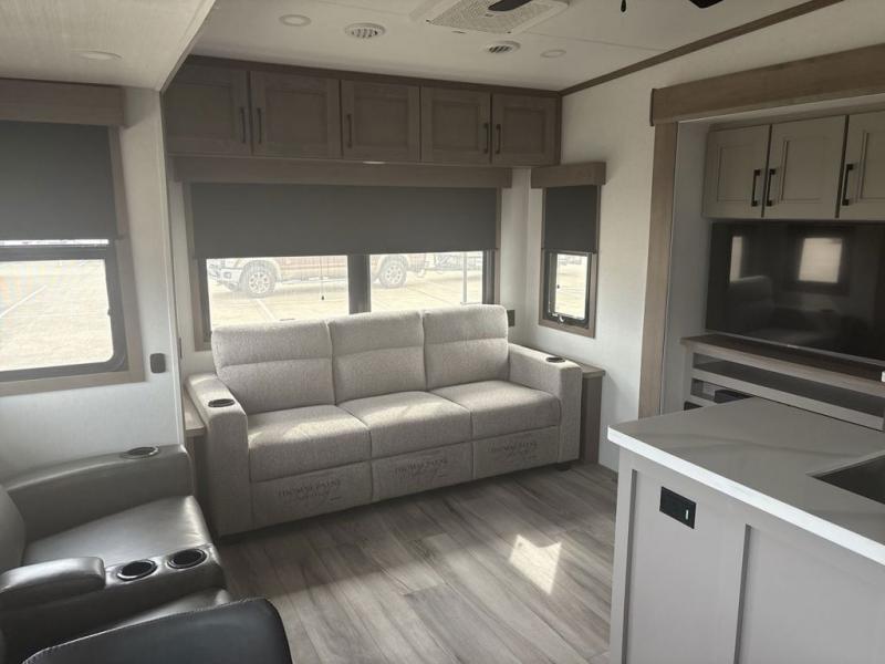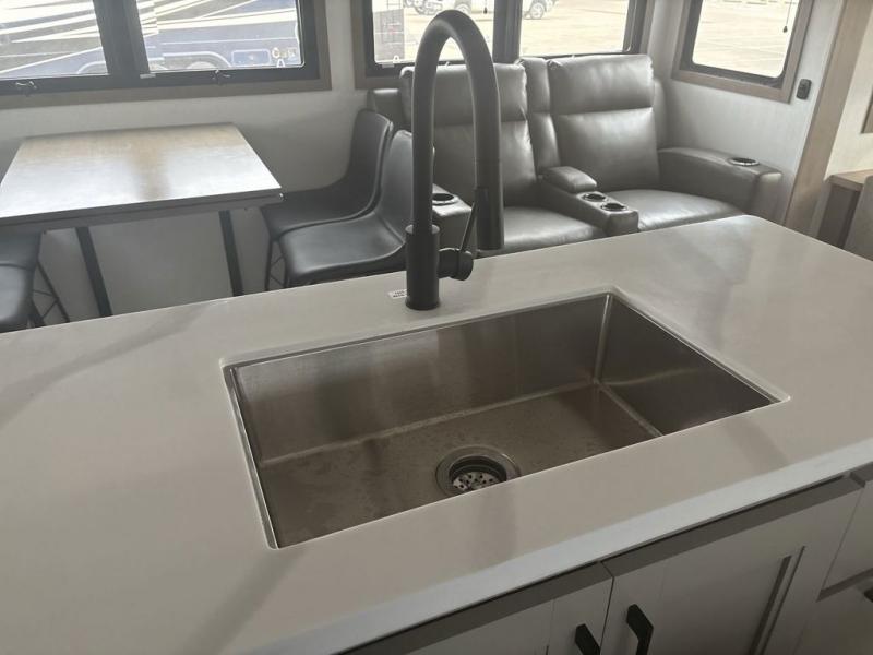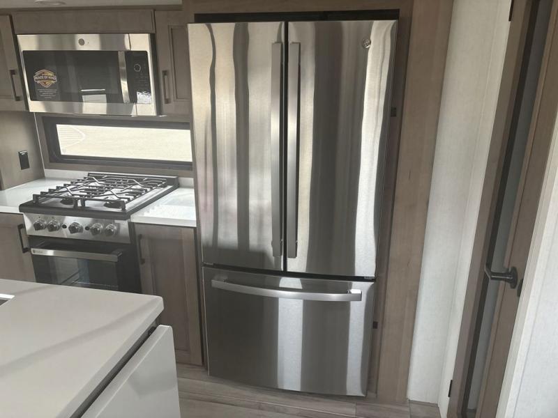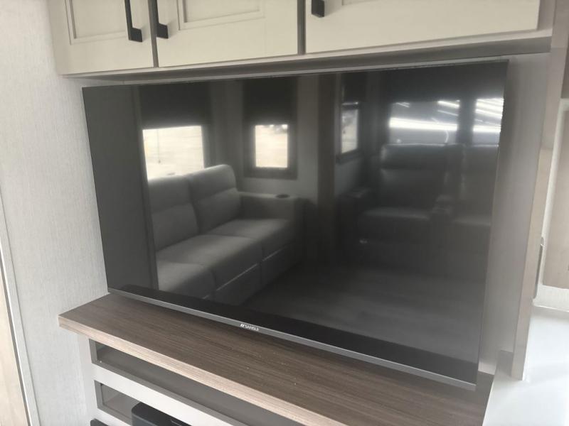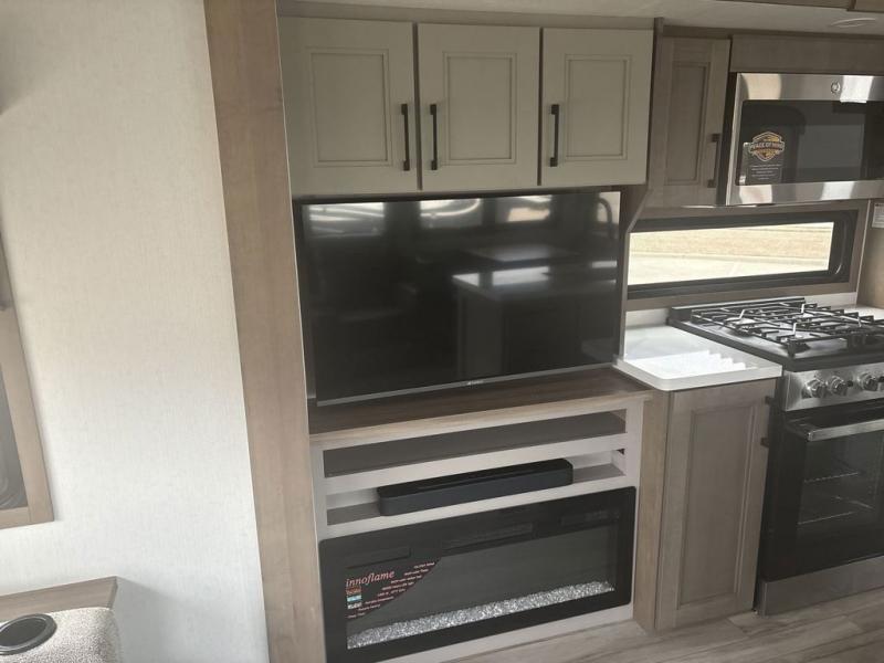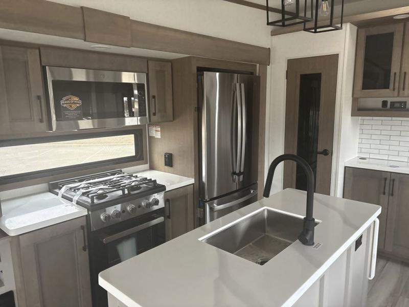 Start camping in luxury with this fifth wheel! The front private bedroom has a king bed slide which can be switched for an optional queen instead, a dresser, and a front wardrobe with washer and dryer prep. Start each morning feeling clean and fresh after showering in the 48" x 30" residential shower with a seat in the full bathroom. The kitchen has an island ideal for enjoying your morning coffee while reading the newspaper and socializing with the chef whipping up some scrambled eggs on the four burner range. The hutch can store your dishes, the pantry can store your canned goods, and the 18 cu. ft. refrigerator will keep your perishables fresh. If mother nature is raining on your parade then read a book on the rear hide-a-bed sofa or relax in the theater seating which has USB charging. And the entertainment center with a fireplace and 43" smart LED TV will keep you entertained!