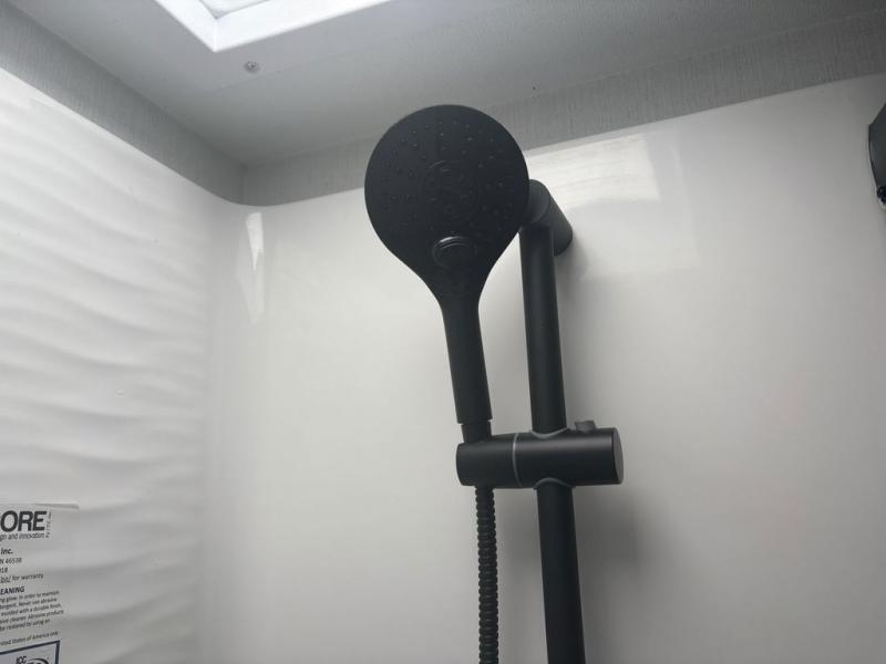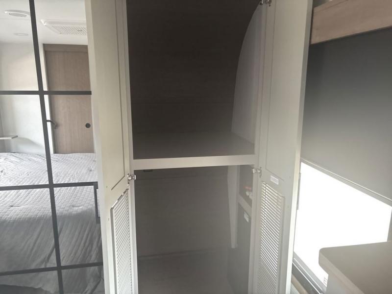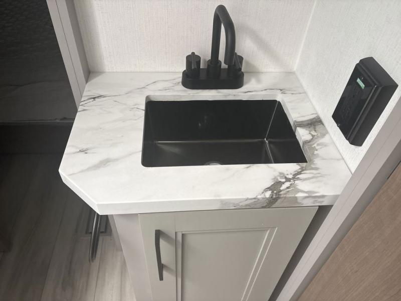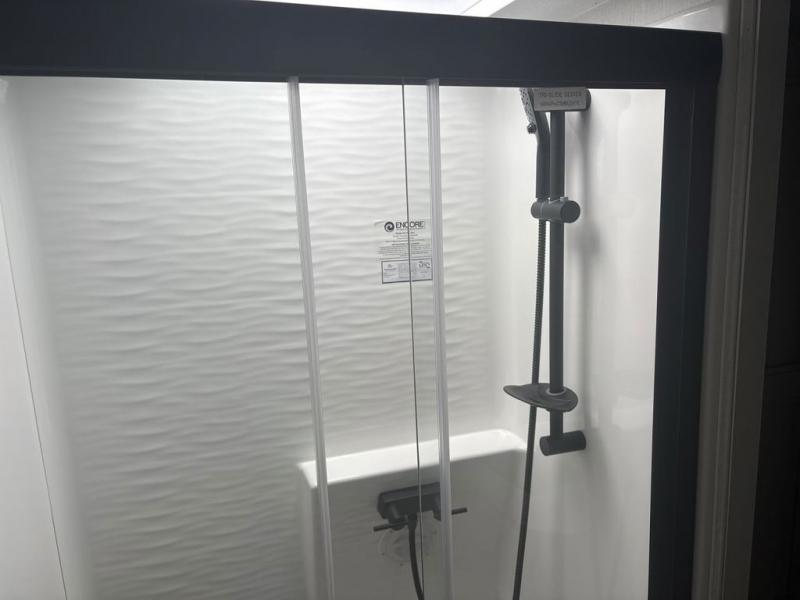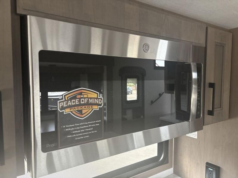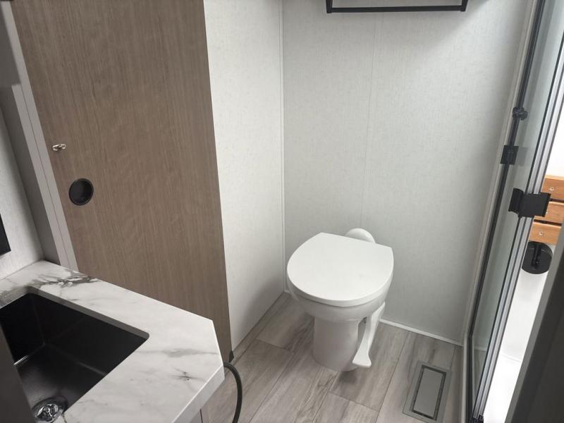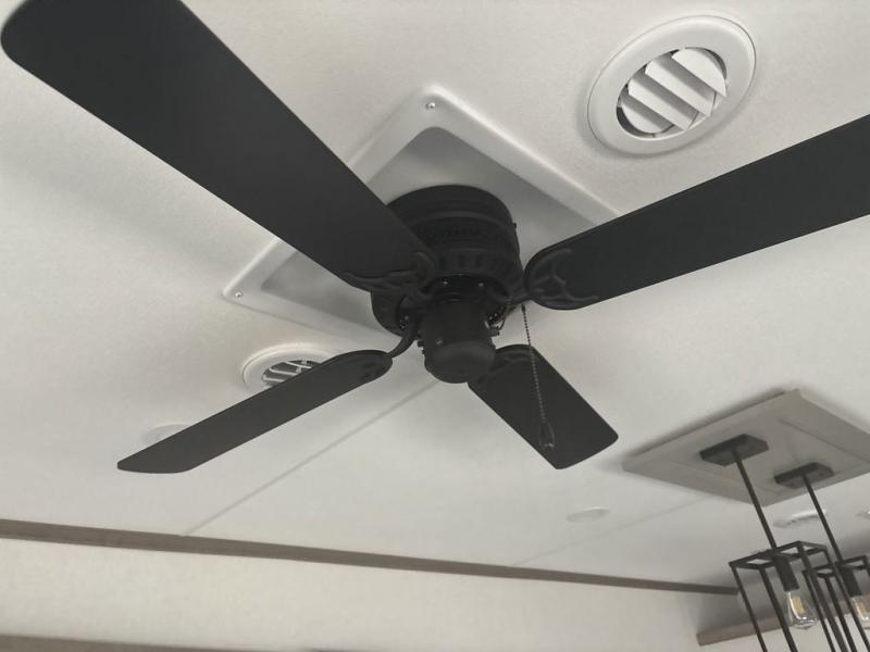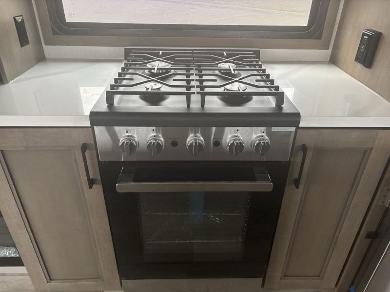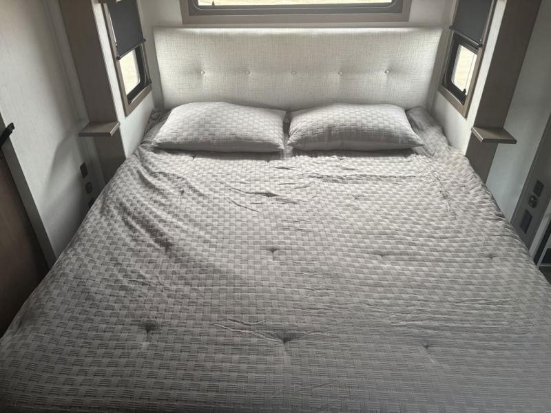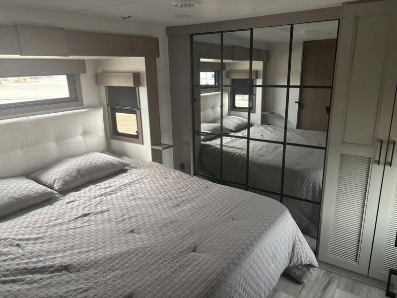 Start camping in luxury with this fifth wheel! The front private bedroom has a king bed slide which can be switched for an optional queen instead, a dresser, and a front wardrobe with washer and dryer prep. Start each morning feeling clean and fresh after showering in the 48" x 30" residential shower with a seat in the full bathroom. The kitchen has an island ideal for enjoying your morning coffee while reading the newspaper and socializing with the chef whipping up some scrambled eggs on the four burner range. The hutch can store your dishes, the pantry can store your canned goods, and the 18 cu. ft. refrigerator will keep your perishables fresh. If mother nature is raining on your parade then read a book on the rear hide-a-bed sofa or relax in the theater seating which has USB charging. And the entertainment center with a fireplace and 43" smart LED TV will keep you entertained!