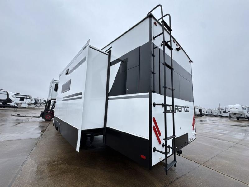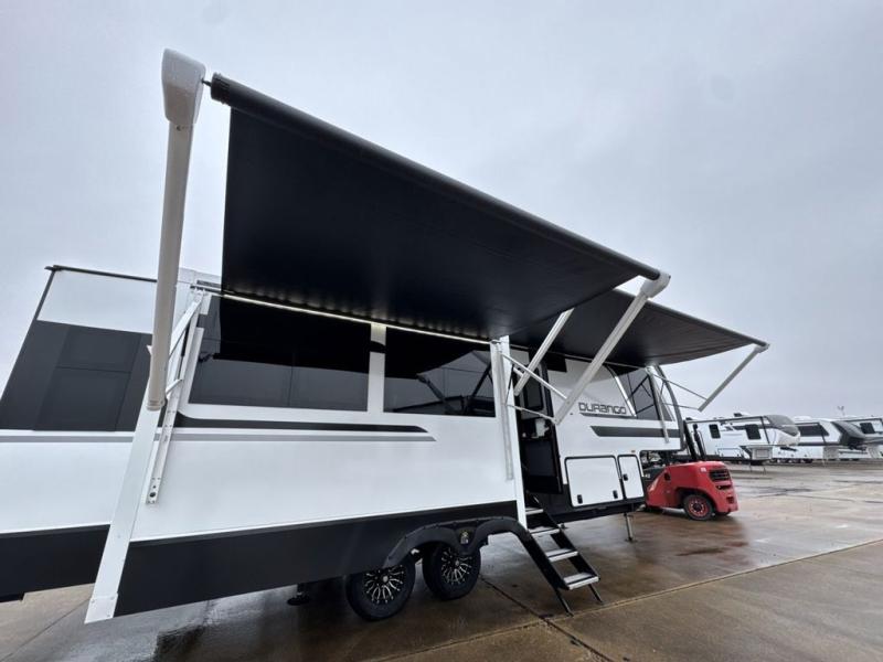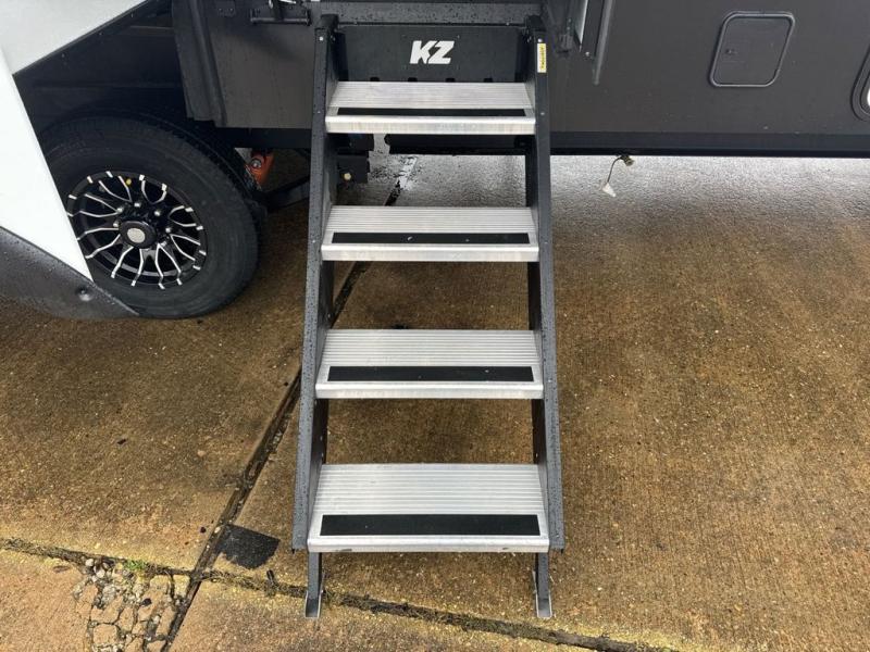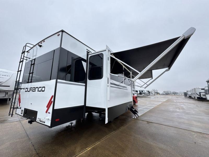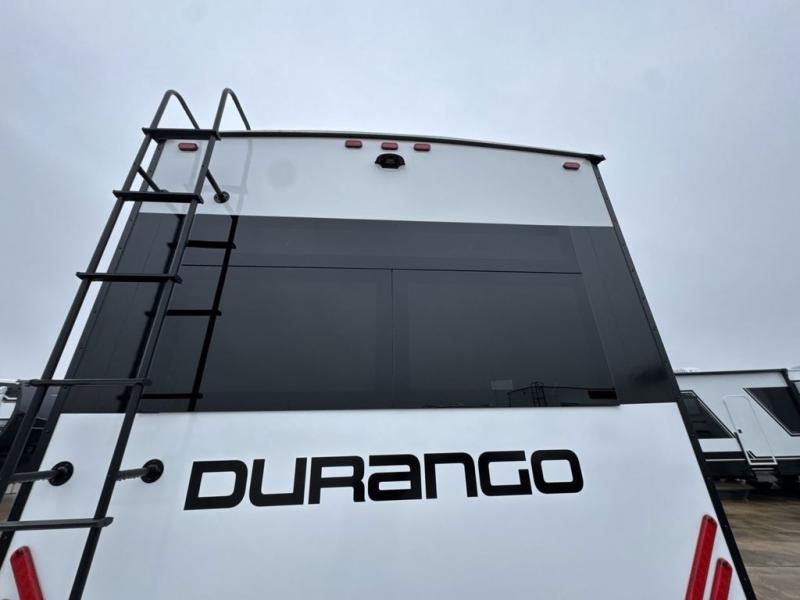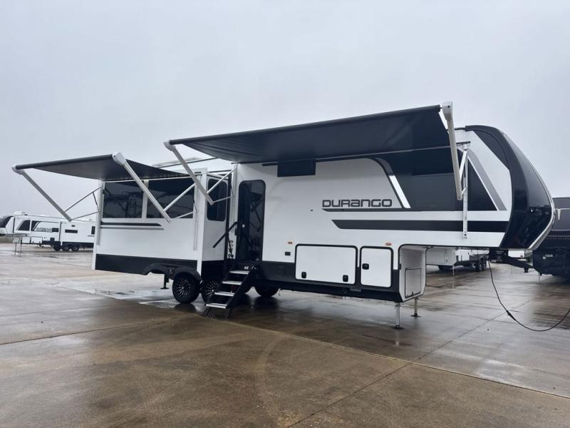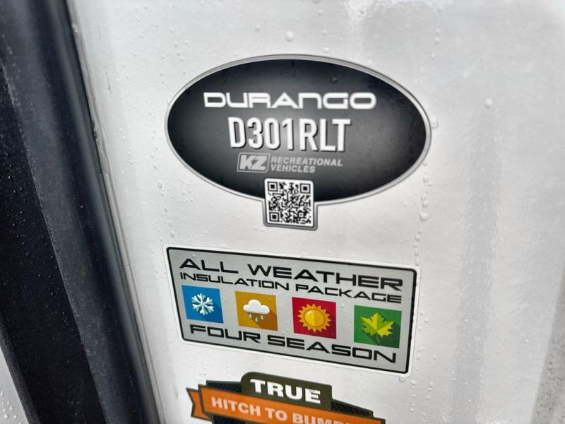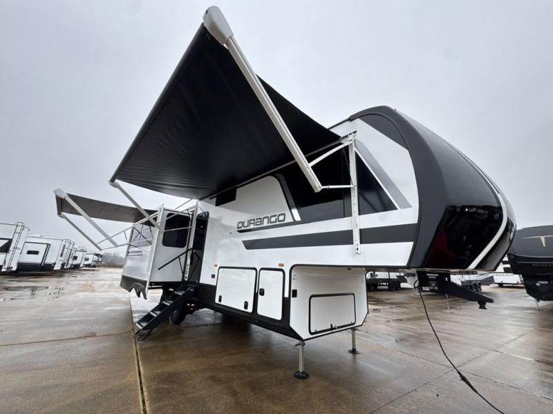 Enjoy full time living, an affordable price, and a wide body construction for more living space with every one of these KZ Durango light high-profile fifth wheels! These luxury units can be used all year round with the all-weather insulation package, the 3" x 14" foam-core in-floor straight-line heating system with a 35,000 BTU furnace, and the 15,000 BTU ducted roof A/C which optimizes the airflow by an average of 40% for better performance, cooling time, and reduction of noise. A few other construction features you will appreciate include a one piece, seamless walk-on Tufflex roofing material, Pex® in-floor heated waterlines, and a Lamilux® gelcoat fiberglass exterior. Inside, blancher maple & morel fog cabinetry , a king size bed, and smart TVs will have you feeling like you never left home!