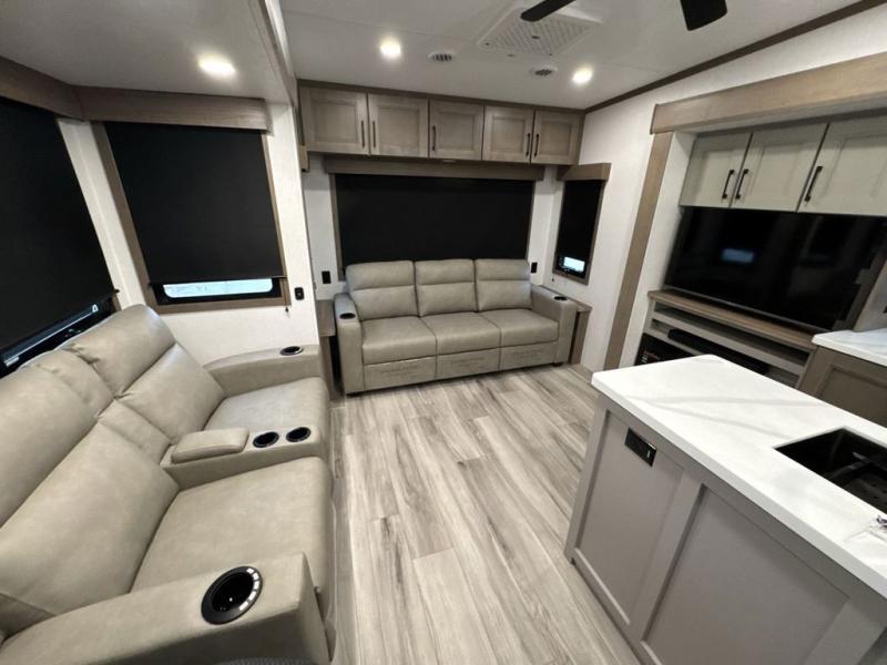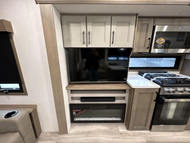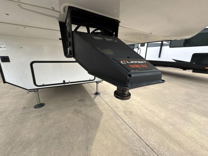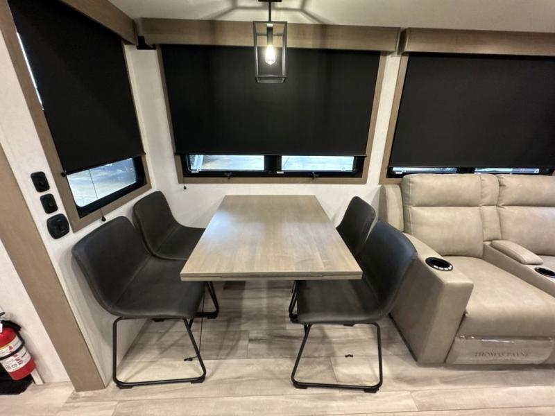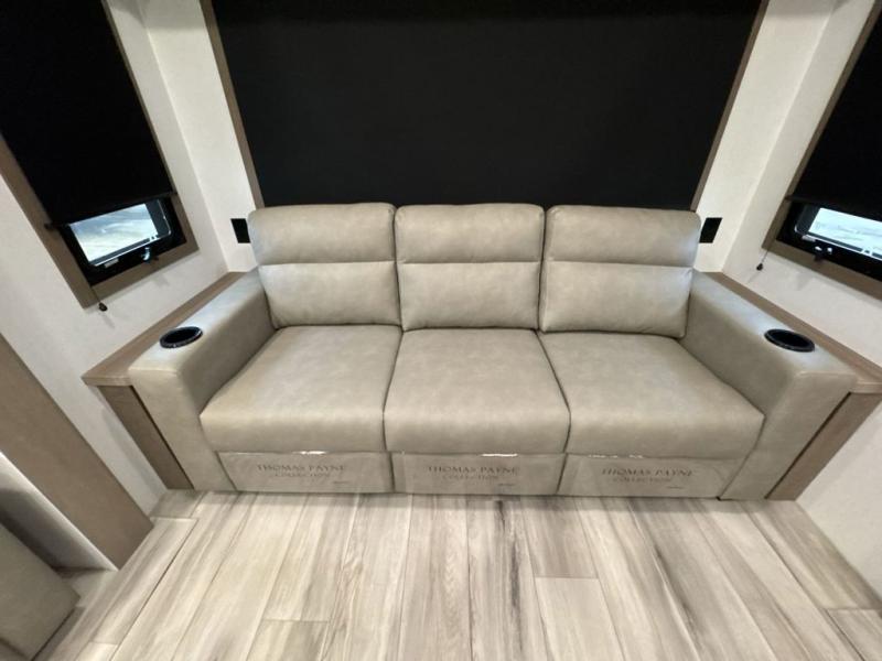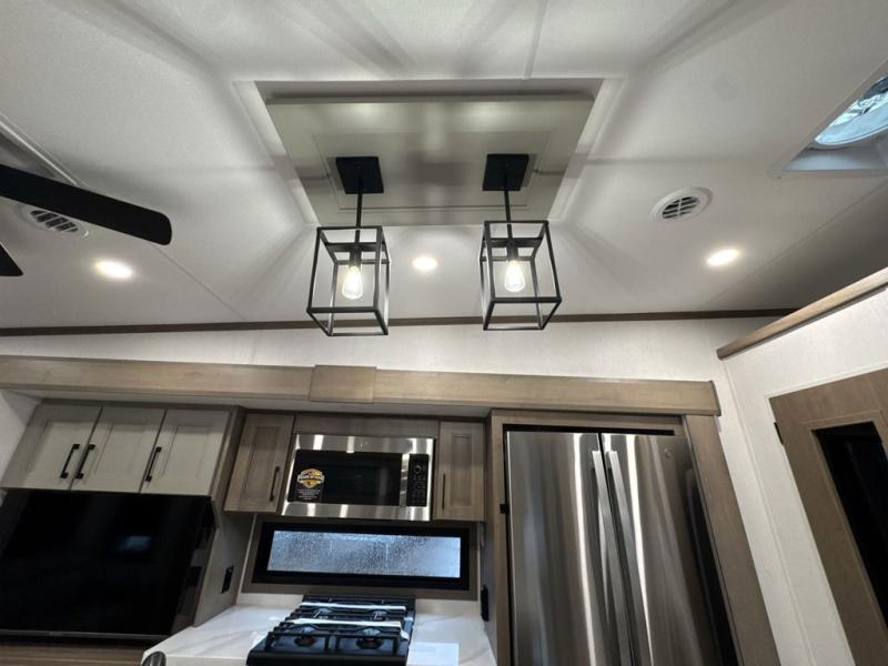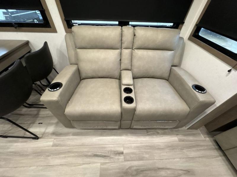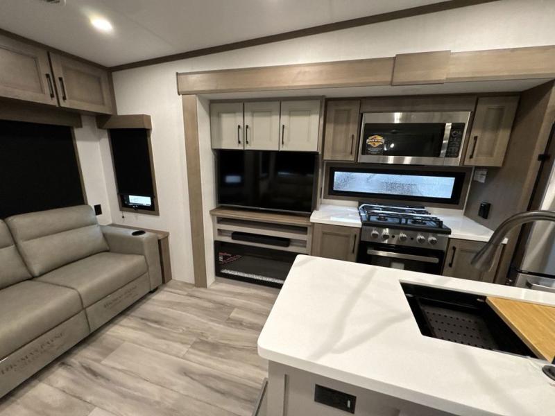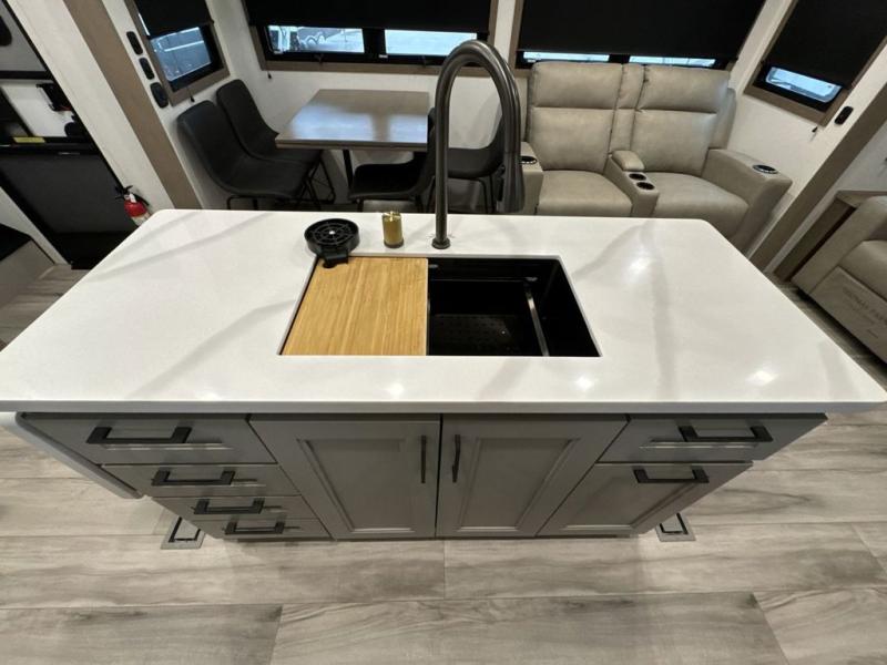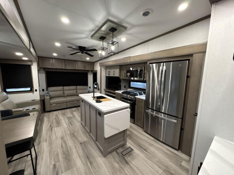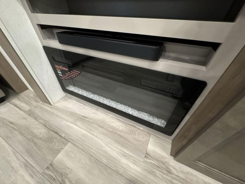 Start camping in luxury with this fifth wheel! The front private bedroom has a king bed slide which can be switched for an optional queen instead, a dresser, and a front wardrobe with washer and dryer prep. Start each morning feeling clean and fresh after showering in the 48" x 30" residential shower with a seat in the full bathroom. The kitchen has an island ideal for enjoying your morning coffee while reading the newspaper and socializing with the chef whipping up some scrambled eggs on the four burner range. The hutch can store your dishes, the pantry can store your canned goods, and the 18 cu. ft. refrigerator will keep your perishables fresh. If mother nature is raining on your parade then read a book on the rear hide-a-bed sofa or relax in the theater seating which has USB charging. And the entertainment center with a fireplace and 43" smart LED TV will keep you entertained!