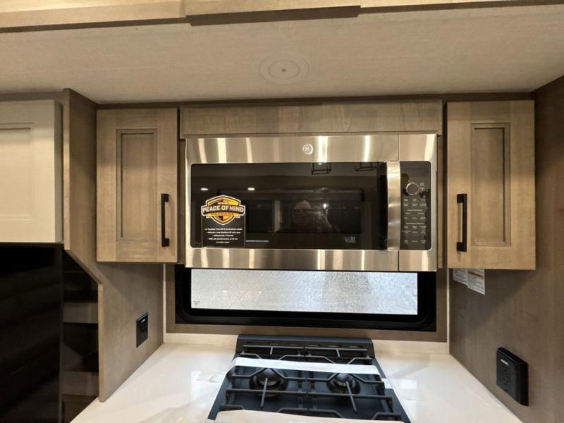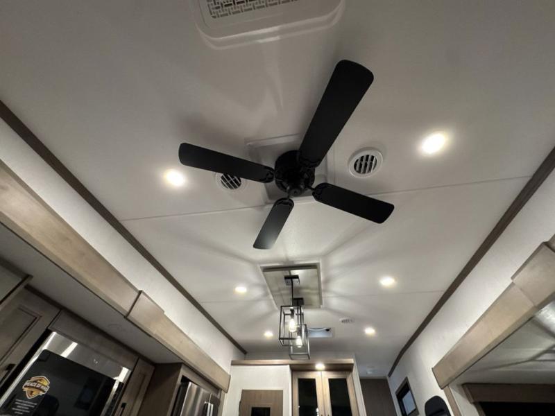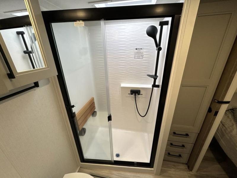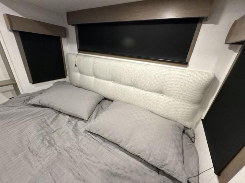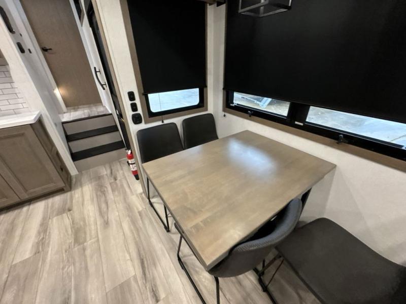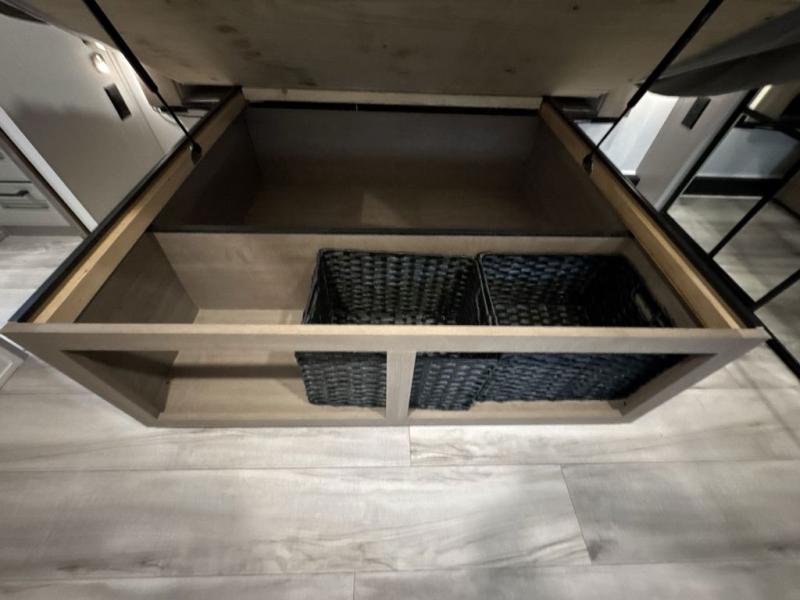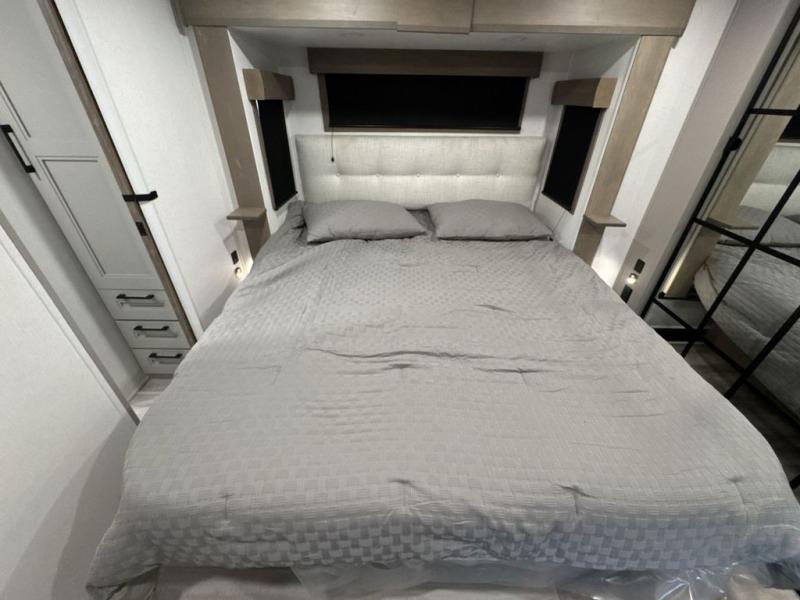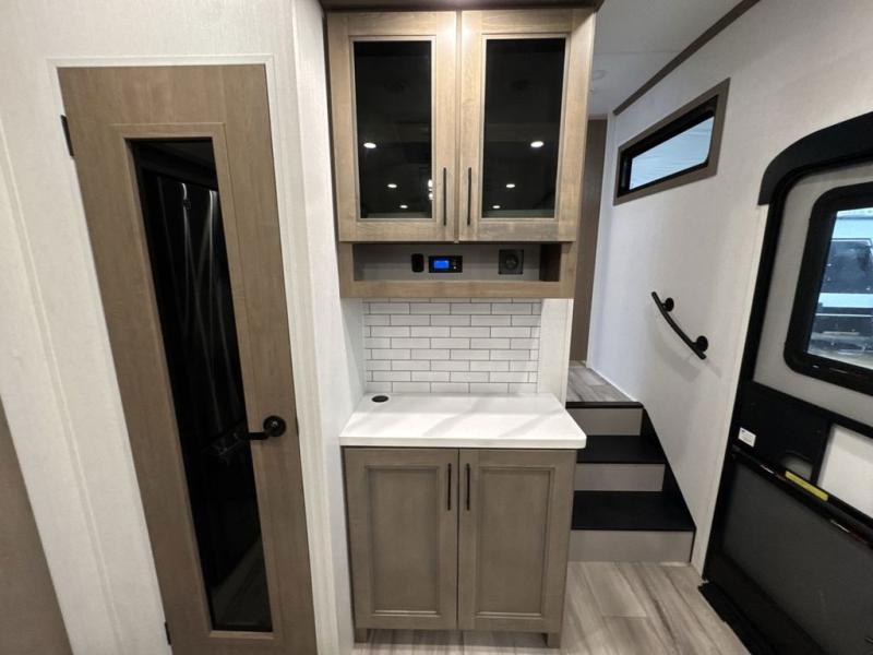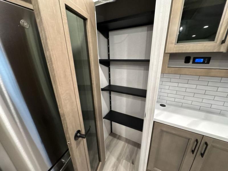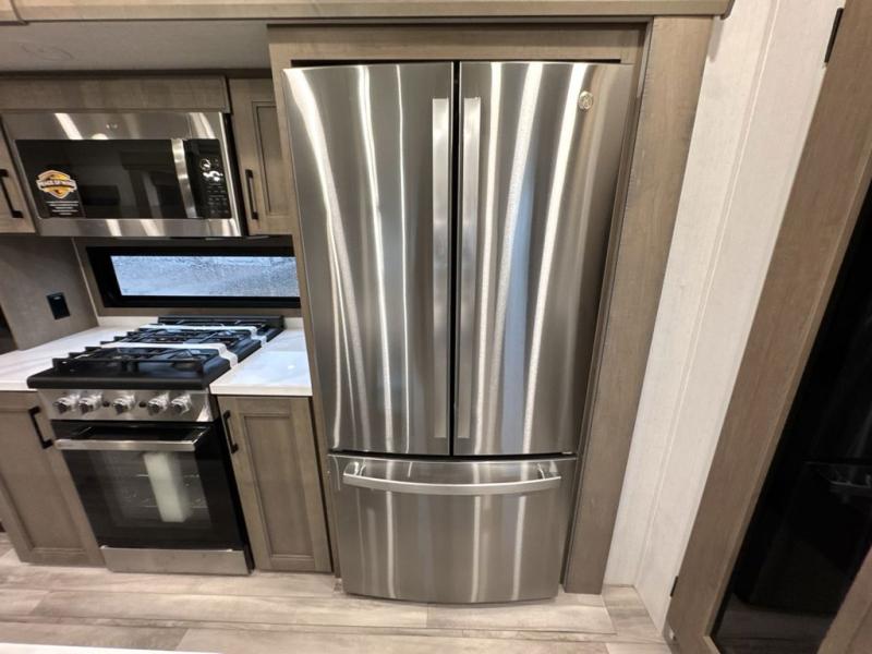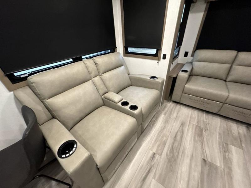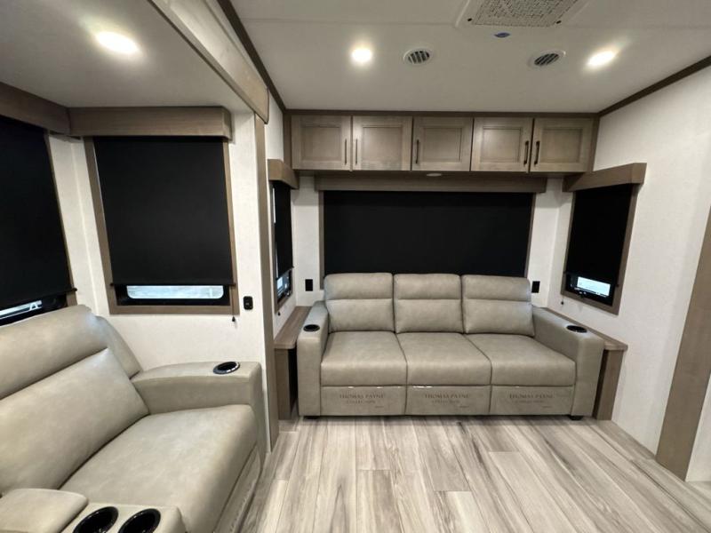 Start camping in luxury with this fifth wheel! The front private bedroom has a king bed slide which can be switched for an optional queen instead, a dresser, and a front wardrobe with washer and dryer prep. Start each morning feeling clean and fresh after showering in the 48" x 30" residential shower with a seat in the full bathroom. The kitchen has an island ideal for enjoying your morning coffee while reading the newspaper and socializing with the chef whipping up some scrambled eggs on the four burner range. The hutch can store your dishes, the pantry can store your canned goods, and the 18 cu. ft. refrigerator will keep your perishables fresh. If mother nature is raining on your parade then read a book on the rear hide-a-bed sofa or relax in the theater seating which has USB charging. And the entertainment center with a fireplace and 43" smart LED TV will keep you entertained!