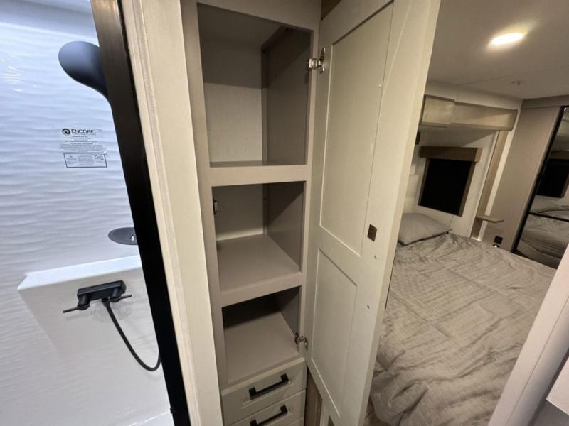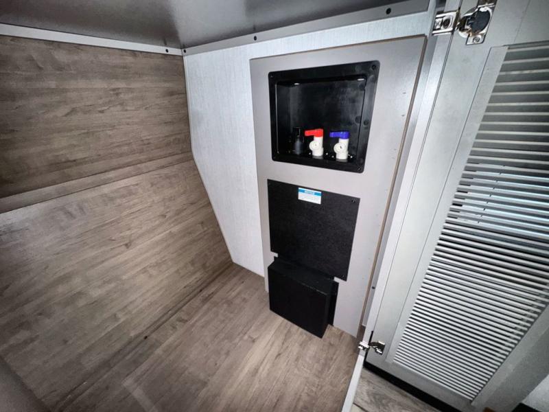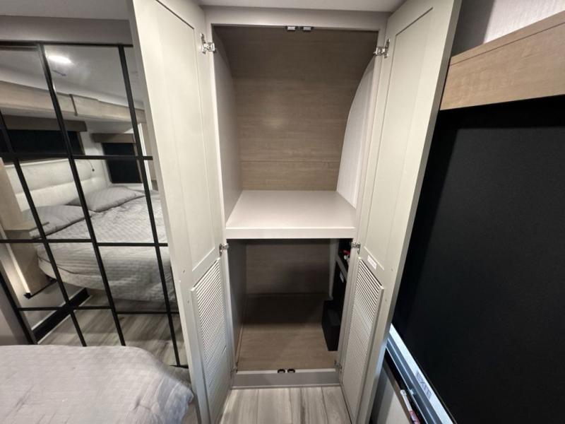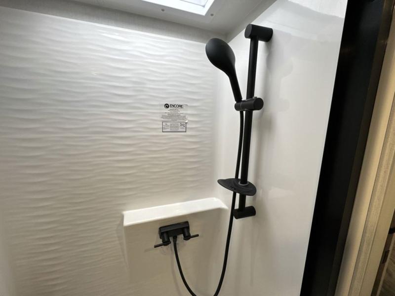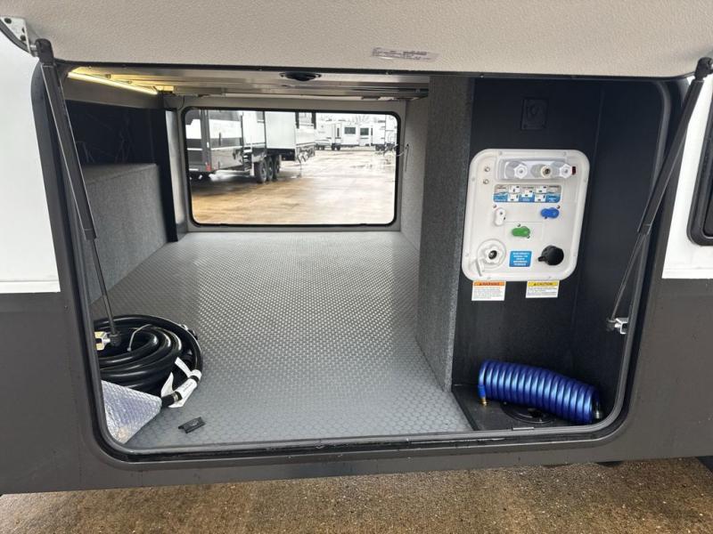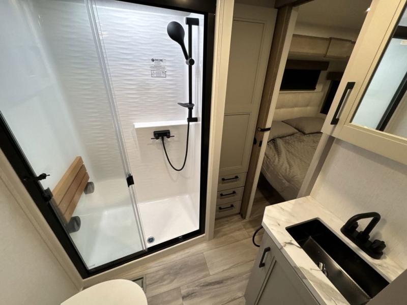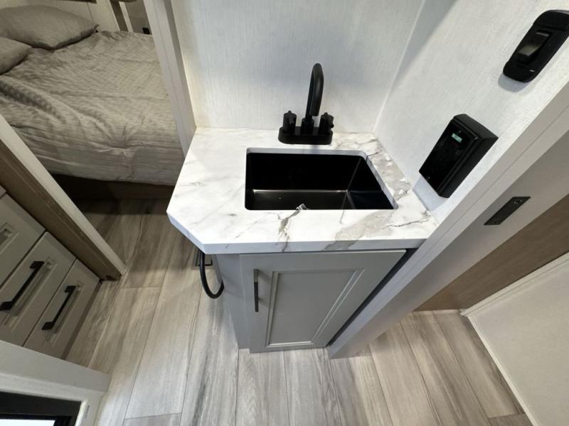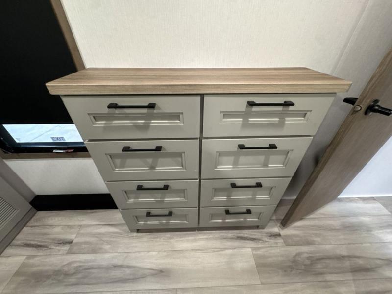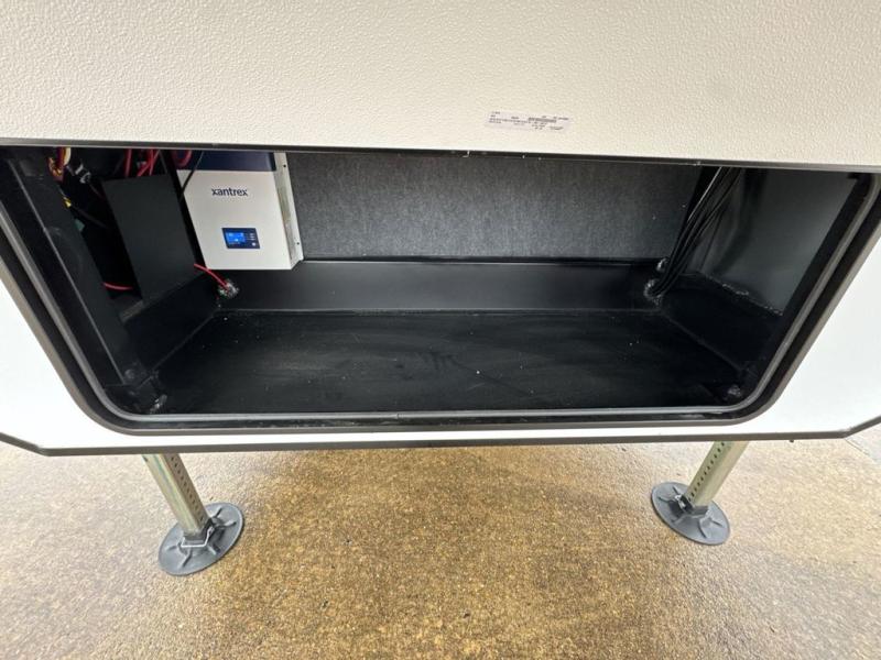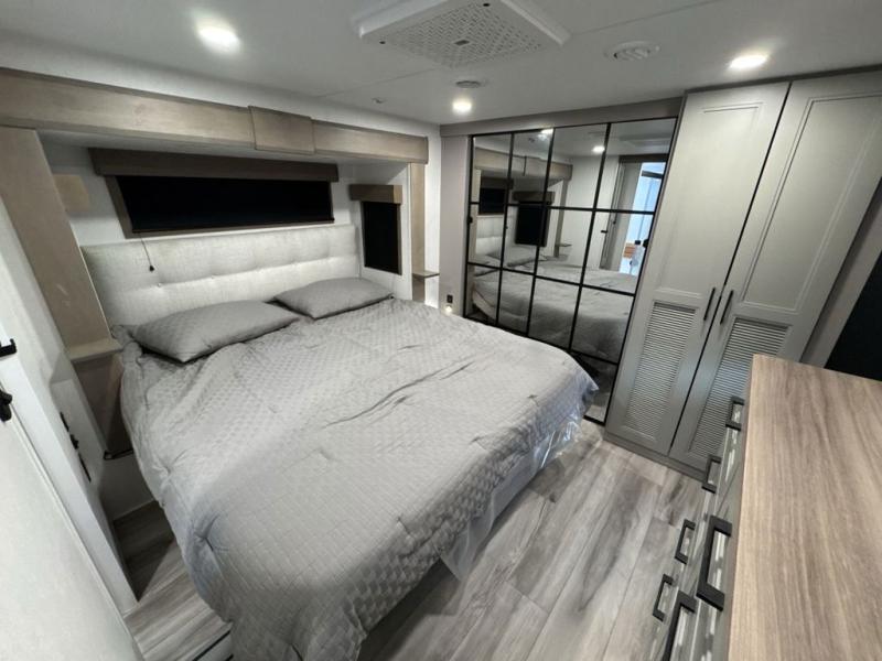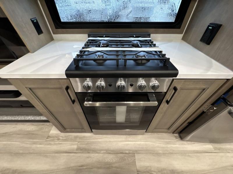 Start camping in luxury with this fifth wheel! The front private bedroom has a king bed slide which can be switched for an optional queen instead, a dresser, and a front wardrobe with washer and dryer prep. Start each morning feeling clean and fresh after showering in the 48" x 30" residential shower with a seat in the full bathroom. The kitchen has an island ideal for enjoying your morning coffee while reading the newspaper and socializing with the chef whipping up some scrambled eggs on the four burner range. The hutch can store your dishes, the pantry can store your canned goods, and the 18 cu. ft. refrigerator will keep your perishables fresh. If mother nature is raining on your parade then read a book on the rear hide-a-bed sofa or relax in the theater seating which has USB charging. And the entertainment center with a fireplace and 43" smart LED TV will keep you entertained!