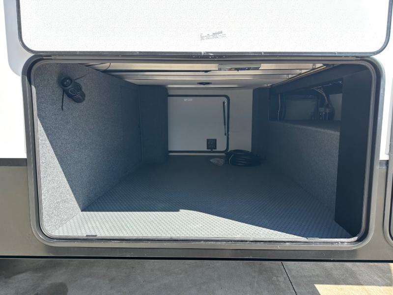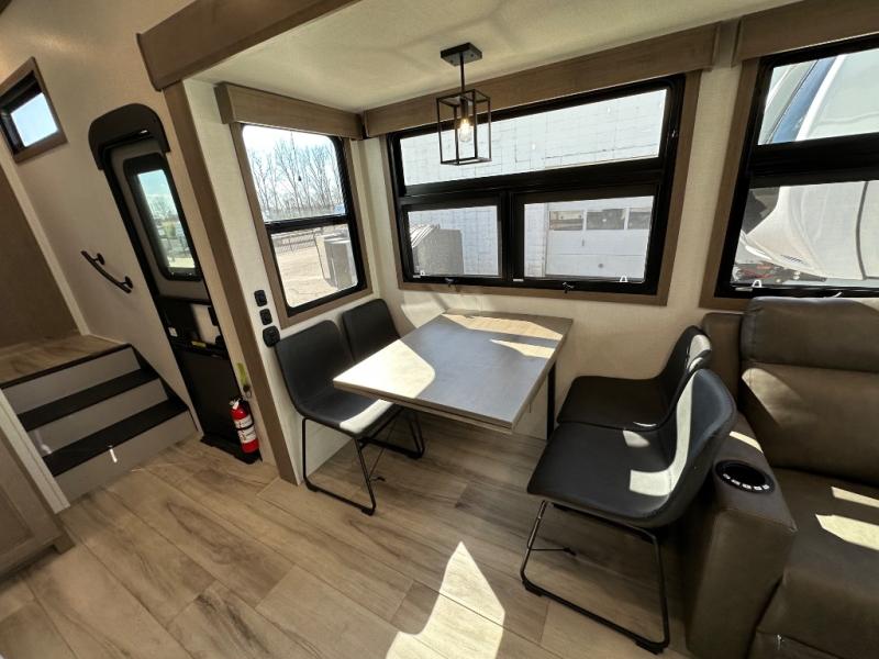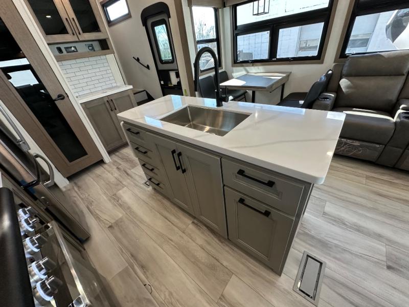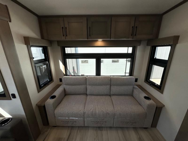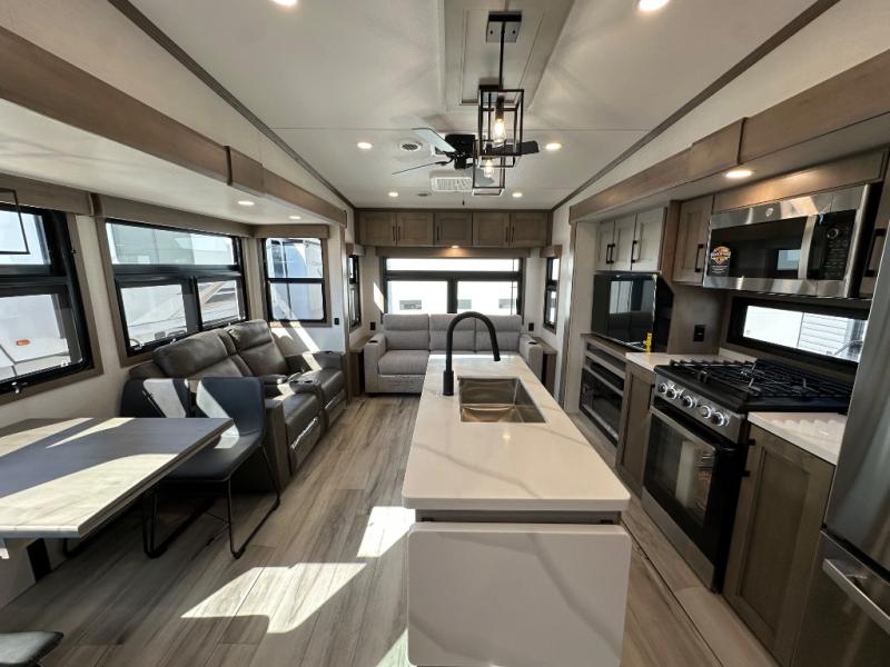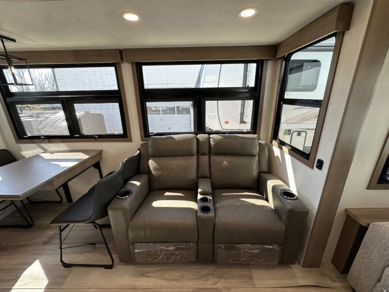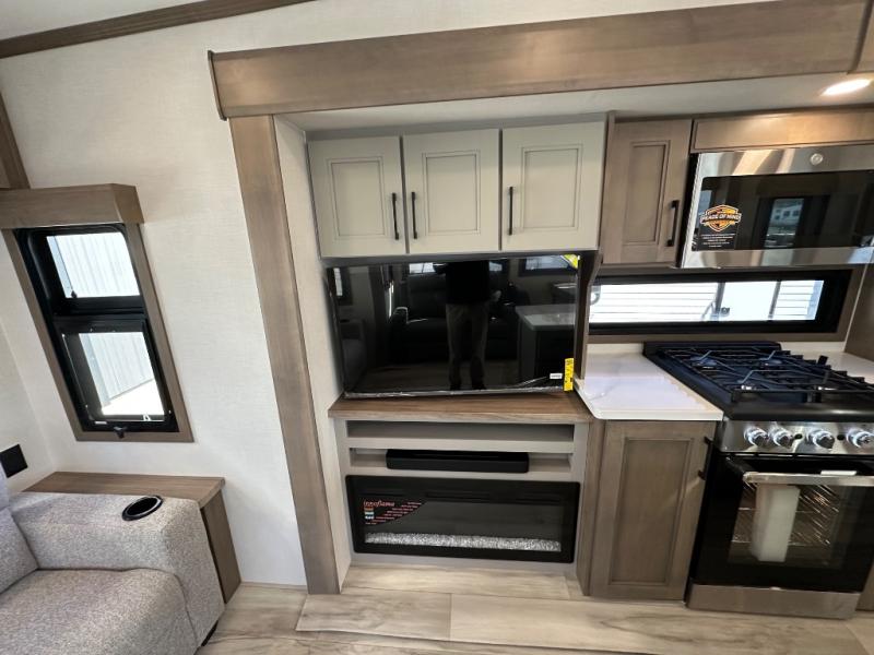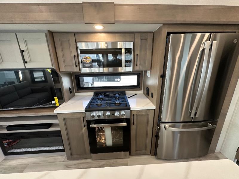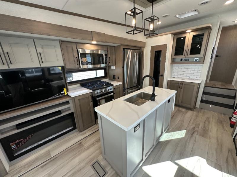 Start camping in luxury with this fifth wheel! The front private bedroom has a king bed slide which can be switched for an optional queen instead, a dresser, and a front wardrobe with washer and dryer prep. Start each morning feeling clean and fresh after showering in the 48" x 30" residential shower with a seat in the full bathroom. The kitchen has an island ideal for enjoying your morning coffee while reading the newspaper and socializing with the chef whipping up some scrambled eggs on the four burner range. The hutch can store your dishes, the pantry can store your canned goods, and the 18 cu. ft. refrigerator will keep your perishables fresh. If mother nature is raining on your parade then read a book on the rear hide-a-bed sofa or relax in the theater seating which has USB charging. And the entertainment center with a fireplace and 43" smart LED TV will keep you entertained!