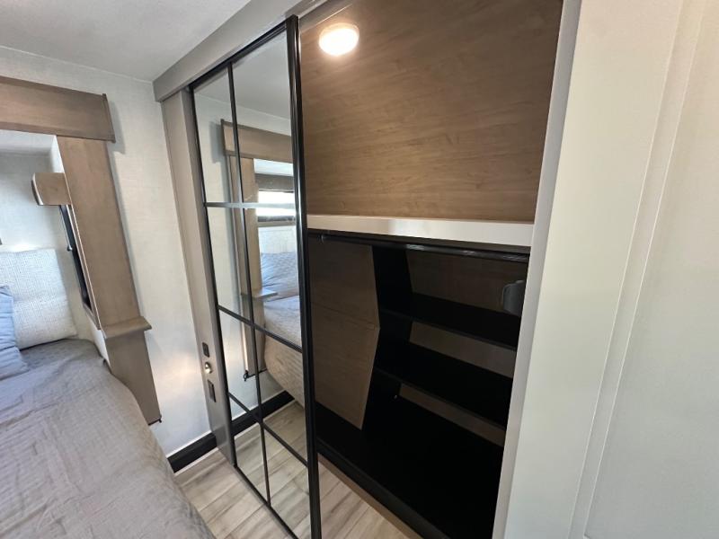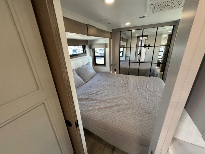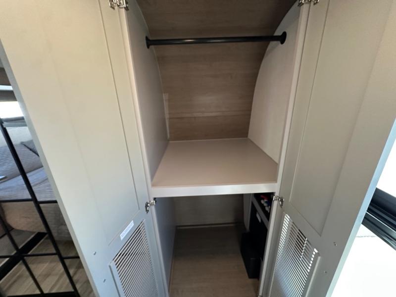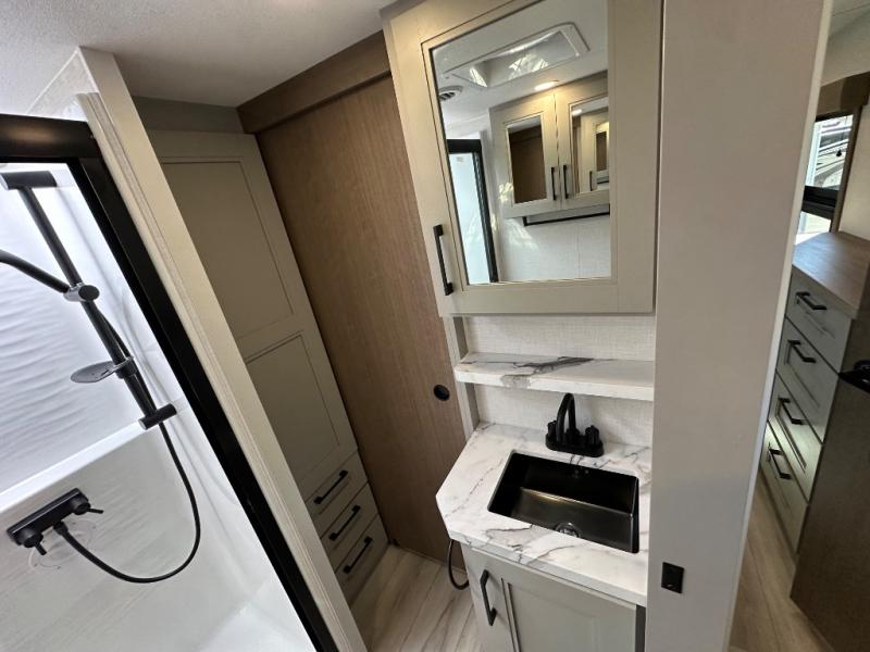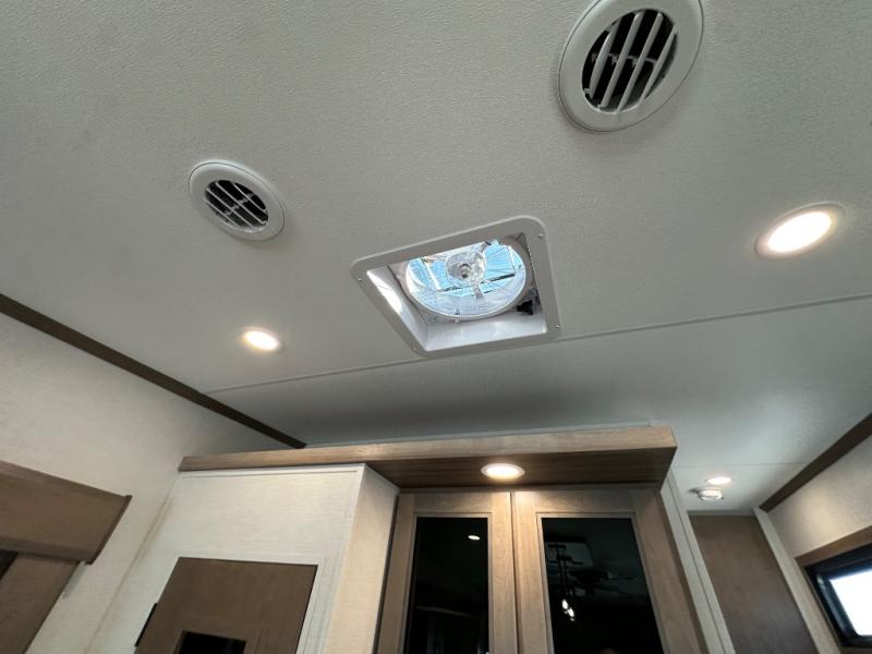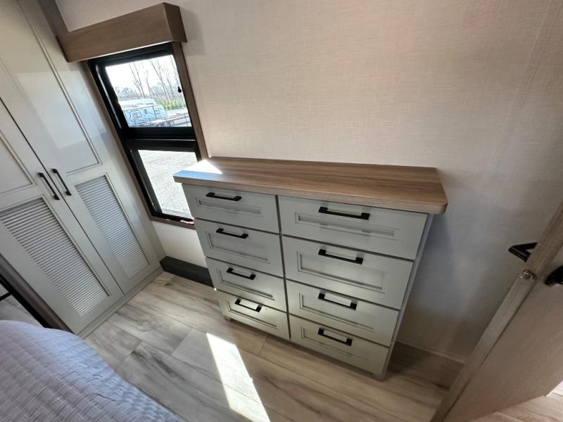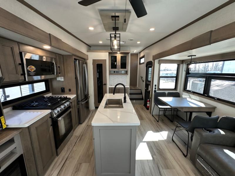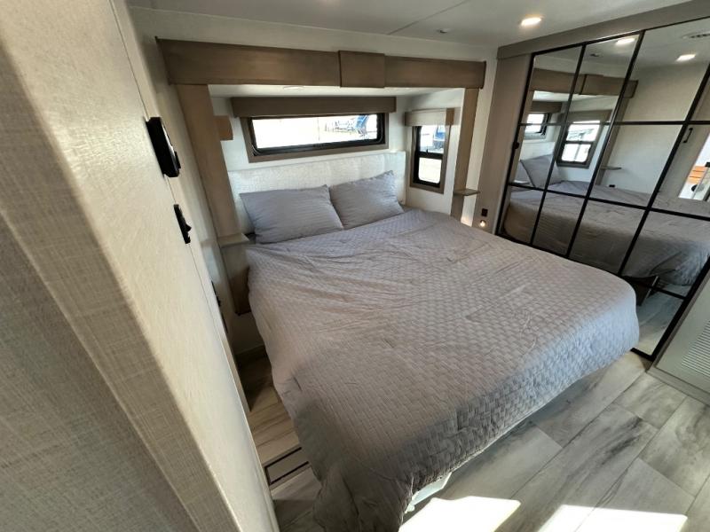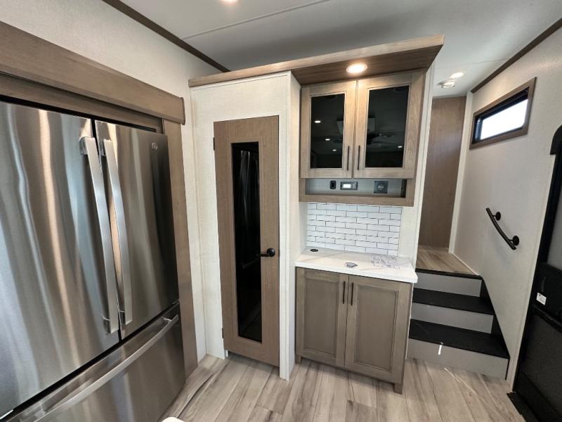 Start camping in luxury with this fifth wheel! The front private bedroom has a king bed slide which can be switched for an optional queen instead, a dresser, and a front wardrobe with washer and dryer prep. Start each morning feeling clean and fresh after showering in the 48" x 30" residential shower with a seat in the full bathroom. The kitchen has an island ideal for enjoying your morning coffee while reading the newspaper and socializing with the chef whipping up some scrambled eggs on the four burner range. The hutch can store your dishes, the pantry can store your canned goods, and the 18 cu. ft. refrigerator will keep your perishables fresh. If mother nature is raining on your parade then read a book on the rear hide-a-bed sofa or relax in the theater seating which has USB charging. And the entertainment center with a fireplace and 43" smart LED TV will keep you entertained!