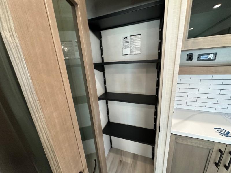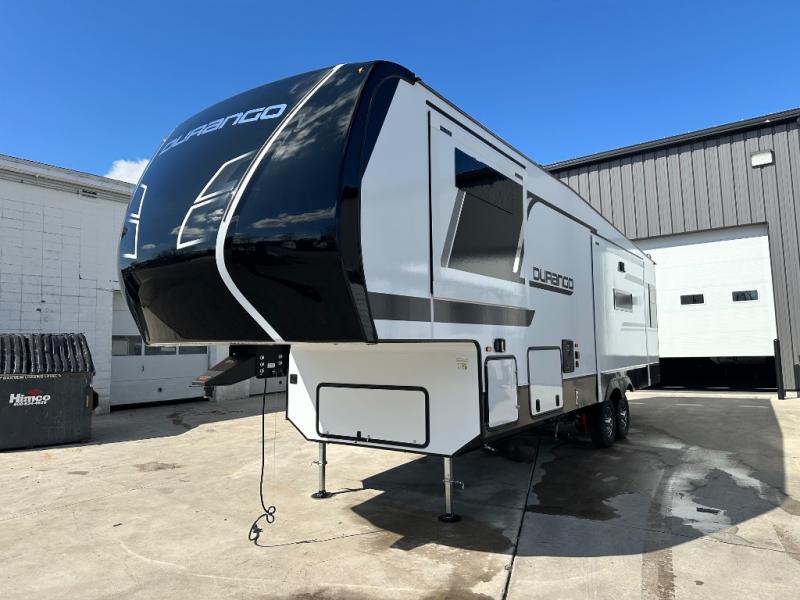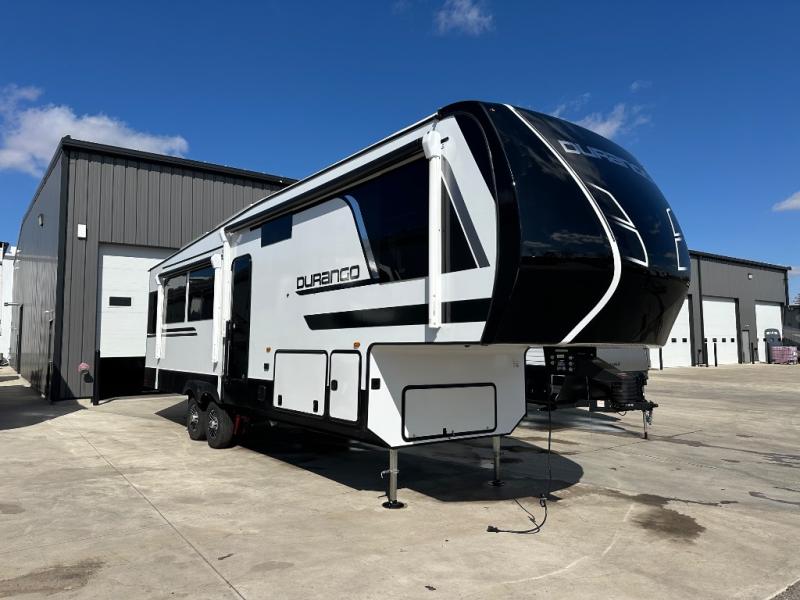 Enjoy full time living, an affordable price, and a wide body construction for more living space with every one of these KZ Durango light high-profile fifth wheels! These luxury units can be used all year round with the all-weather insulation package, the 3" x 14" foam-core in-floor straight-line heating system with a 35,000 BTU furnace, and the 15,000 BTU ducted roof A/C which optimizes the airflow by an average of 40% for better performance, cooling time, and reduction of noise. A few other construction features you will appreciate include a one piece, seamless walk-on Tufflex roofing material, Pex® in-floor heated waterlines, and a Lamilux® gelcoat fiberglass exterior. Inside, blancher maple & morel fog cabinetry , a king size bed, and smart TVs will have you feeling like you never left home!