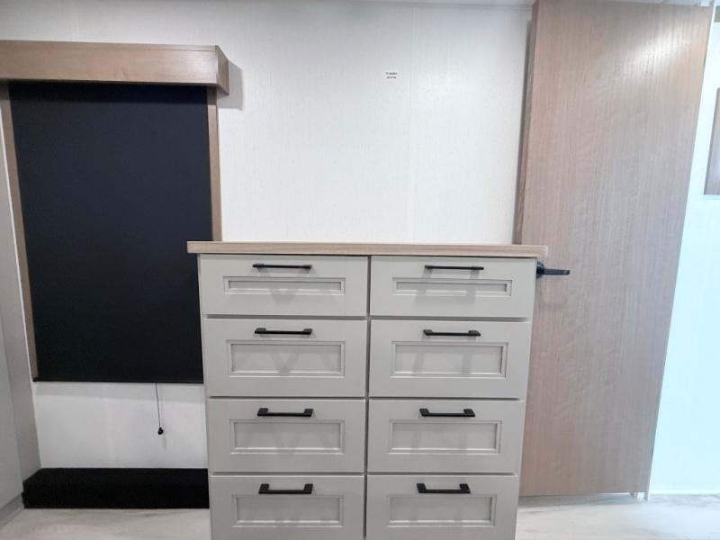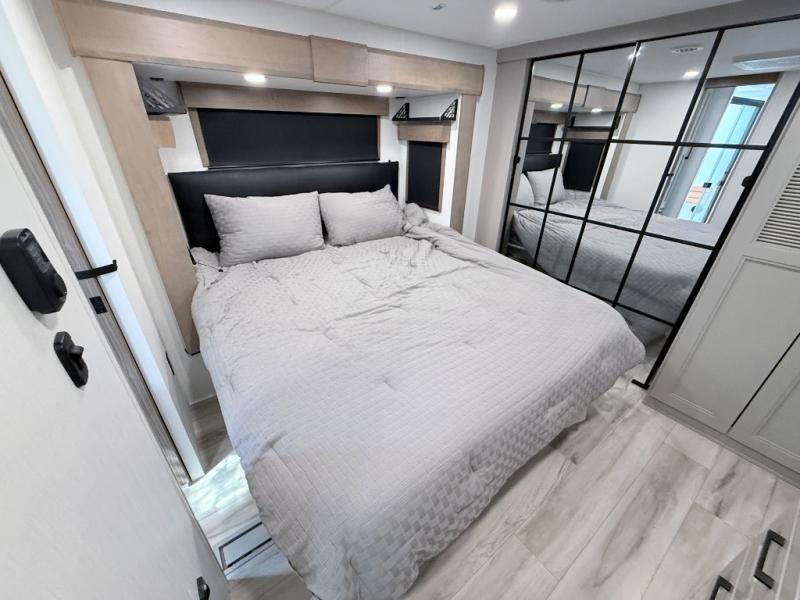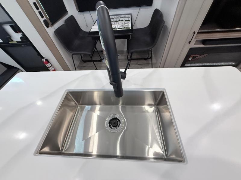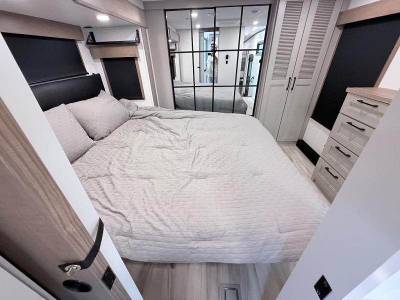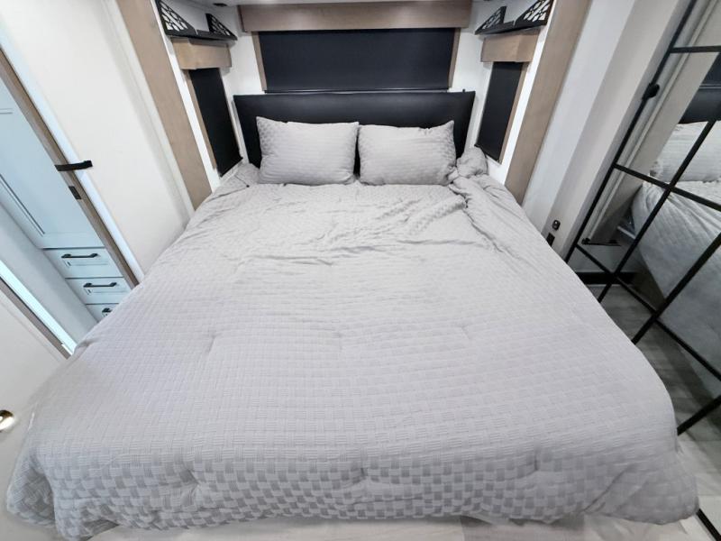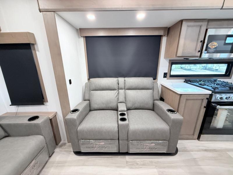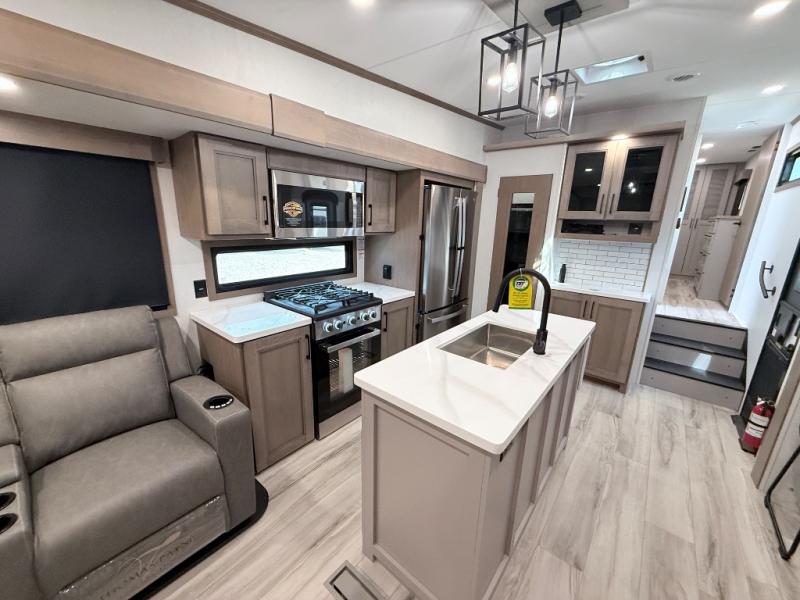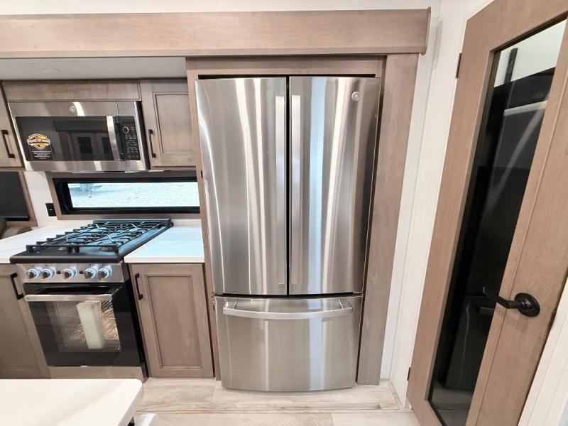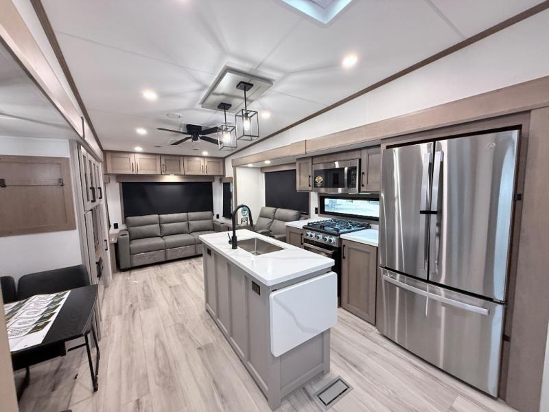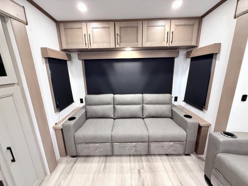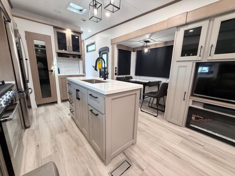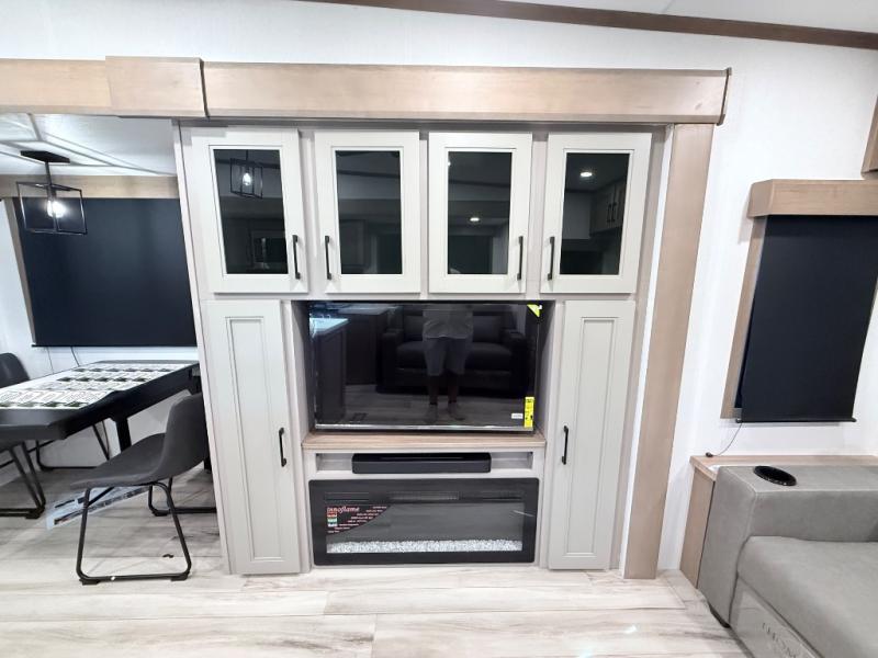 This travel trailer’s rear living area is a true showstopper, featuring a comfortable sofa, plush theater seating, and a large TV perfect for movie nights. The cozy fireplace adds warmth and ambiance, creating a relaxing atmosphere for all. The kitchen is a culinary dream, equipped with a four-burner cooktop, convection microwave, and ample counter space thanks to the kitchen island. The refrigerator keeps drinks and ingredients fresh, while the hutch and pantry provide plenty of storage for cookware and fine china. Additionally, the full bathroom is a serene oasis, complete with a linen closet for storing towels and other essentials. At the front of this unit, the bedroom is a luxurious retreat, boasting a spacious king-size bed, generous wardrobes, and a dresser for storing personal items. Plus, the outdoor kitchen is perfect for al fresco dining and entertaining.