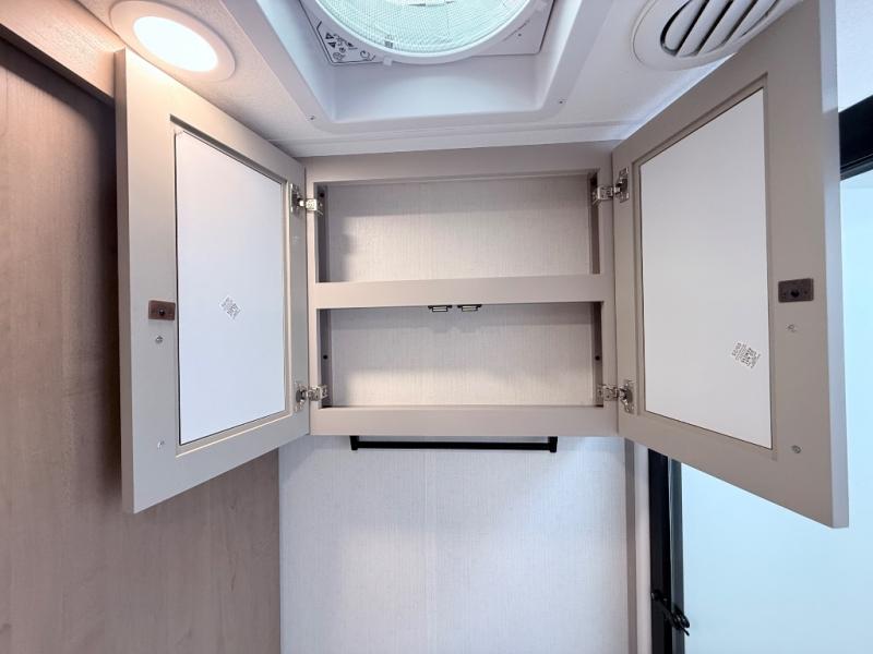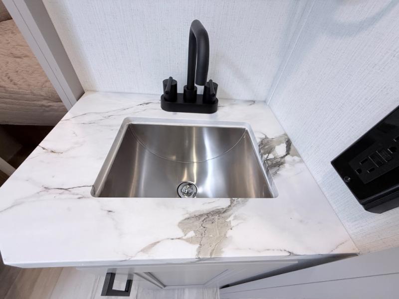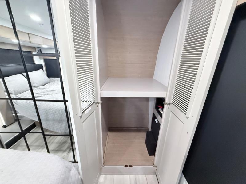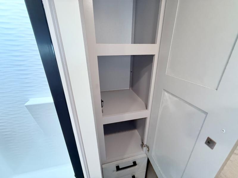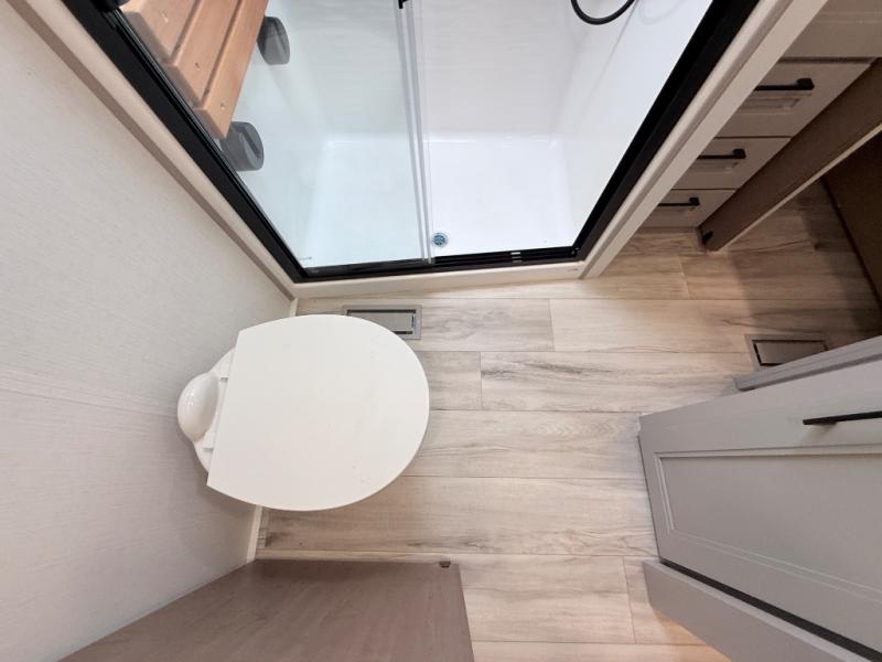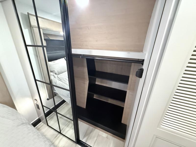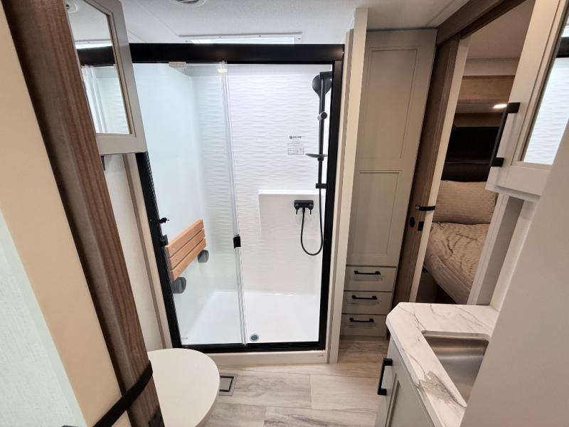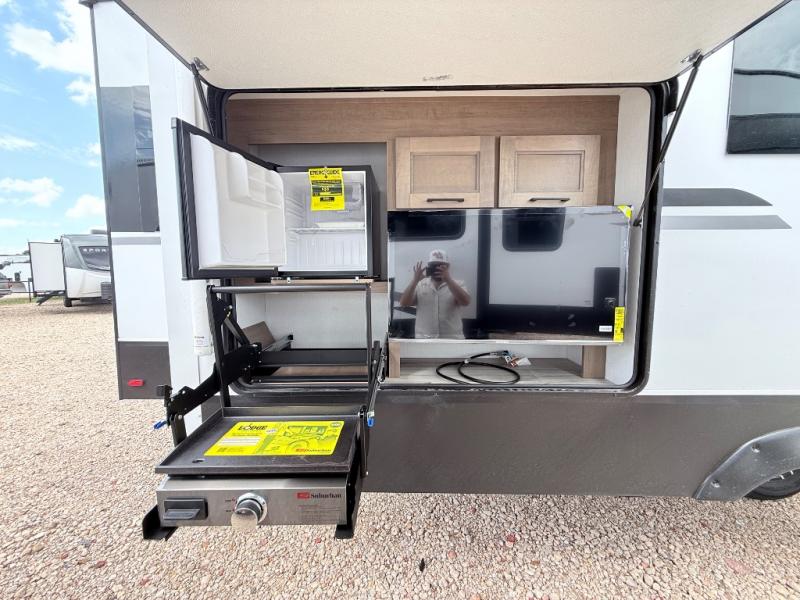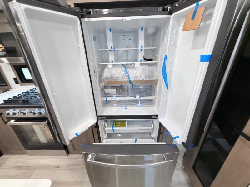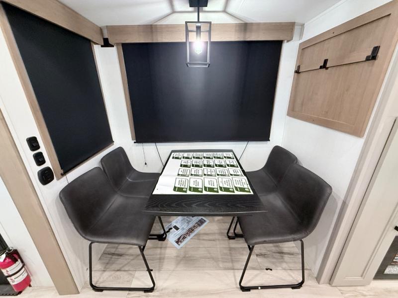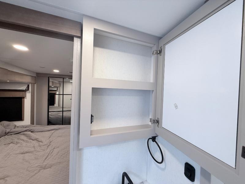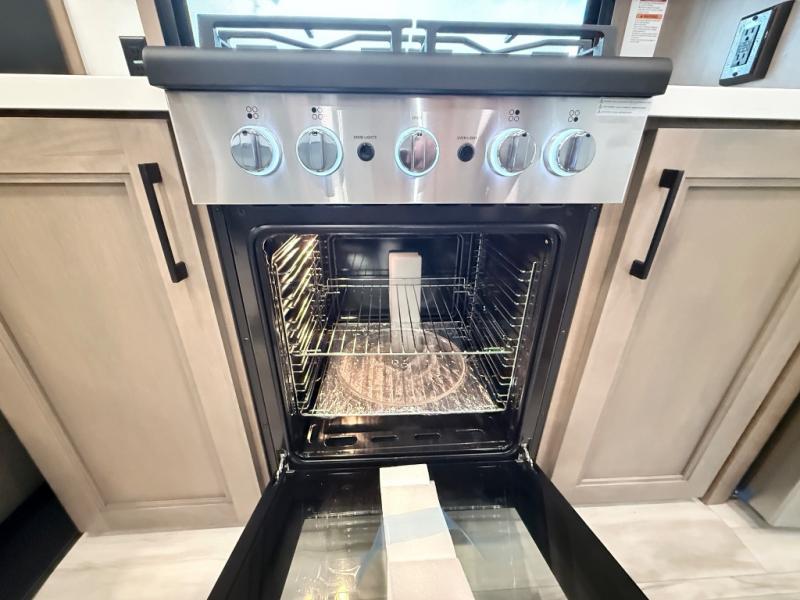 This travel trailer’s rear living area is a true showstopper, featuring a comfortable sofa, plush theater seating, and a large TV perfect for movie nights. The cozy fireplace adds warmth and ambiance, creating a relaxing atmosphere for all. The kitchen is a culinary dream, equipped with a four-burner cooktop, convection microwave, and ample counter space thanks to the kitchen island. The refrigerator keeps drinks and ingredients fresh, while the hutch and pantry provide plenty of storage for cookware and fine china. Additionally, the full bathroom is a serene oasis, complete with a linen closet for storing towels and other essentials. At the front of this unit, the bedroom is a luxurious retreat, boasting a spacious king-size bed, generous wardrobes, and a dresser for storing personal items. Plus, the outdoor kitchen is perfect for al fresco dining and entertaining.