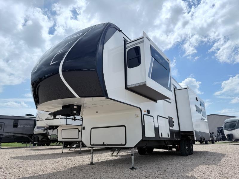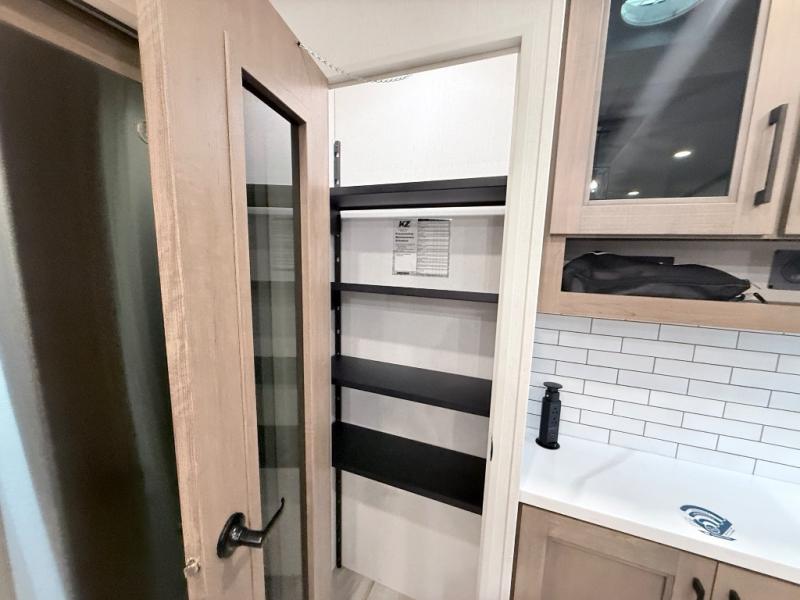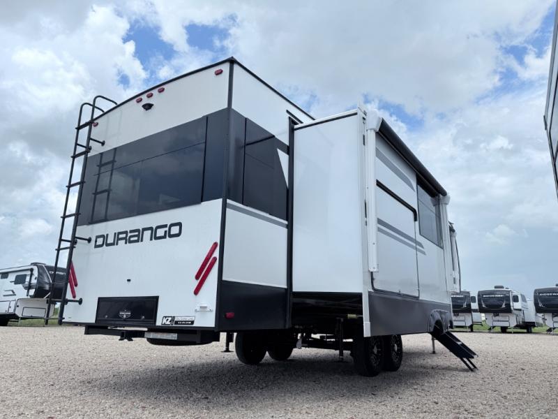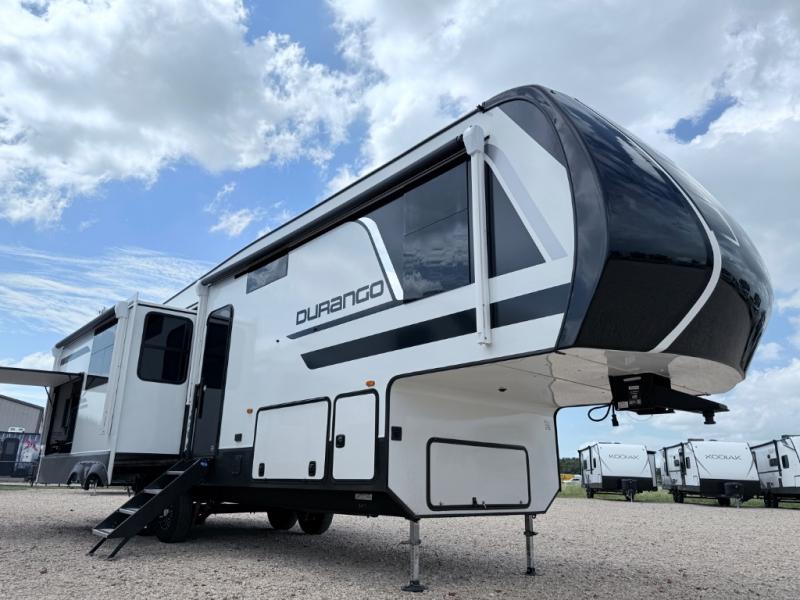 Enjoy full time living, an affordable price, and a wide body construction for more living space with every one of these KZ Durango light high-profile fifth wheels! These luxury units can be used all year round with the all-weather insulation package, the 3" x 14" foam-core in-floor straight-line heating system with a 35,000 BTU furnace, and the 15,000 BTU ducted roof A/C which optimizes the airflow by an average of 40% for better performance, cooling time, and reduction of noise. A few other construction features you will appreciate include a one piece, seamless walk-on Tufflex roofing material, Pex® in-floor heated waterlines, and a Lamilux® gelcoat fiberglass exterior. Inside, blancher maple & morel fog cabinetry , a king size bed, and smart TVs will have you feeling like you never left home!