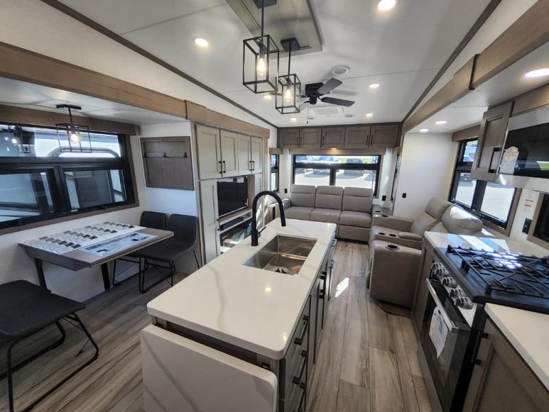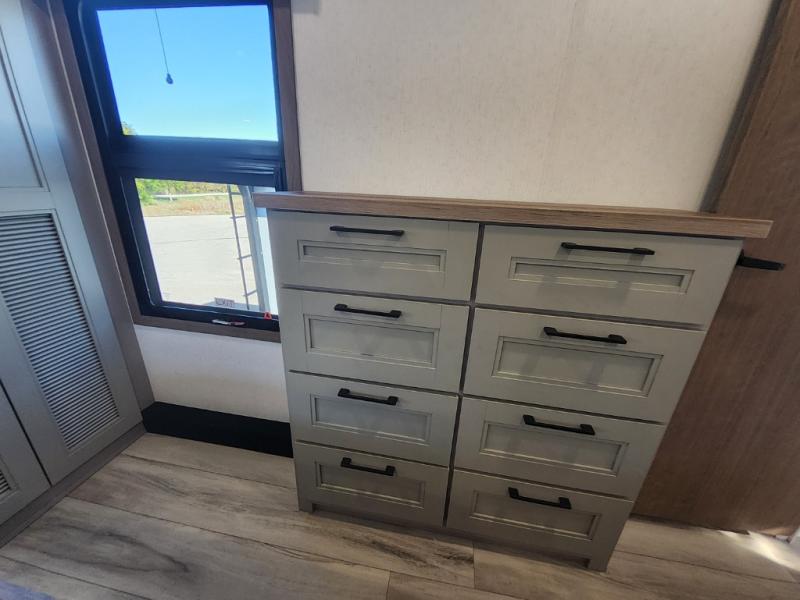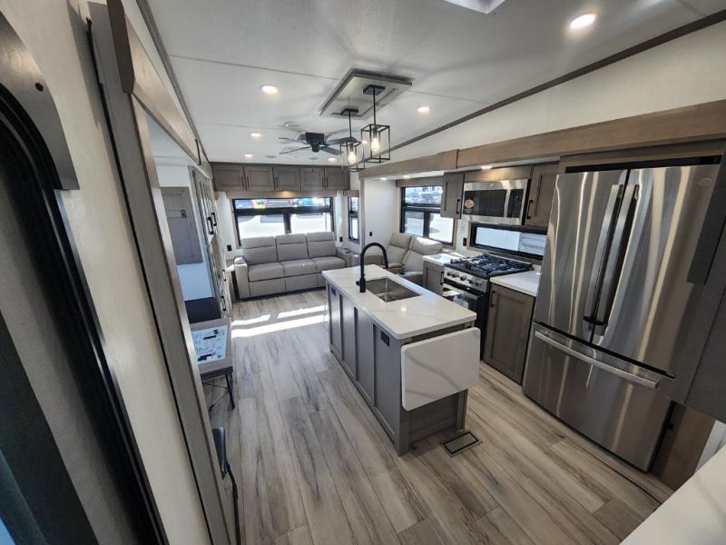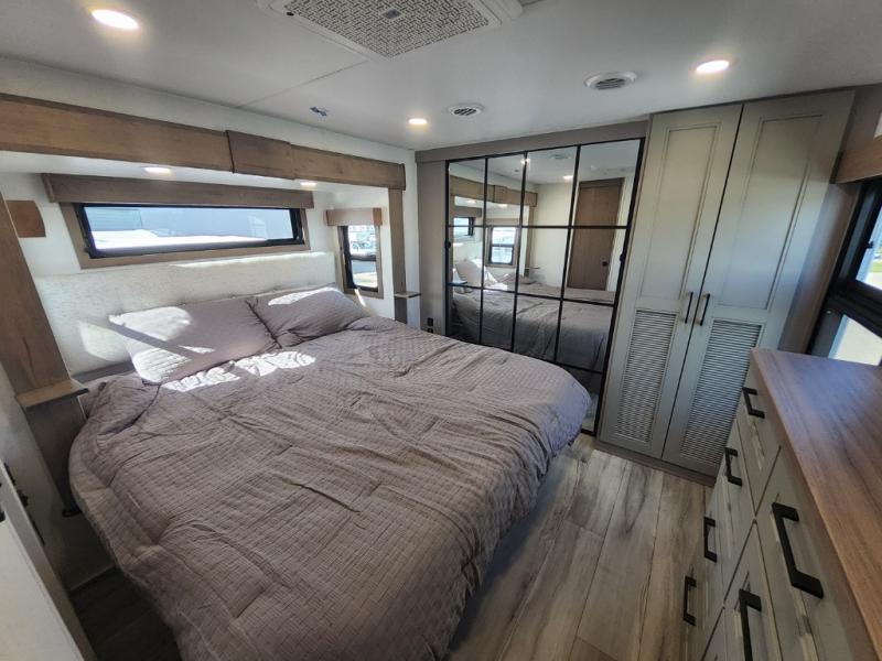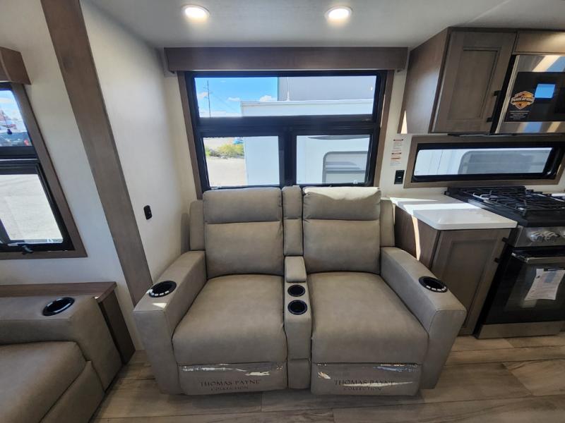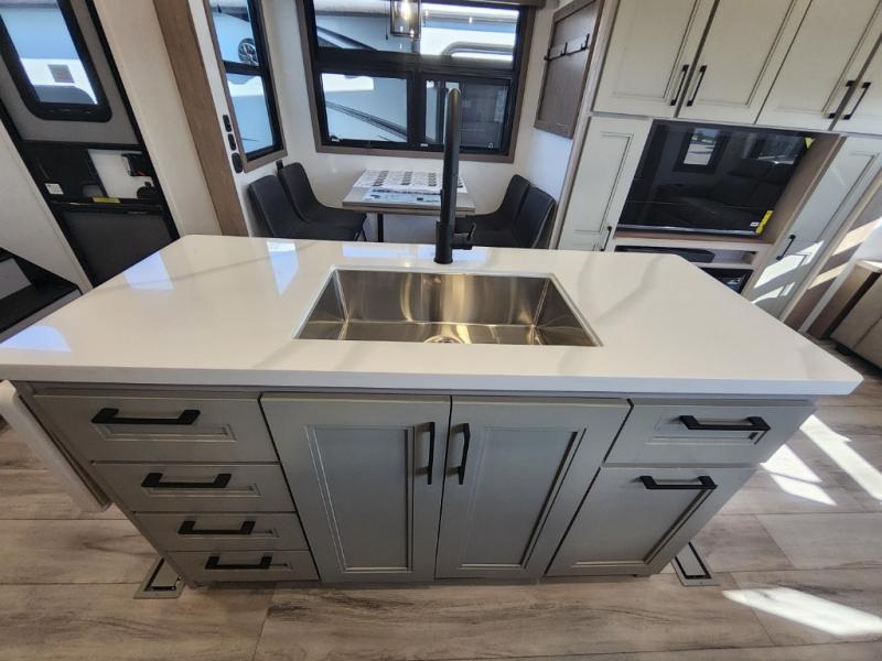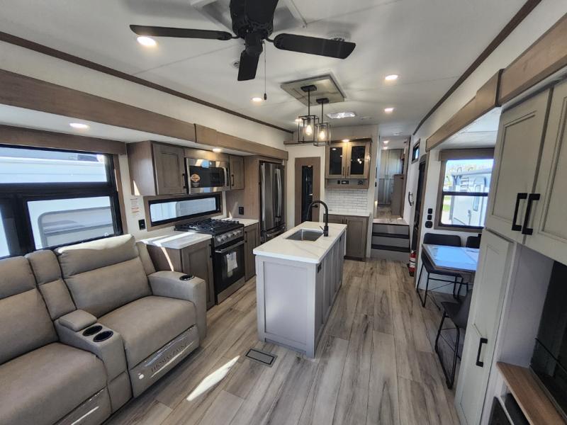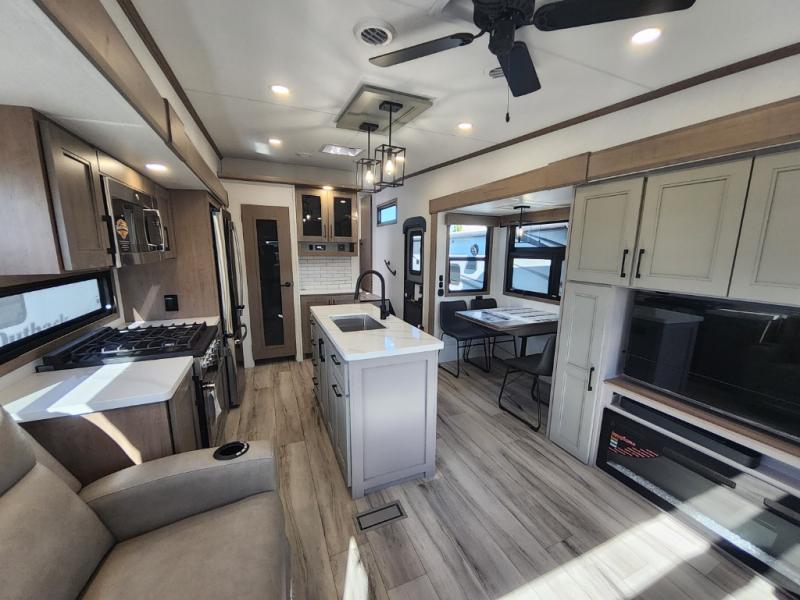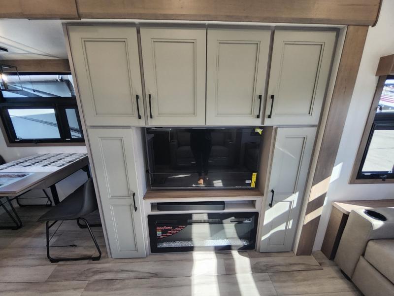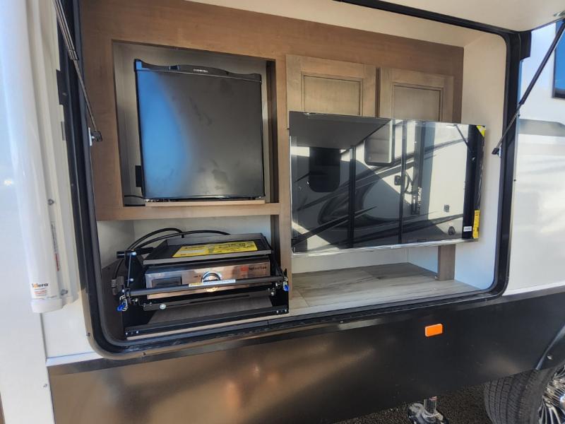This travel trailer’s rear living area is a true showstopper, featuring a comfortable sofa, plush theater seating, and a large TV perfect for movie nights. The cozy fireplace adds warmth and ambiance, creating a relaxing atmosphere for all. The kitchen is a culinary dream, equipped with a four-burner cooktop, convection microwave, and ample counter space thanks to the kitchen island. The refrigerator keeps drinks and ingredients fresh, while the hutch and pantry provide plenty of storage for cookware and fine china. Additionally, the full bathroom is a serene oasis, complete with a linen closet for storing towels and other essentials. At the front of this unit, the bedroom is a luxurious retreat, boasting a spacious king-size bed, generous wardrobes, and a dresser for storing personal items. Plus, the outdoor kitchen is perfect for al fresco dining and entertaining.