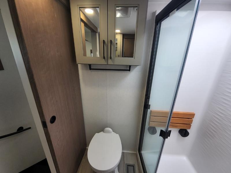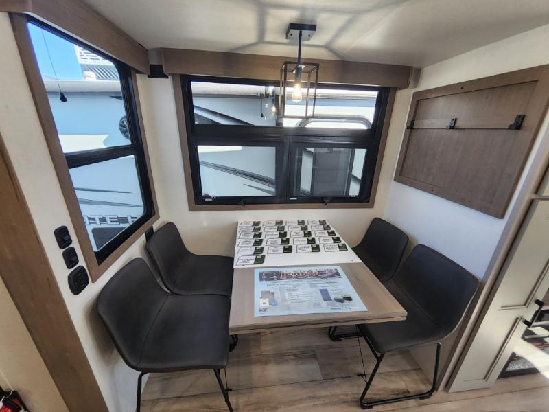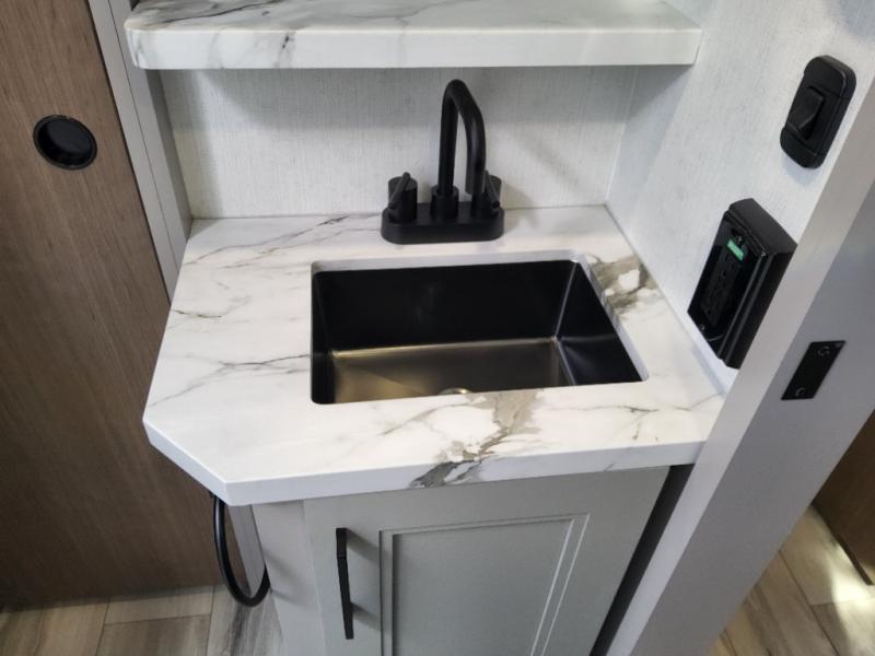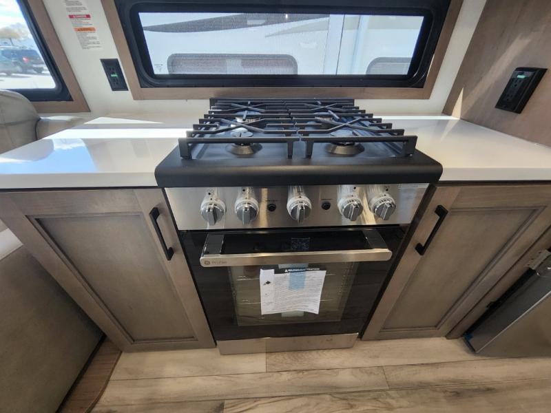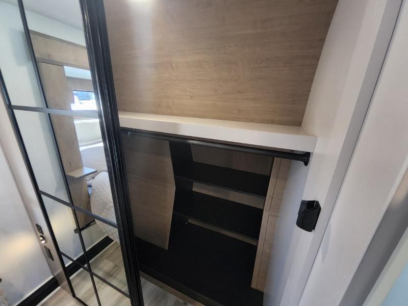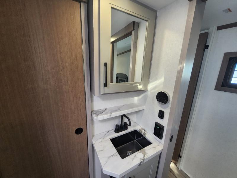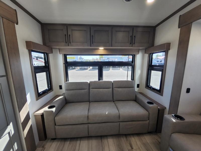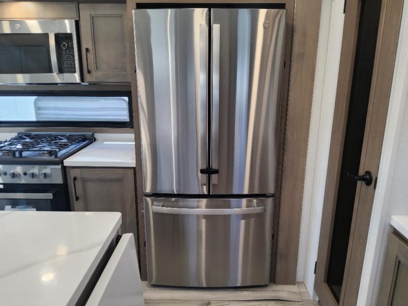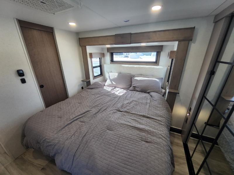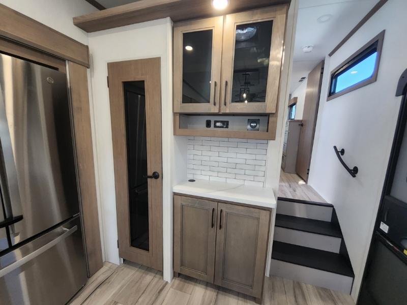 This travel trailer’s rear living area is a true showstopper, featuring a comfortable sofa, plush theater seating, and a large TV perfect for movie nights. The cozy fireplace adds warmth and ambiance, creating a relaxing atmosphere for all. The kitchen is a culinary dream, equipped with a four-burner cooktop, convection microwave, and ample counter space thanks to the kitchen island. The refrigerator keeps drinks and ingredients fresh, while the hutch and pantry provide plenty of storage for cookware and fine china. Additionally, the full bathroom is a serene oasis, complete with a linen closet for storing towels and other essentials. At the front of this unit, the bedroom is a luxurious retreat, boasting a spacious king-size bed, generous wardrobes, and a dresser for storing personal items. Plus, the outdoor kitchen is perfect for al fresco dining and entertaining.