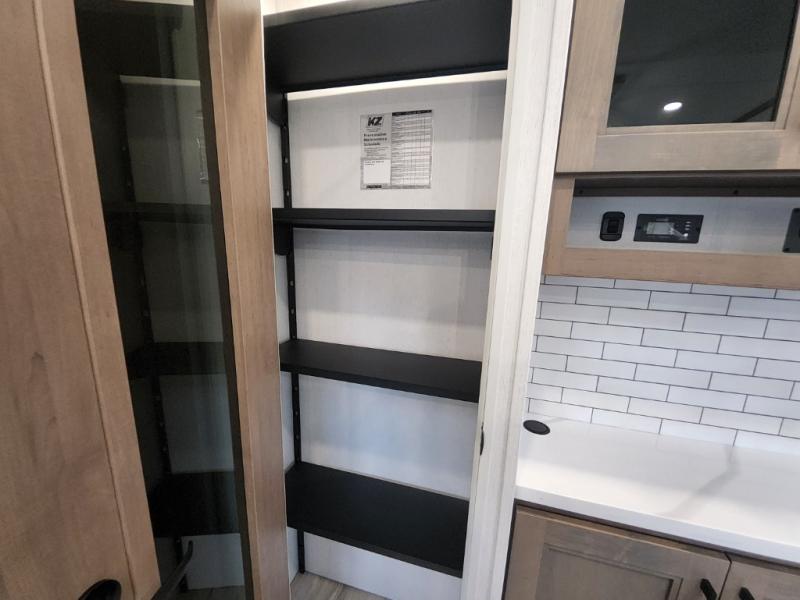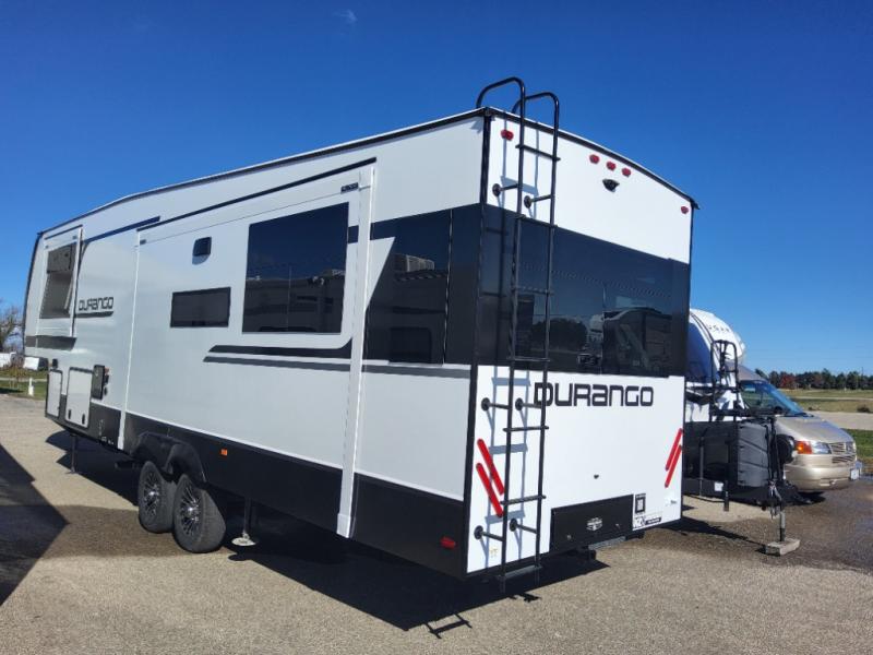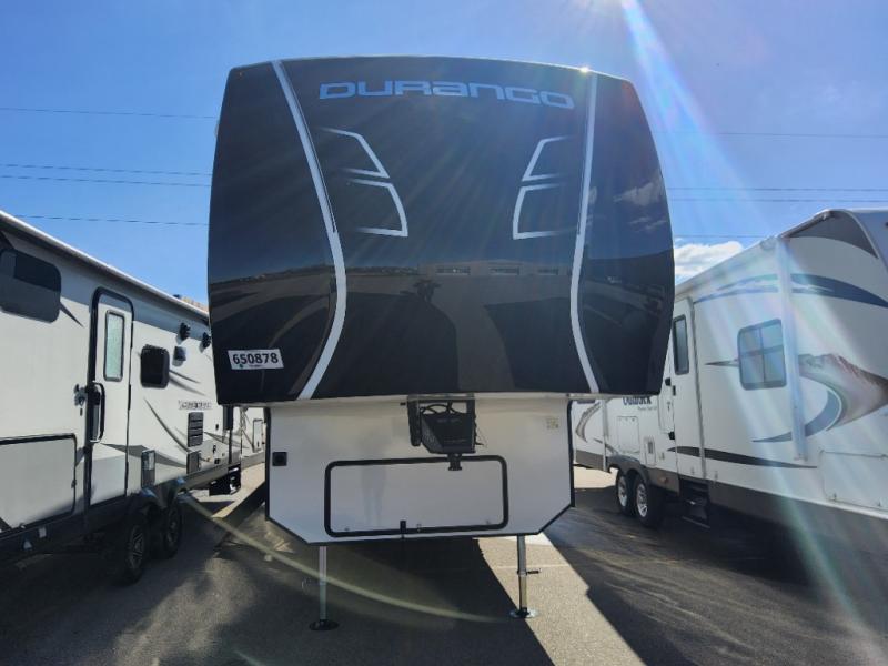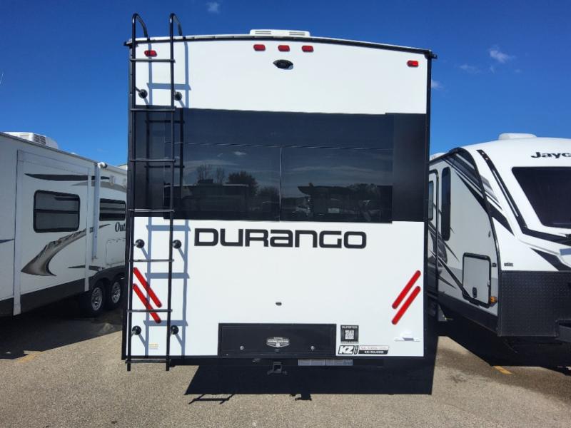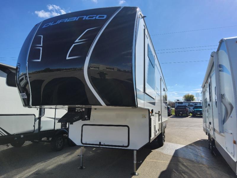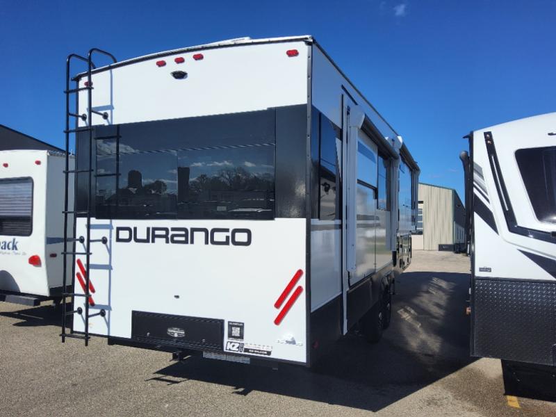 Enjoy full time living, an affordable price, and a wide body construction for more living space with every one of these KZ Durango light high-profile fifth wheels! These luxury units can be used all year round with the all-weather insulation package, the 3" x 14" foam-core in-floor straight-line heating system with a 35,000 BTU furnace, and the 15,000 BTU ducted roof A/C which optimizes the airflow by an average of 40% for better performance, cooling time, and reduction of noise. A few other construction features you will appreciate include a one piece, seamless walk-on Tufflex roofing material, Pex® in-floor heated waterlines, and a Lamilux® gelcoat fiberglass exterior. Inside, blancher maple & morel fog cabinetry , a king size bed, and smart TVs will have you feeling like you never left home!