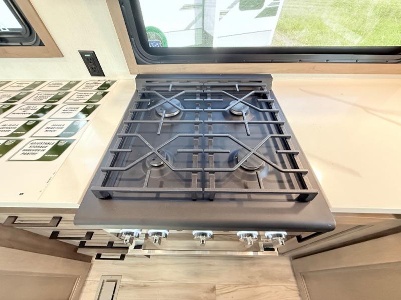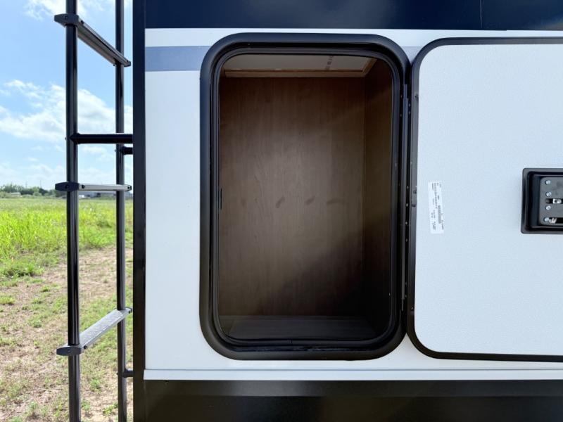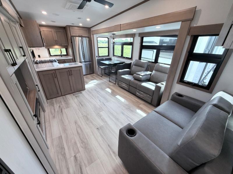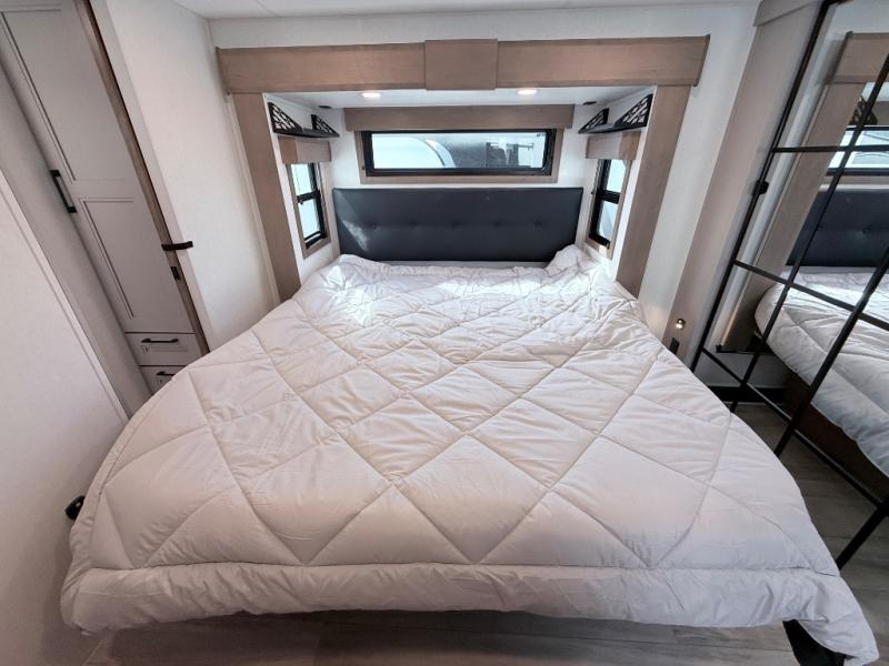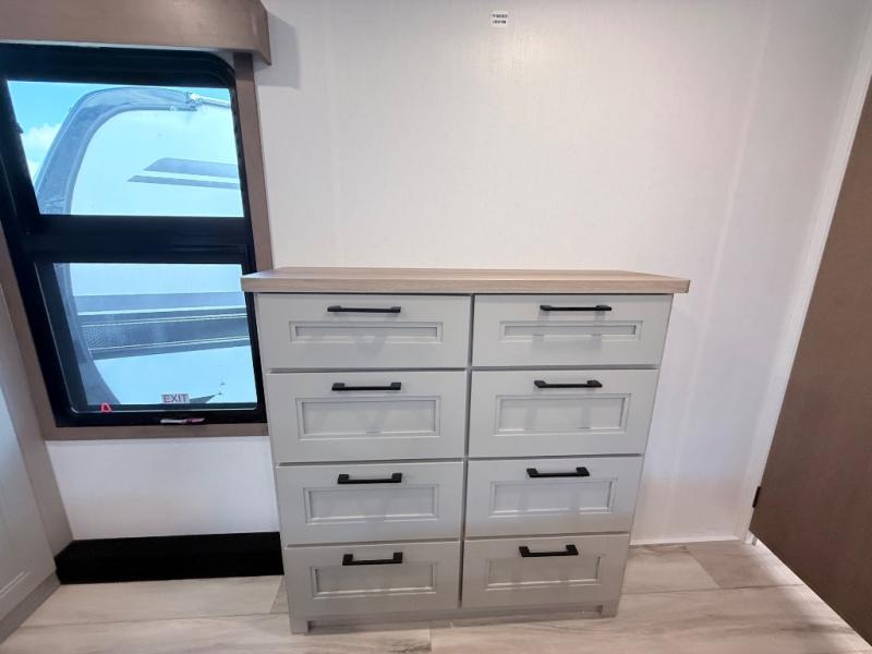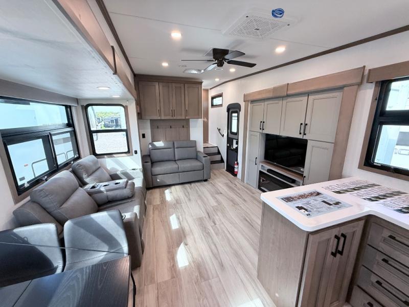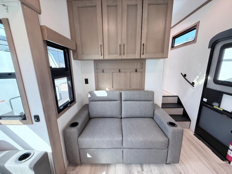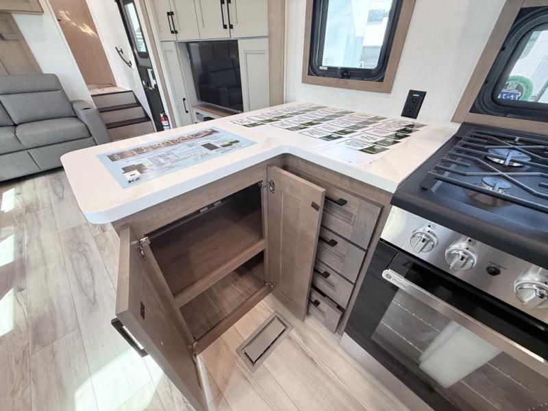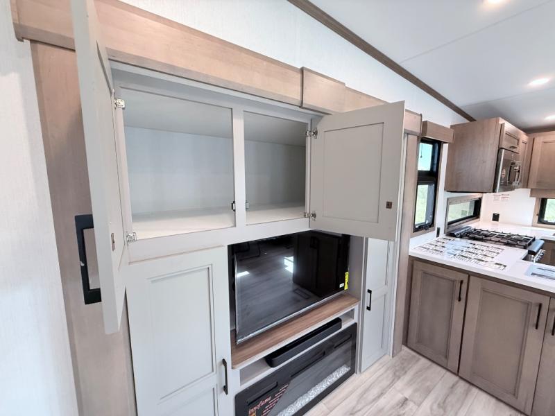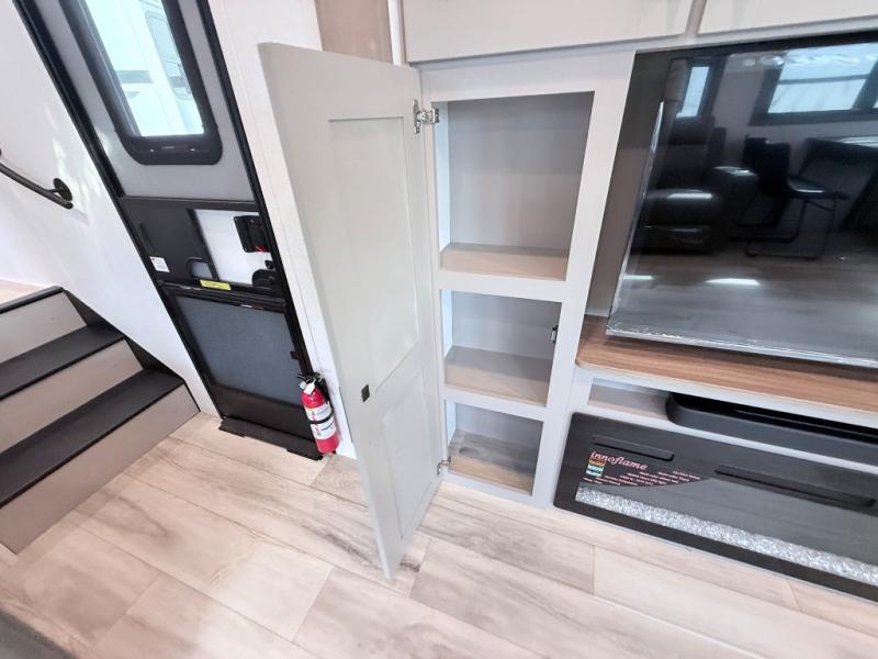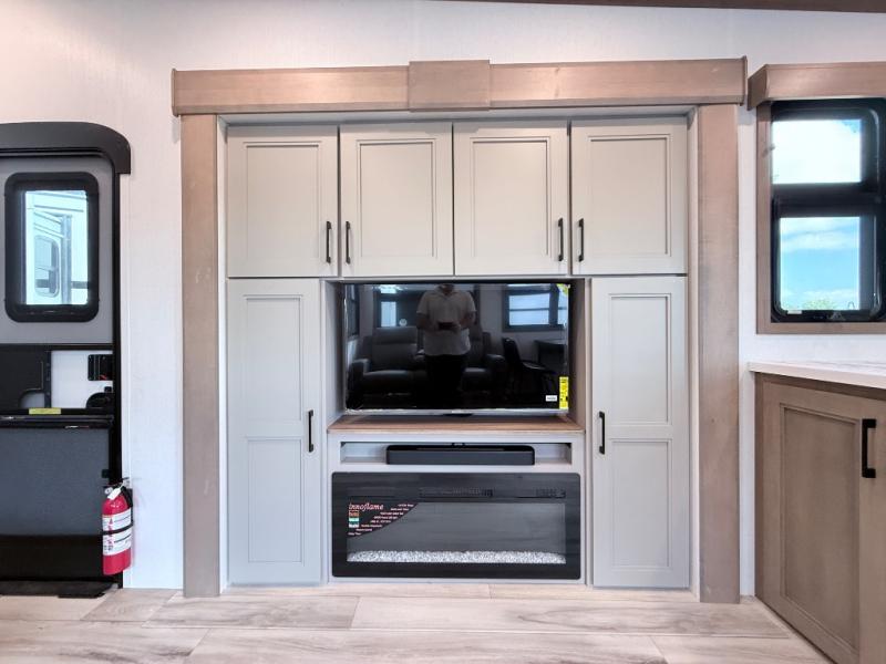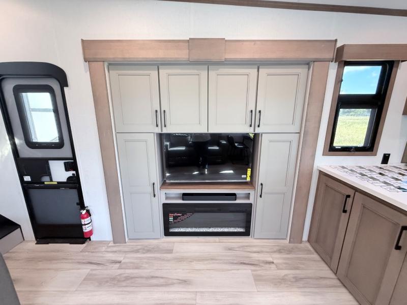 The chef will love cooking in the rear kitchen of this fifth wheel! They could even cook the catch of the day on the outside griddle while enjoying a cold beverage from the refrigerator, plus there is a smart TV at the outside kitchen. You can enjoy your meals at the table and chairs then lay down on the hide-a-bed sofa after stuffing yourself full. The theater seating with USB charging also offers a comfortable place to relax in front of the 40" fireplace at the entertainment center. Freshen up each morning in the full bathroom with the 48" x 30" residential shower with a seat and easily grab your towel from the linen closet next to it. When you're ready to wind down your nights, head to the front private bedroom to change into your pajamas stored in the dresser or from the front wardrobe with washer and dryer prep. There is also a king bed slide out or you can choose the optional queen bed if you want more floor space.