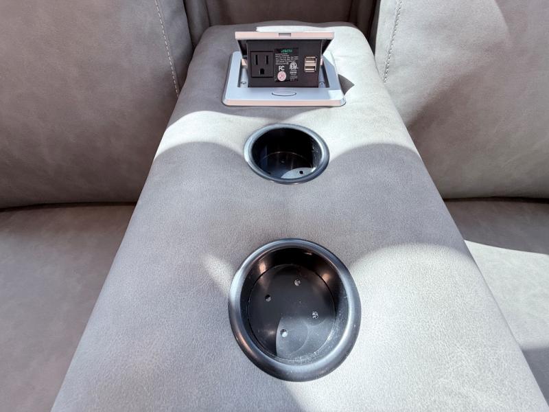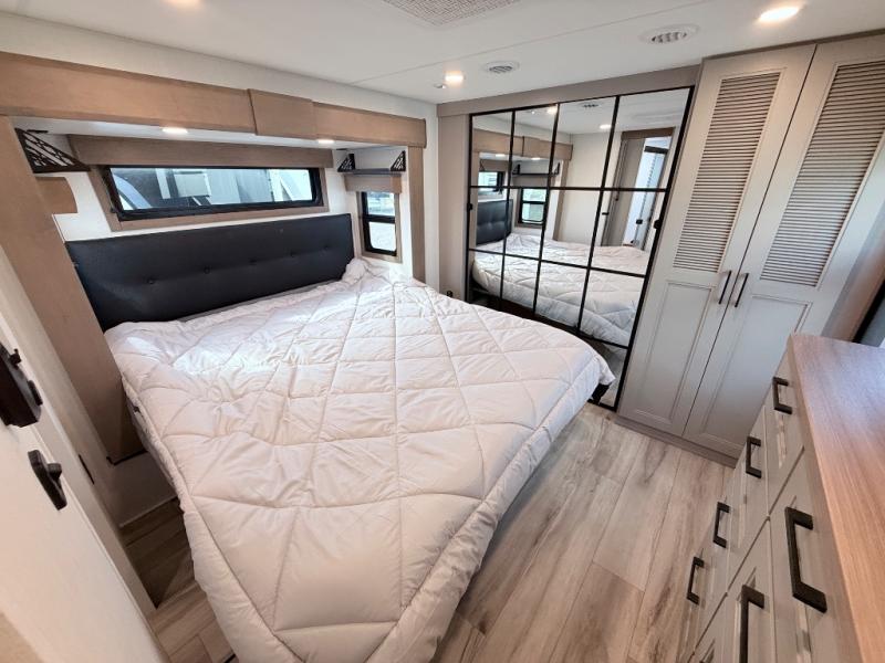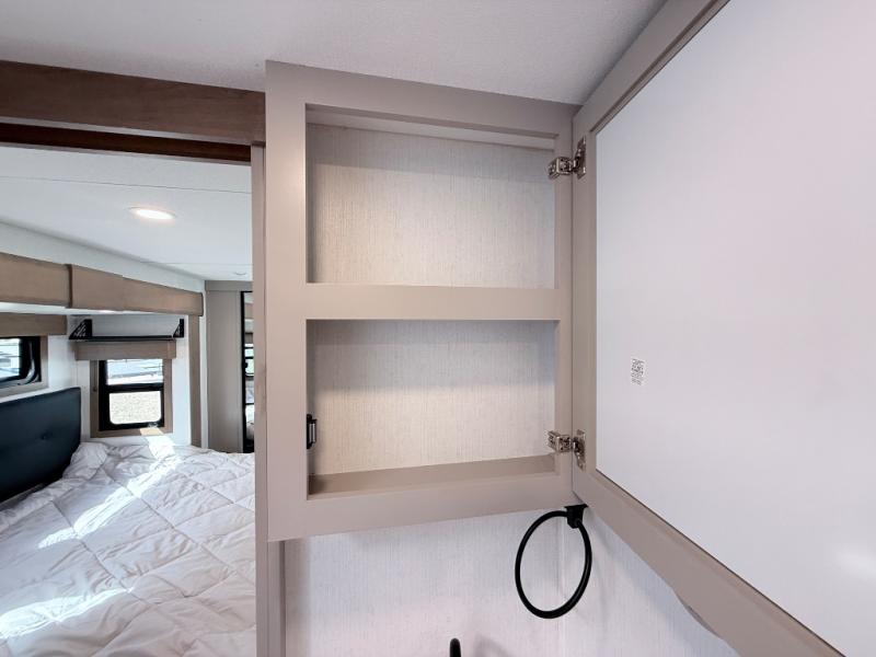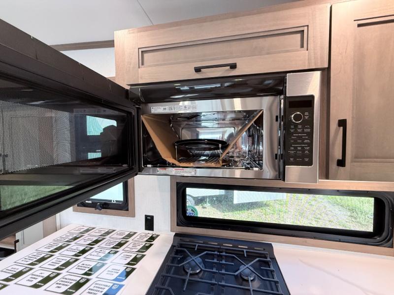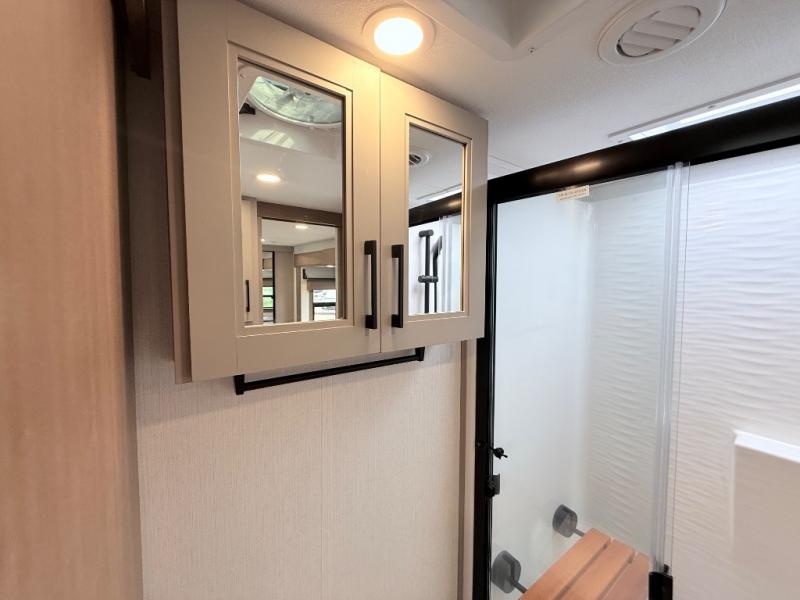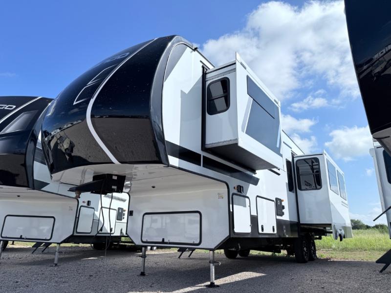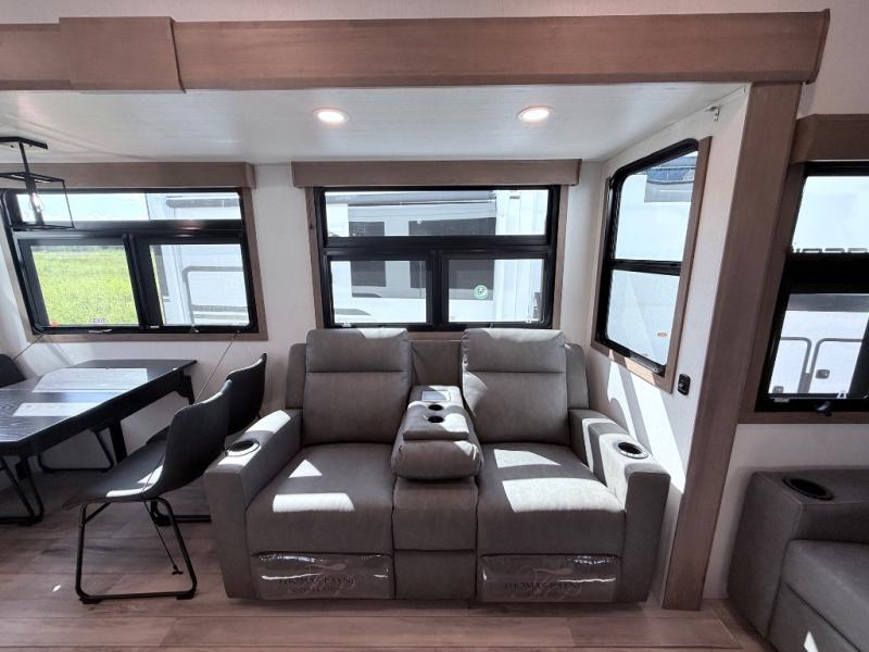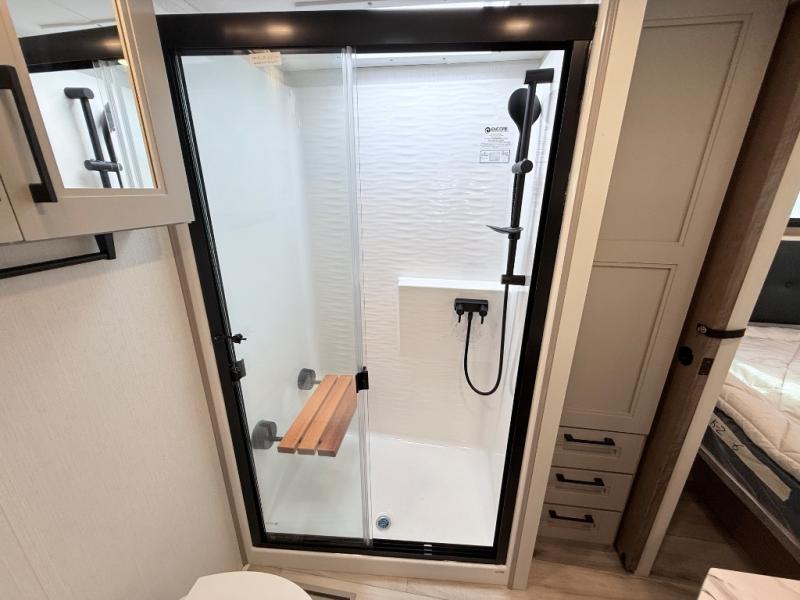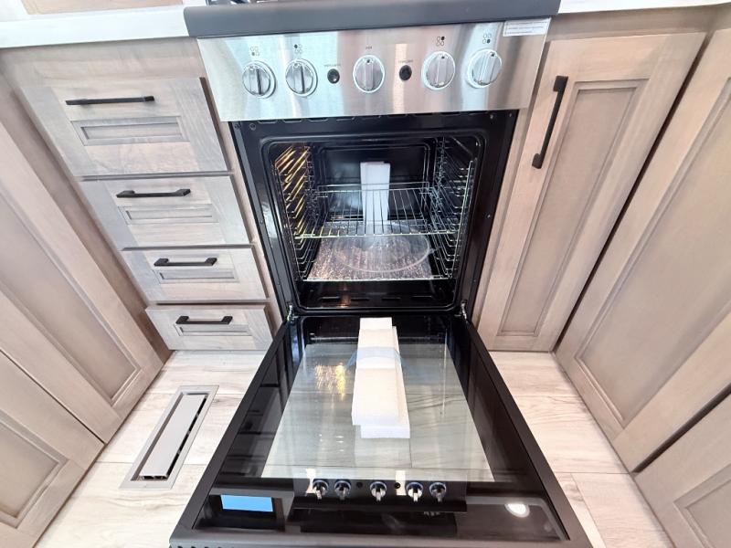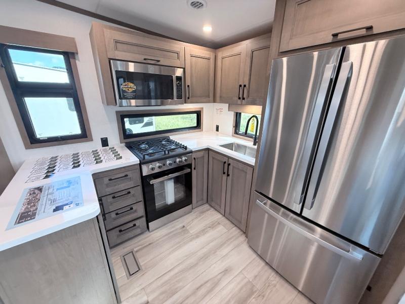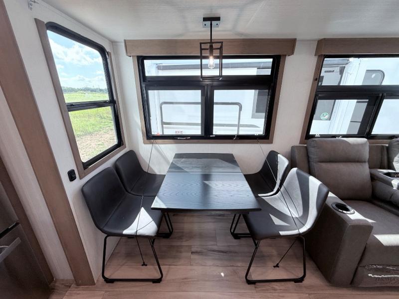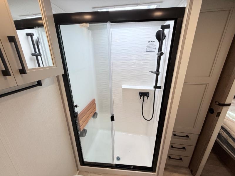 The chef will love cooking in the rear kitchen of this fifth wheel! They could even cook the catch of the day on the outside griddle while enjoying a cold beverage from the refrigerator, plus there is a smart TV at the outside kitchen. You can enjoy your meals at the table and chairs then lay down on the hide-a-bed sofa after stuffing yourself full. The theater seating with USB charging also offers a comfortable place to relax in front of the 40" fireplace at the entertainment center. Freshen up each morning in the full bathroom with the 48" x 30" residential shower with a seat and easily grab your towel from the linen closet next to it. When you're ready to wind down your nights, head to the front private bedroom to change into your pajamas stored in the dresser or from the front wardrobe with washer and dryer prep. There is also a king bed slide out or you can choose the optional queen bed if you want more floor space.