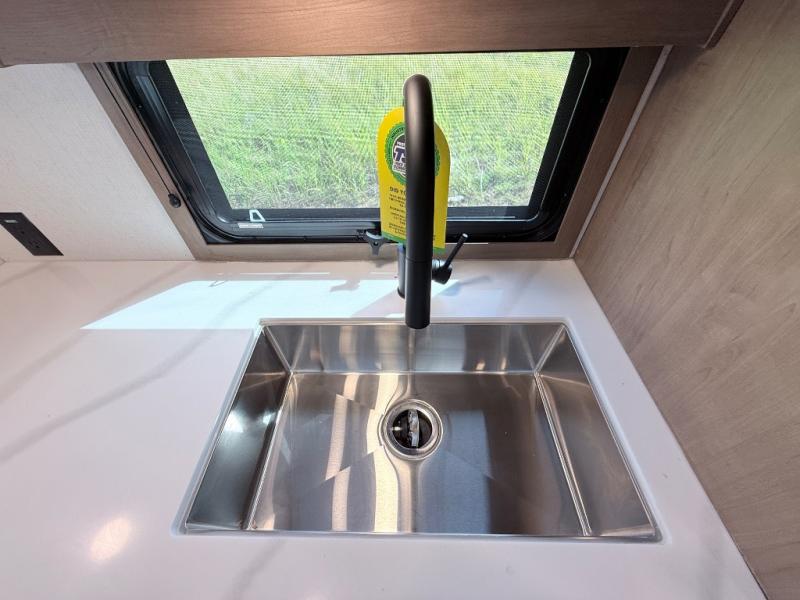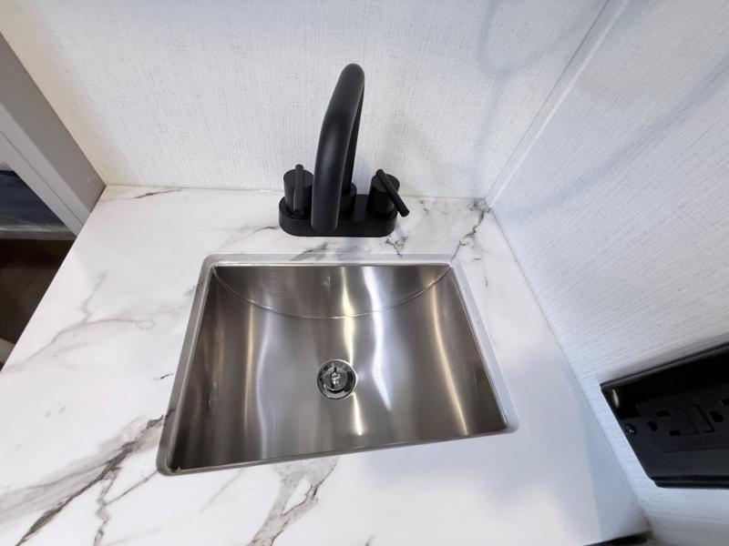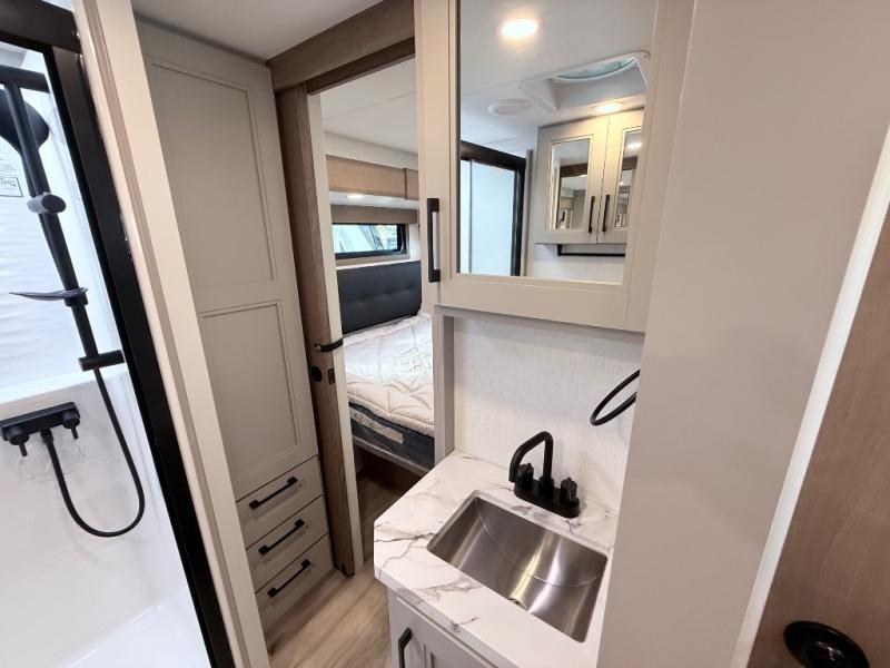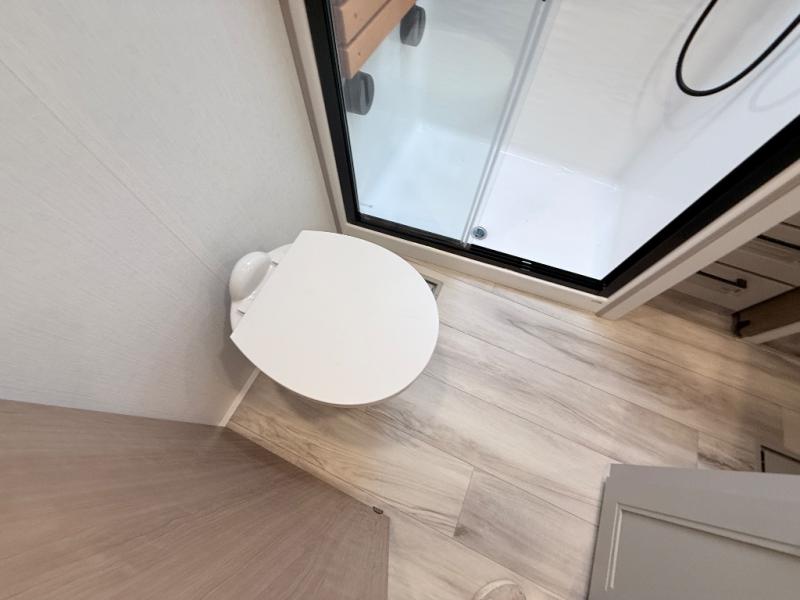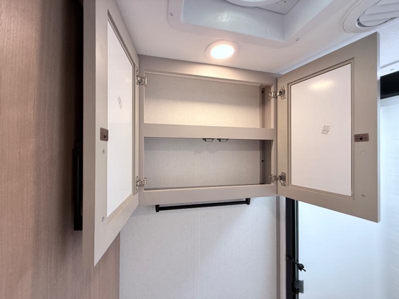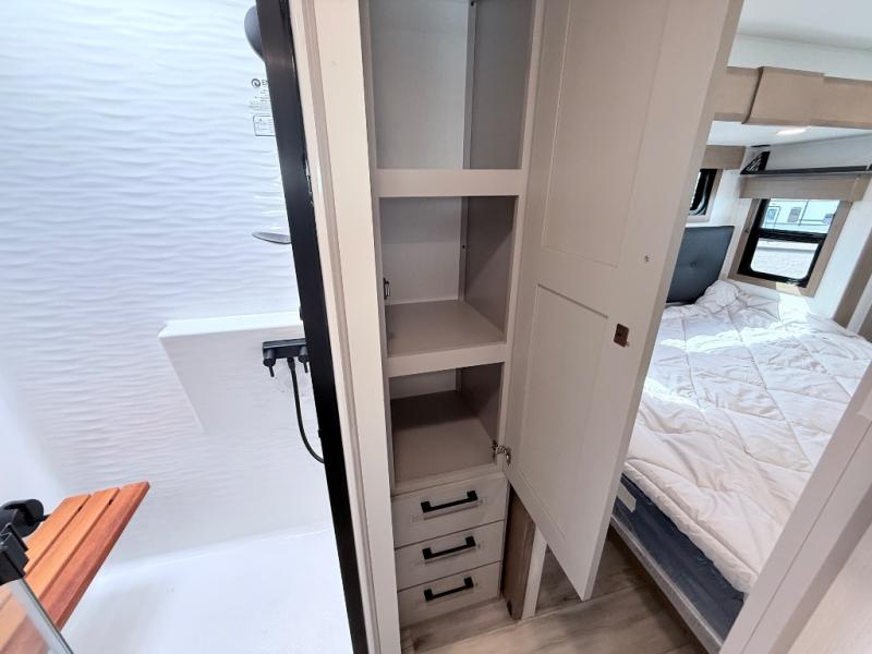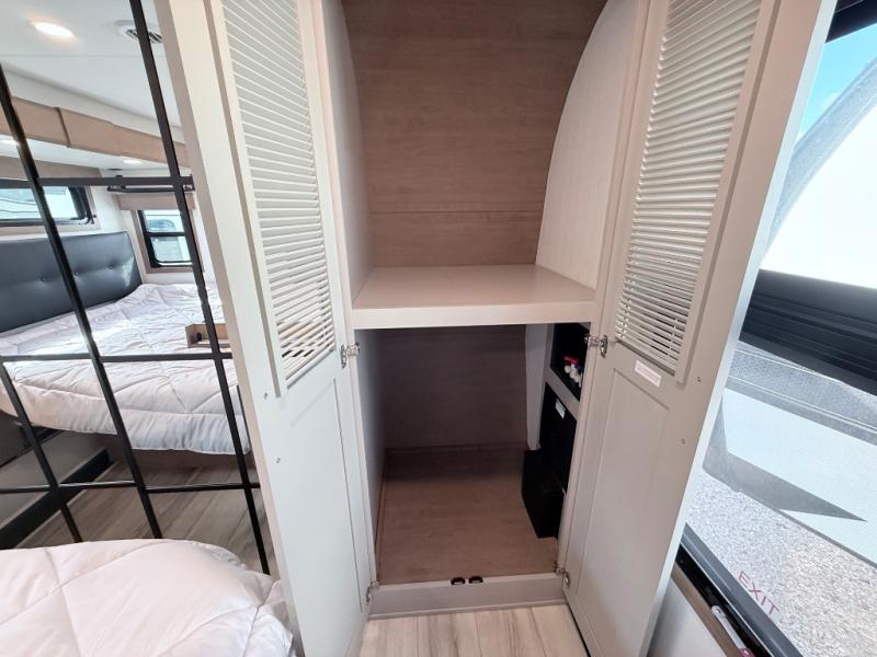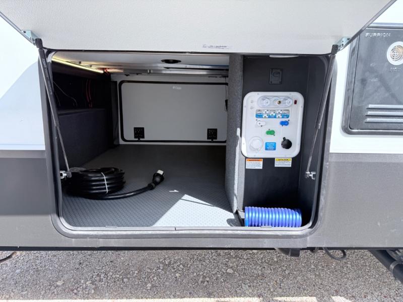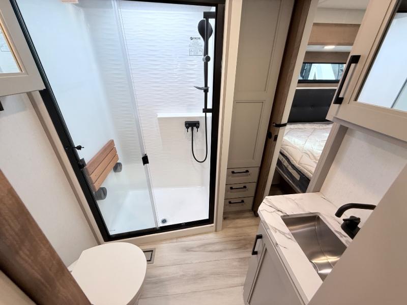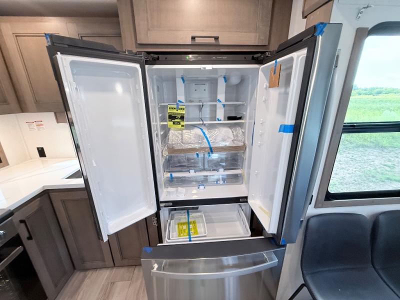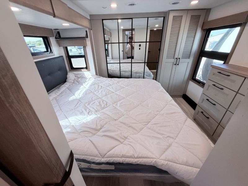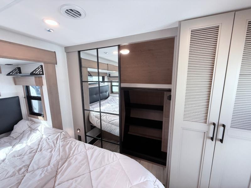The chef will love cooking in the rear kitchen of this fifth wheel! They could even cook the catch of the day on the outside griddle while enjoying a cold beverage from the refrigerator, plus there is a smart TV at the outside kitchen. You can enjoy your meals at the table and chairs then lay down on the hide-a-bed sofa after stuffing yourself full. The theater seating with USB charging also offers a comfortable place to relax in front of the 40" fireplace at the entertainment center. Freshen up each morning in the full bathroom with the 48" x 30" residential shower with a seat and easily grab your towel from the linen closet next to it. When you're ready to wind down your nights, head to the front private bedroom to change into your pajamas stored in the dresser or from the front wardrobe with washer and dryer prep. There is also a king bed slide out or you can choose the optional queen bed if you want more floor space.
