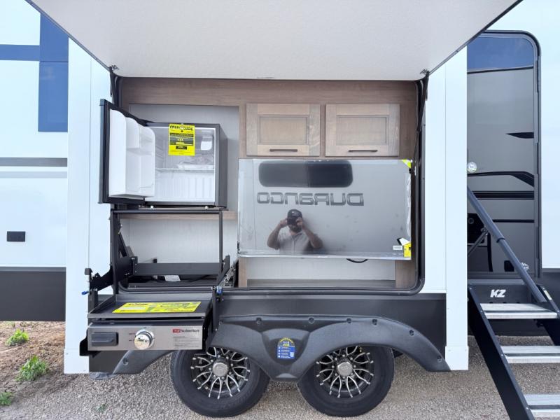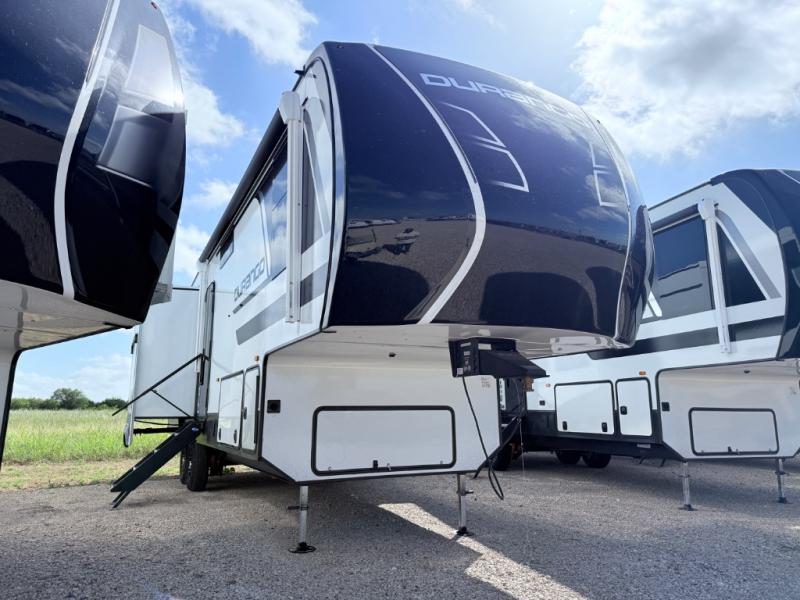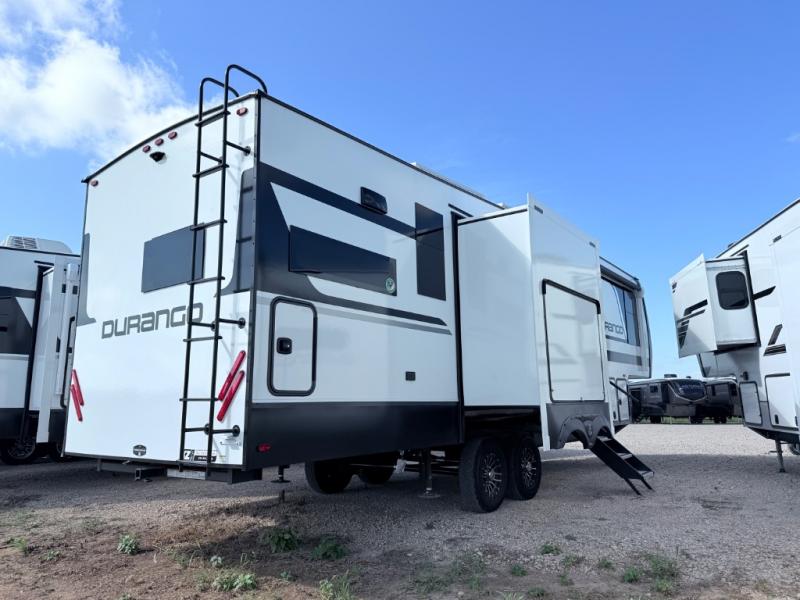 Enjoy full time living, an affordable price, and a wide body construction for more living space with every one of these KZ Durango light high-profile fifth wheels! These luxury units can be used all year round with the all-weather insulation package, the 3" x 14" foam-core in-floor straight-line heating system with a 35,000 BTU furnace, and the 15,000 BTU ducted roof A/C which optimizes the airflow by an average of 40% for better performance, cooling time, and reduction of noise. A few other construction features you will appreciate include a one piece, seamless walk-on Tufflex roofing material, Pex® in-floor heated waterlines, a Lamilux® gelcoat fiberglass exterior, and Dexter® axles with self adjusting brakes and height adjusting hangers. Inside, blancher cherry cabinetry, a king size bed, and smart TVs will have you feeling like you never left home!