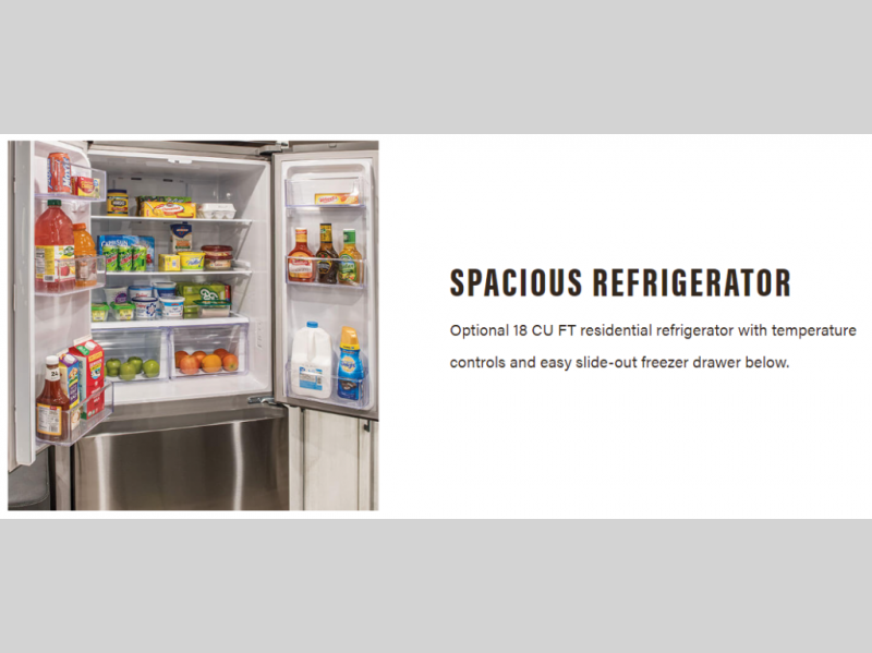 The chef will love cooking in the rear kitchen of this fifth wheel! They could even cook the catch of the day on the outside griddle while enjoying a cold beverage from the refrigerator, plus there is a smart TV at the outside kitchen. You can enjoy your meals at the table and chairs then lay down on the hide-a-bed sofa after stuffing yourself full. The theater seating with USB charging also offers a comfortable place to relax in front of the 40" fireplace at the entertainment center. Freshen up each morning in the full bathroom with the 48" x 30" residential shower with a seat and easily grab your towel from the linen closet next to it. When you're ready to wind down your nights, head to the front private bedroom to change into your pajamas stored in the dresser or from the front wardrobe with washer and dryer prep. There is also a king bed slide out or you can choose the optional queen bed if you want more floor space.
