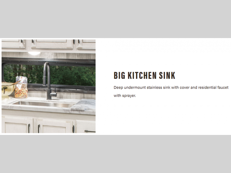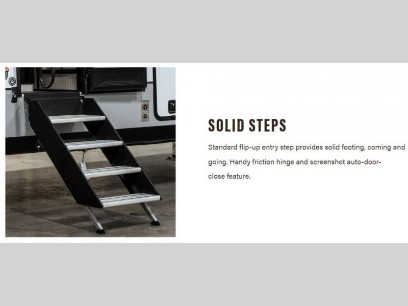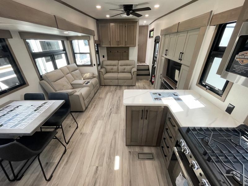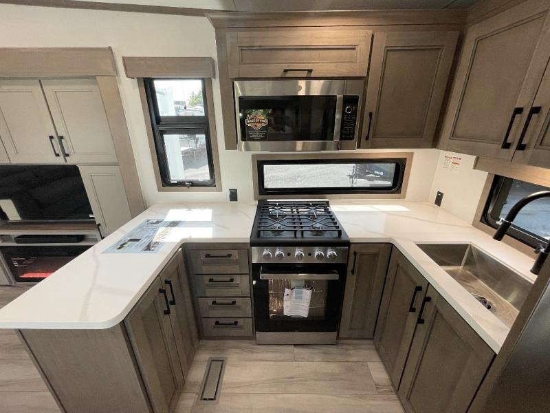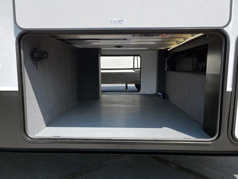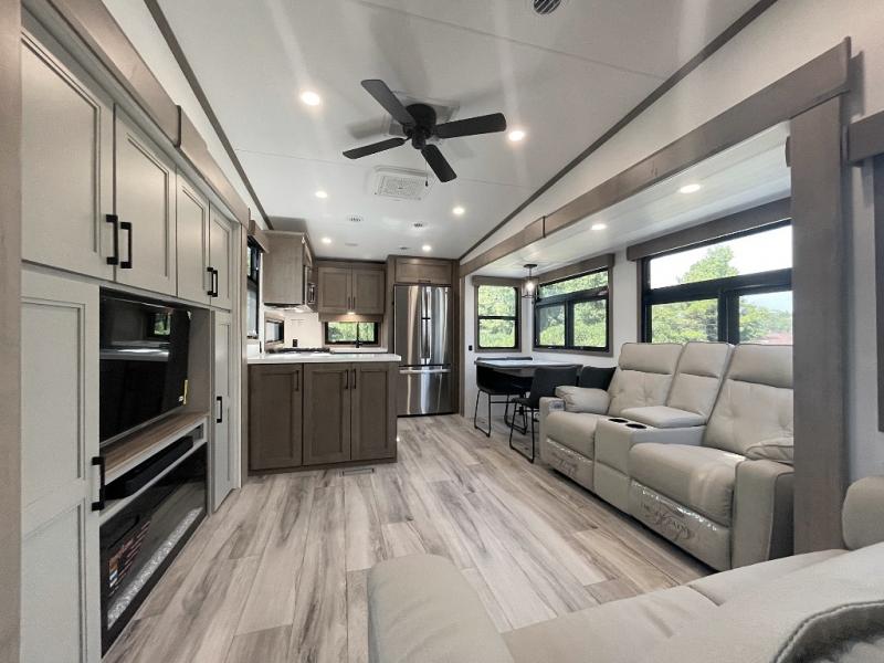 The chef will love cooking in the rear kitchen of this fifth wheel! They could even cook the catch of the day on the outside griddle while enjoying a cold beverage from the refrigerator, plus there is a smart TV at the outside kitchen. You can enjoy your meals at the table and chairs then lay down on the hide-a-bed sofa after stuffing yourself full. The theater seating with USB charging also offers a comfortable place to relax in front of the 40" fireplace at the entertainment center. Freshen up each morning in the full bathroom with the 48" x 30" residential shower with a seat and easily grab your towel from the linen closet next to it. When you're ready to wind down your nights, head to the front private bedroom to change into your pajamas stored in the dresser or from the front wardrobe with washer and dryer prep. There is also a king bed slide out or you can choose the optional queen bed if you want more floor space.