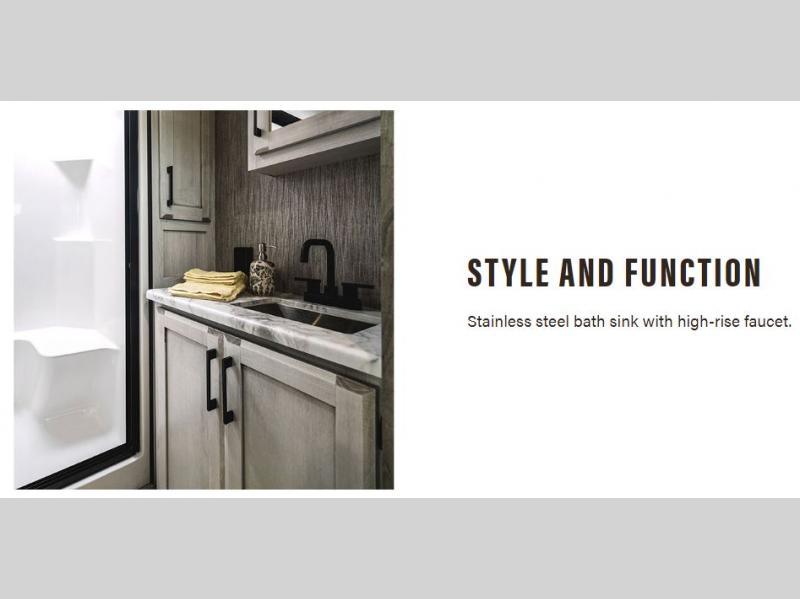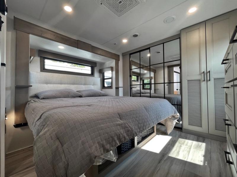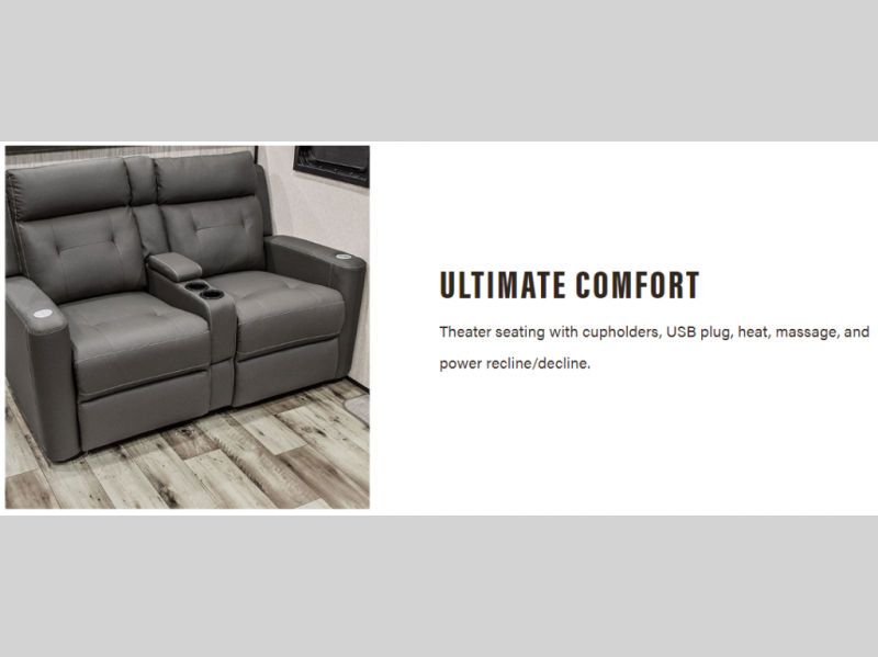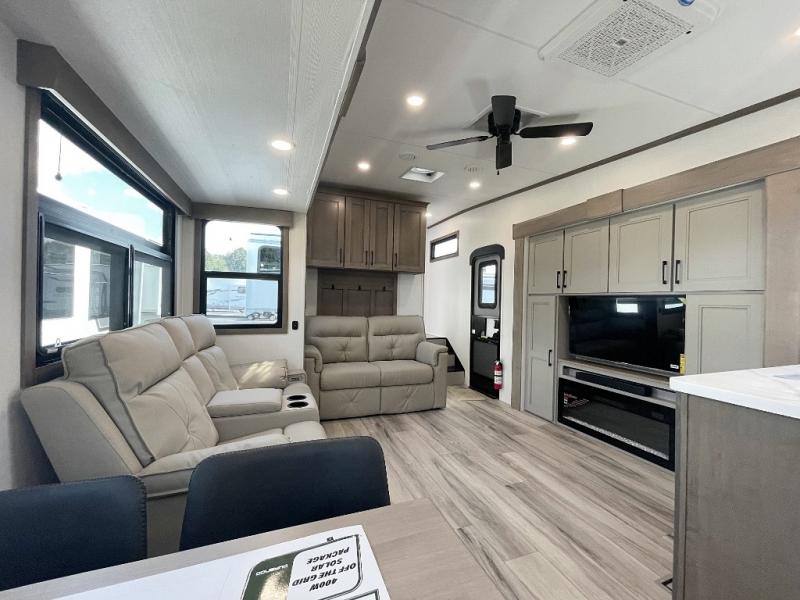 The chef will love cooking in the rear kitchen of this fifth wheel! They could even cook the catch of the day on the outside griddle while enjoying a cold beverage from the refrigerator, plus there is a smart TV at the outside kitchen. You can enjoy your meals at the table and chairs then lay down on the hide-a-bed sofa after stuffing yourself full. The theater seating with USB charging also offers a comfortable place to relax in front of the 40" fireplace at the entertainment center. Freshen up each morning in the full bathroom with the 48" x 30" residential shower with a seat and easily grab your towel from the linen closet next to it. When you're ready to wind down your nights, head to the front private bedroom to change into your pajamas stored in the dresser or from the front wardrobe with washer and dryer prep. There is also a king bed slide out or you can choose the optional queen bed if you want more floor space.