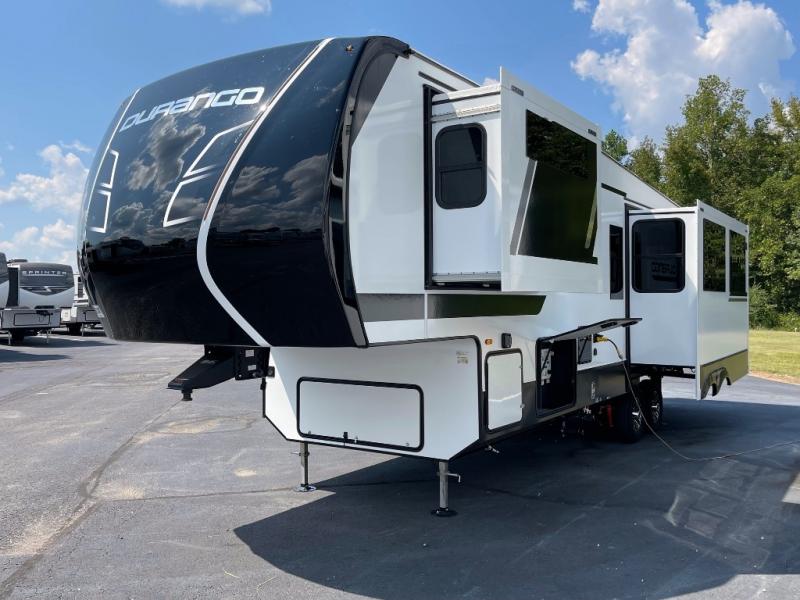 Enjoy full time living, an affordable price, and a wide body construction for more living space with every one of these KZ Durango light high-profile fifth wheels! These luxury units can be used all year round with the all-weather insulation package, the 3" x 14" foam-core in-floor straight-line heating system with a 35,000 BTU furnace, and the 15,000 BTU ducted roof A/C which optimizes the airflow by an average of 40% for better performance, cooling time, and reduction of noise. A few other construction features you will appreciate include a one piece, seamless walk-on Tufflex roofing material, Pex® in-floor heated waterlines, and a Lamilux® gelcoat fiberglass exterior. Inside, blancher maple & morel fog cabinetry , a king size bed, and smart TVs will have you feeling like you never left home!