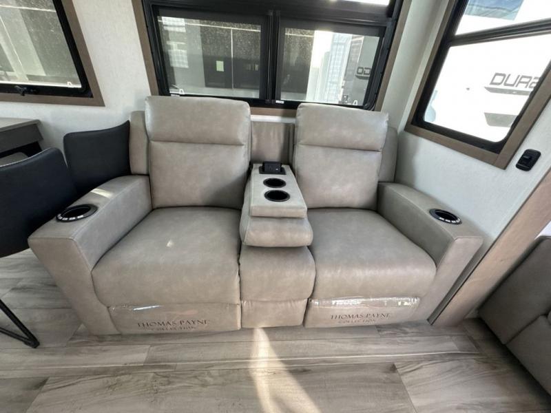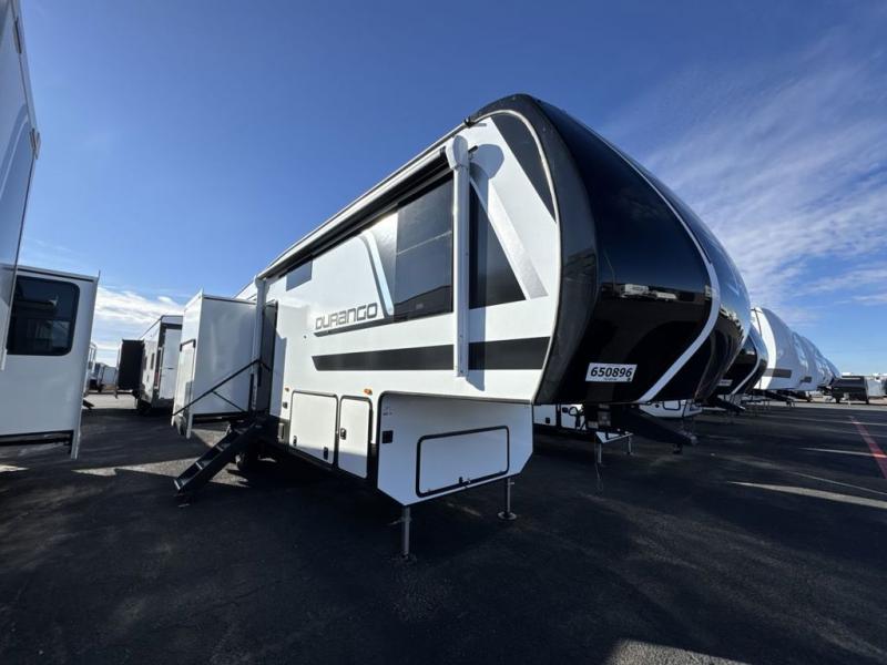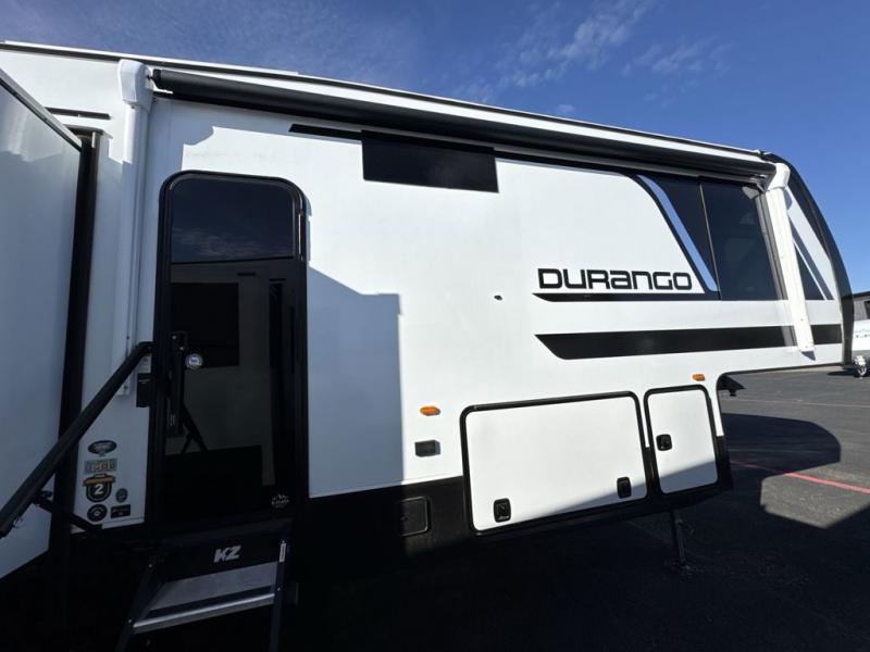 Enjoy full time living, an affordable price, and a wide body construction for more living space with every one of these KZ Durango light high-profile fifth wheels! These luxury units can be used all year round with the all-weather insulation package, the 3" x 14" foam-core in-floor straight-line heating system with a 35,000 BTU furnace, and the 15,000 BTU ducted roof A/C which optimizes the airflow by an average of 40% for better performance, cooling time, and reduction of noise. A few other construction features you will appreciate include a one piece, seamless walk-on Tufflex roofing material, Pex® in-floor heated waterlines, and a Lamilux® gelcoat fiberglass exterior. Inside, blancher maple & morel fog cabinetry , a king size bed, and smart TVs will have you feeling like you never left home!
