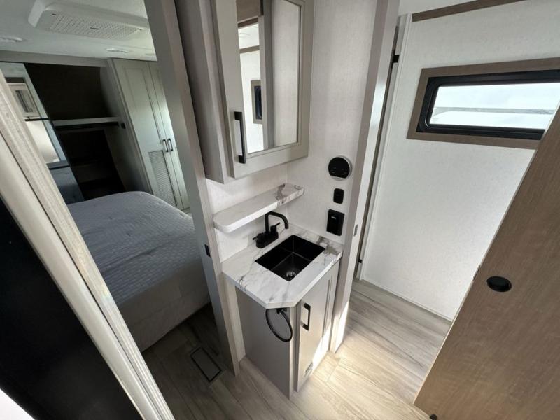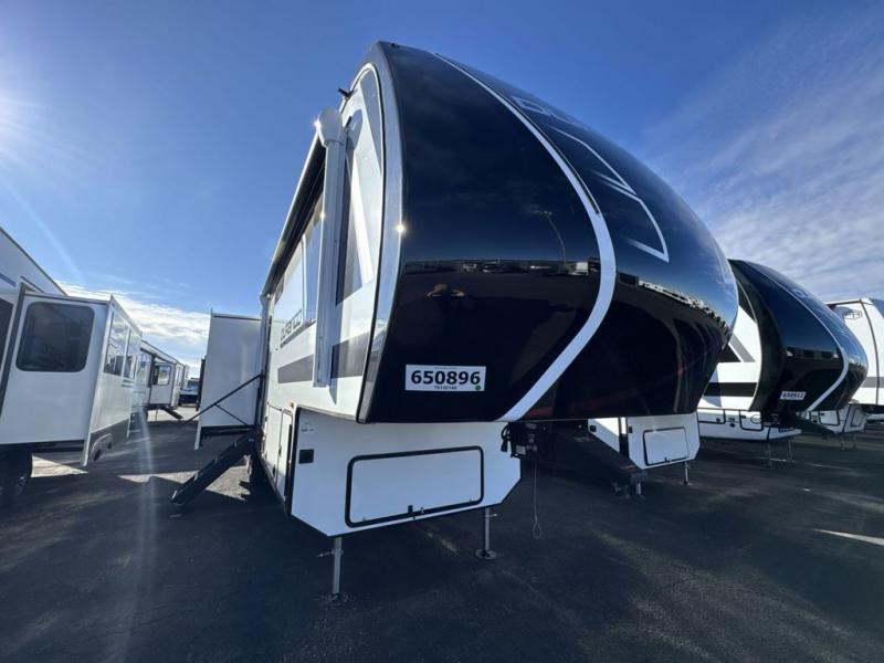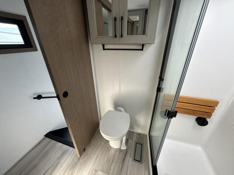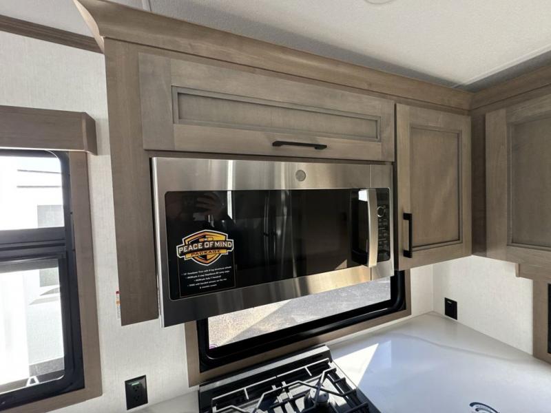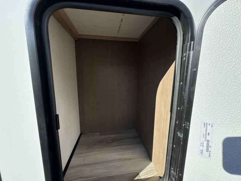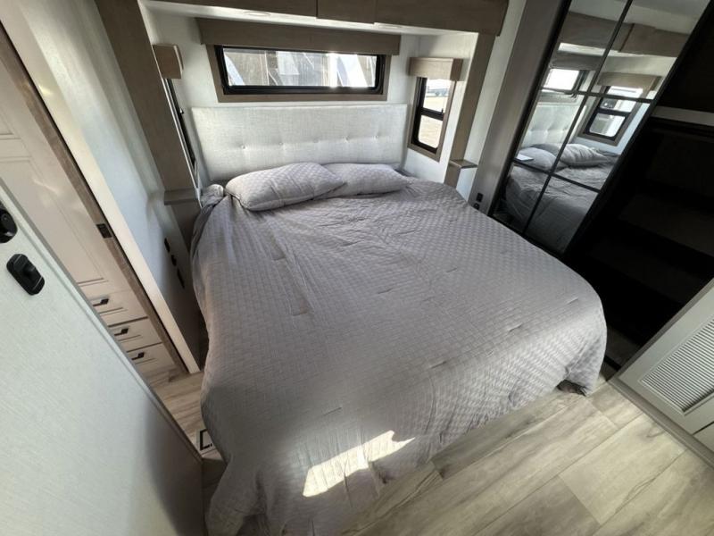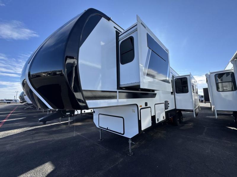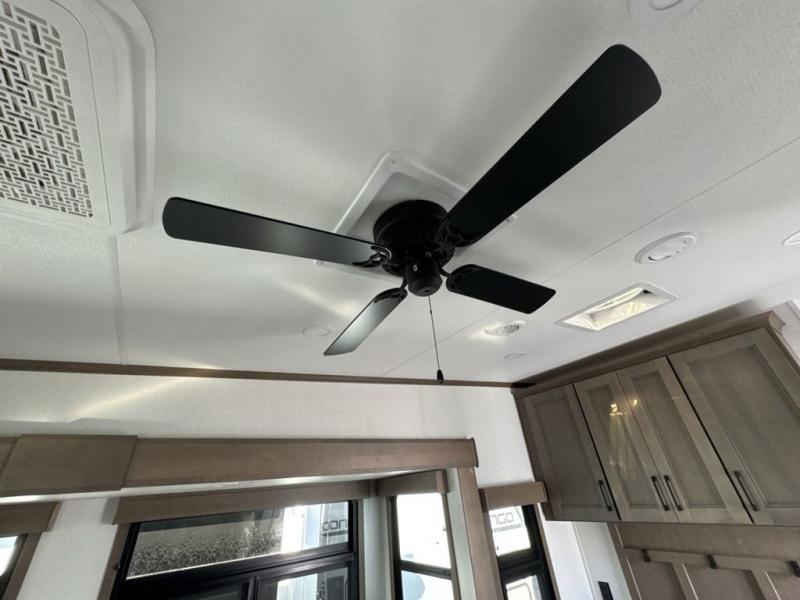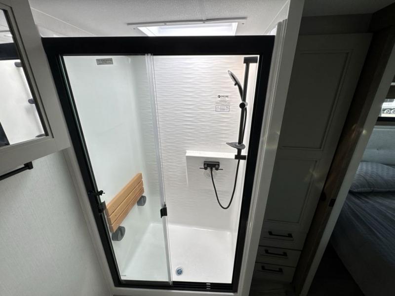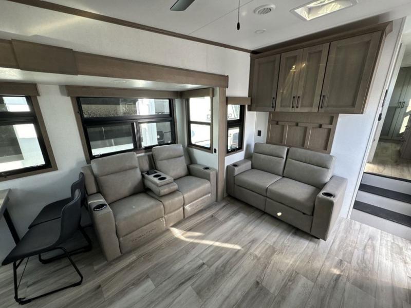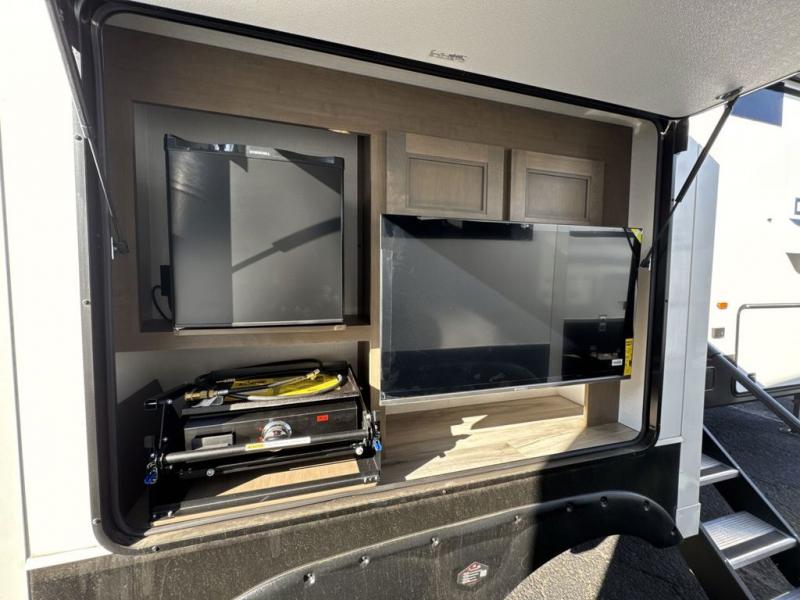 The chef will love cooking in the rear kitchen of this fifth wheel! They could even cook the catch of the day on the outside griddle while enjoying a cold beverage from the refrigerator, plus there is a smart TV at the outside kitchen. You can enjoy your meals at the table and chairs then lay down on the hide-a-bed sofa after stuffing yourself full. The theater seating with USB charging also offers a comfortable place to relax in front of the 40" fireplace at the entertainment center. Freshen up each morning in the full bathroom with the 48" x 30" residential shower with a seat and easily grab your towel from the linen closet next to it. When you're ready to wind down your nights, head to the front private bedroom to change into your pajamas stored in the dresser or from the front wardrobe with washer and dryer prep. There is also a king bed slide out or you can choose the optional queen bed if you want more floor space.