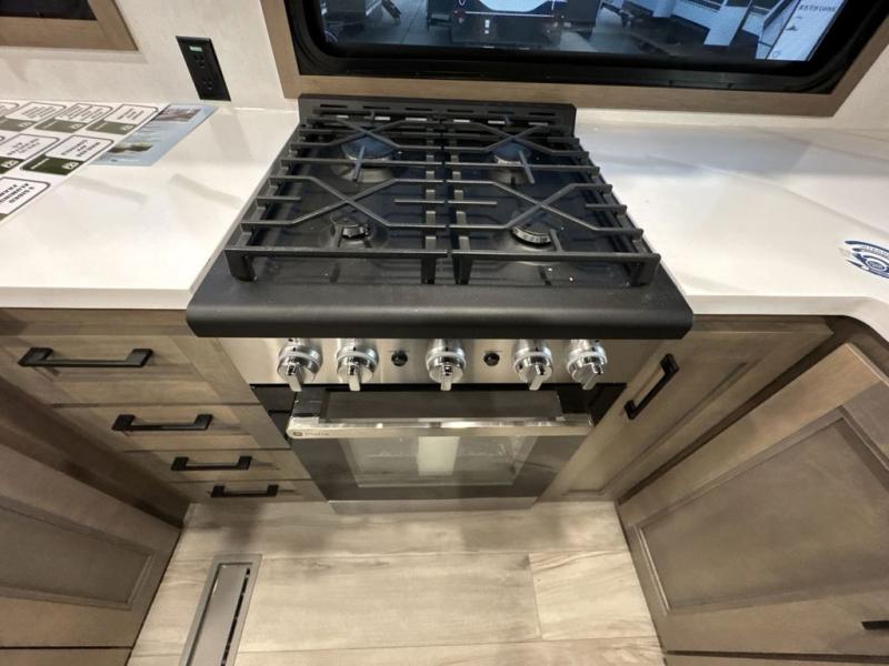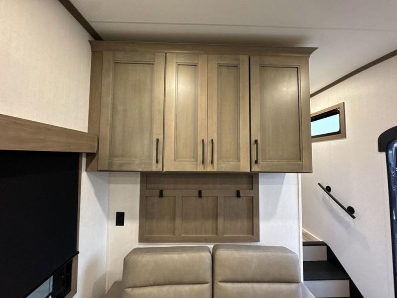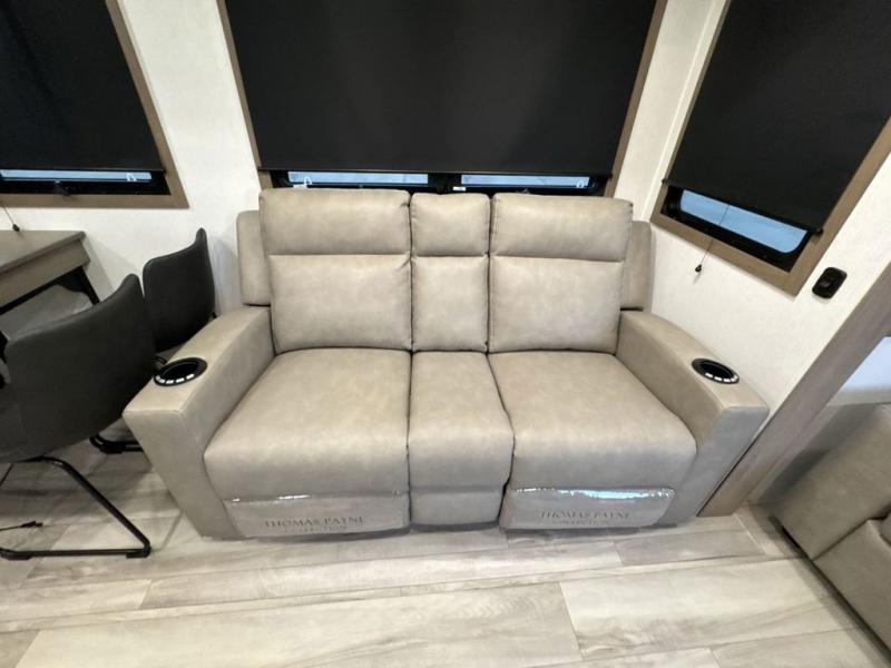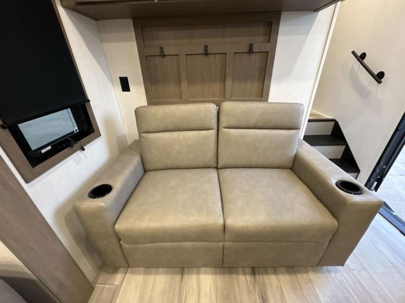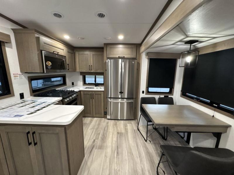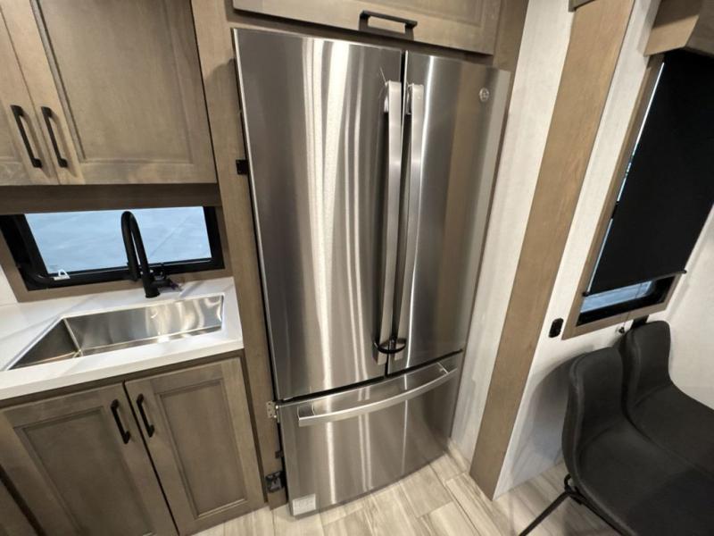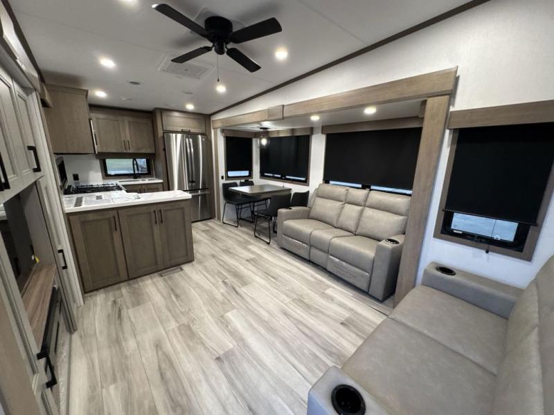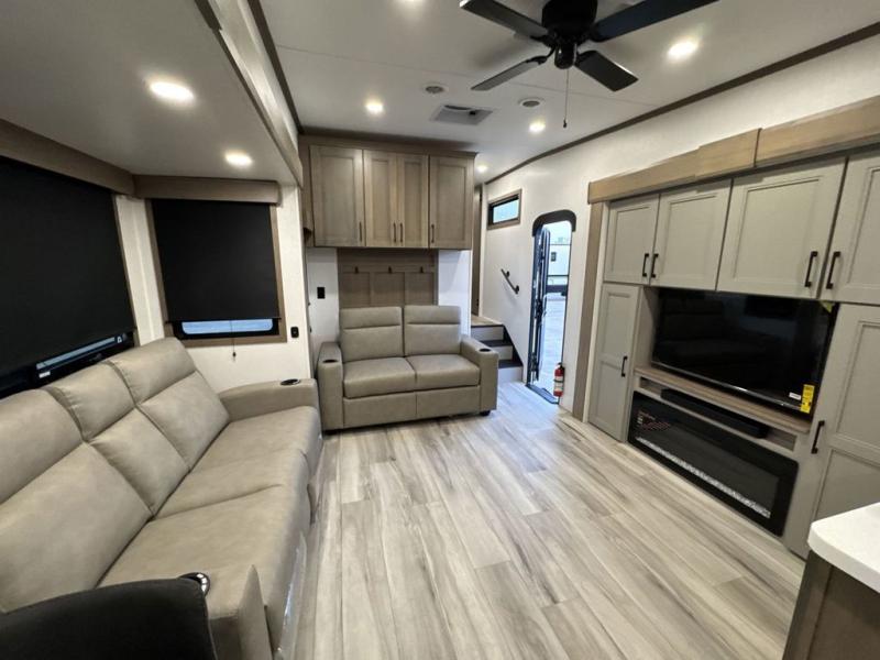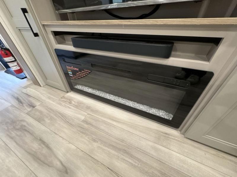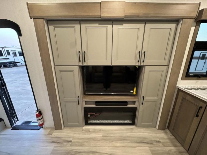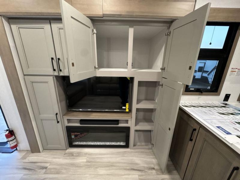 The chef will love cooking in the rear kitchen of this fifth wheel! They could even cook the catch of the day on the outside griddle while enjoying a cold beverage from the refrigerator, plus there is a smart TV at the outside kitchen. You can enjoy your meals at the table and chairs then lay down on the hide-a-bed sofa after stuffing yourself full. The theater seating with USB charging also offers a comfortable place to relax in front of the 40" fireplace at the entertainment center. Freshen up each morning in the full bathroom with the 48" x 30" residential shower with a seat and easily grab your towel from the linen closet next to it. When you're ready to wind down your nights, head to the front private bedroom to change into your pajamas stored in the dresser or from the front wardrobe with washer and dryer prep. There is also a king bed slide out or you can choose the optional queen bed if you want more floor space.