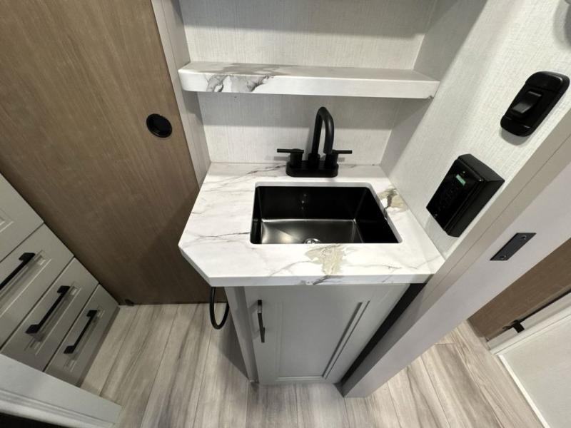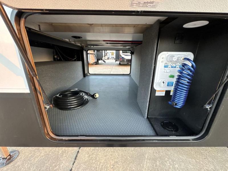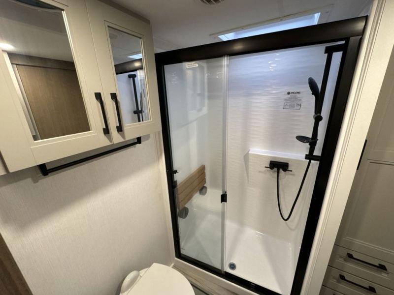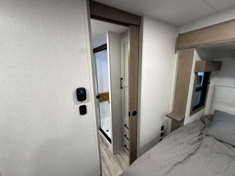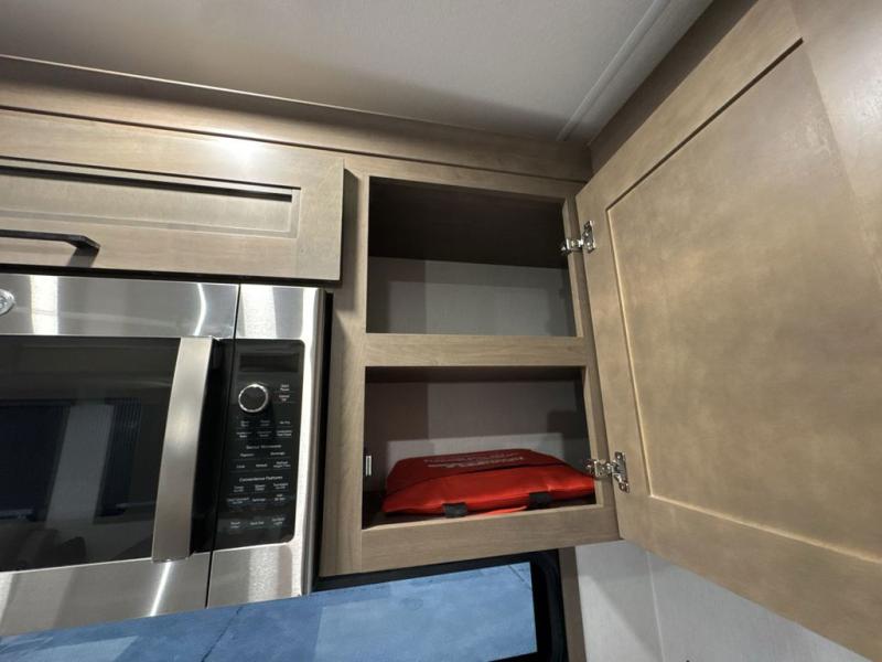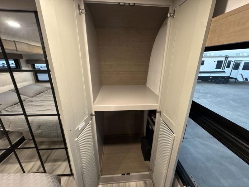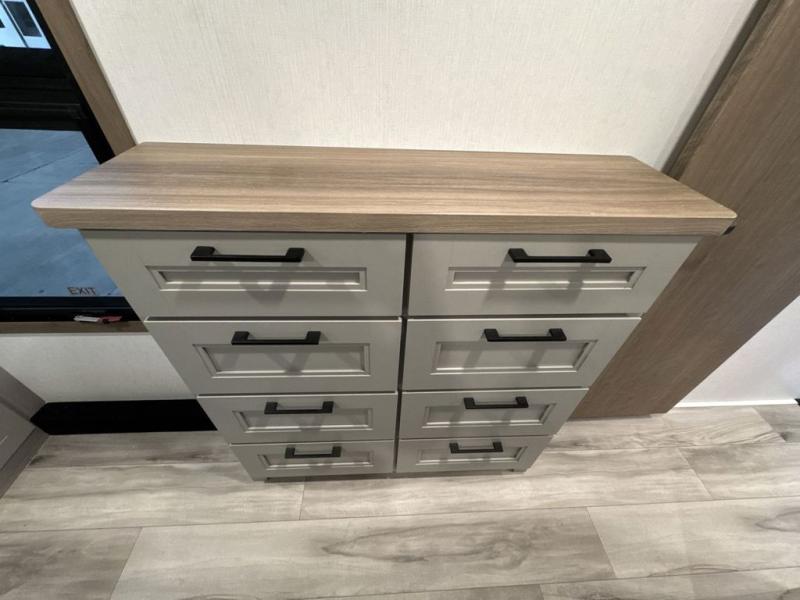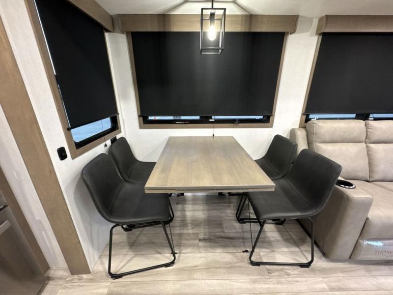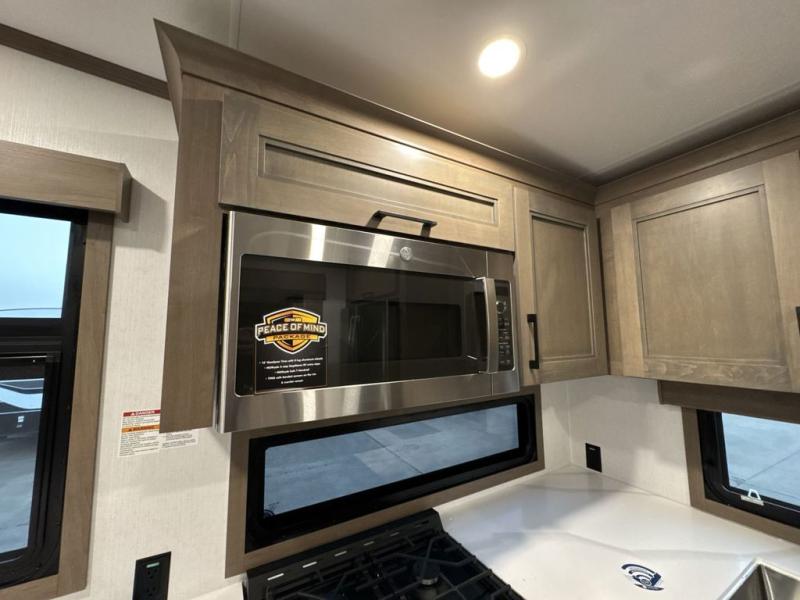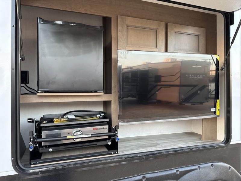 The chef will love cooking in the rear kitchen of this fifth wheel! They could even cook the catch of the day on the outside griddle while enjoying a cold beverage from the refrigerator, plus there is a smart TV at the outside kitchen. You can enjoy your meals at the table and chairs then lay down on the hide-a-bed sofa after stuffing yourself full. The theater seating with USB charging also offers a comfortable place to relax in front of the 40" fireplace at the entertainment center. Freshen up each morning in the full bathroom with the 48" x 30" residential shower with a seat and easily grab your towel from the linen closet next to it. When you're ready to wind down your nights, head to the front private bedroom to change into your pajamas stored in the dresser or from the front wardrobe with washer and dryer prep. There is also a king bed slide out or you can choose the optional queen bed if you want more floor space.