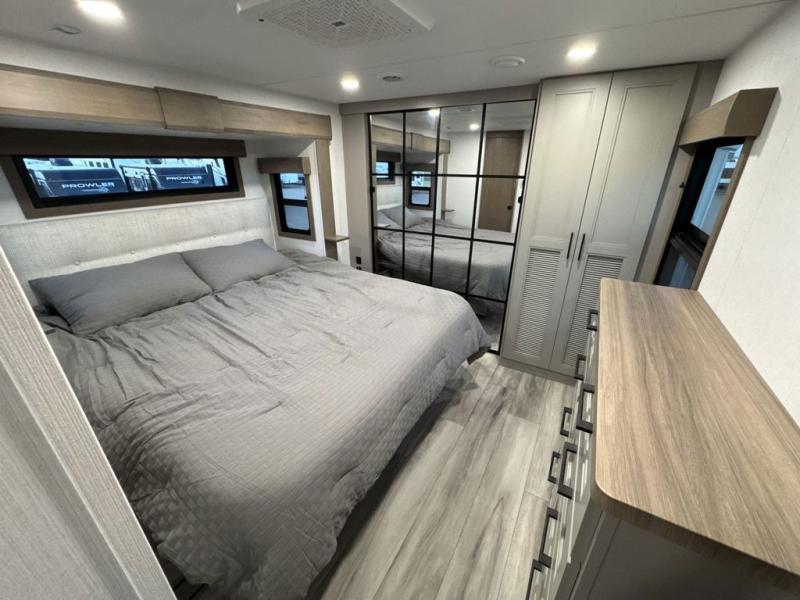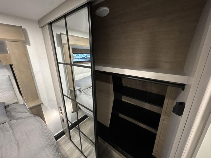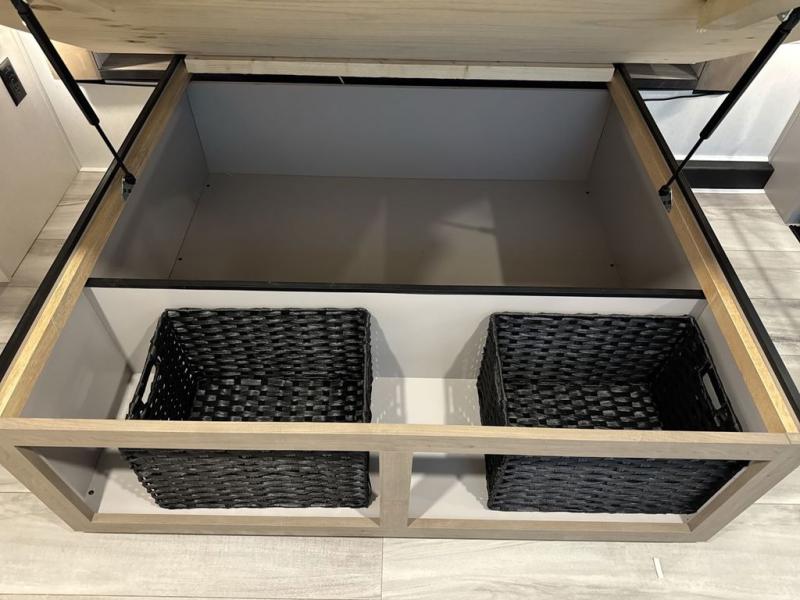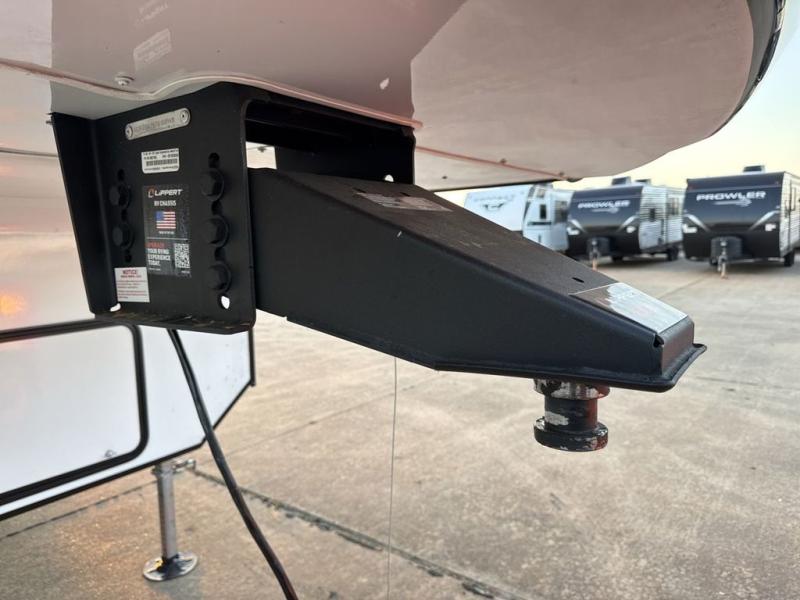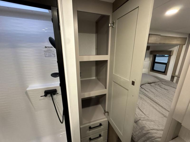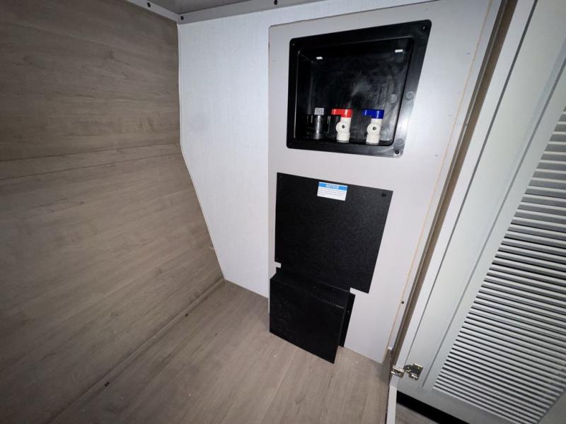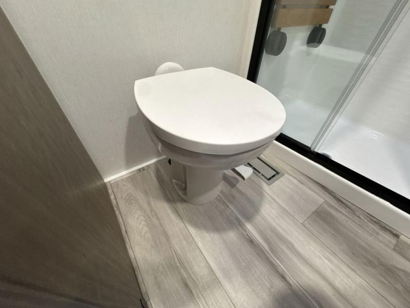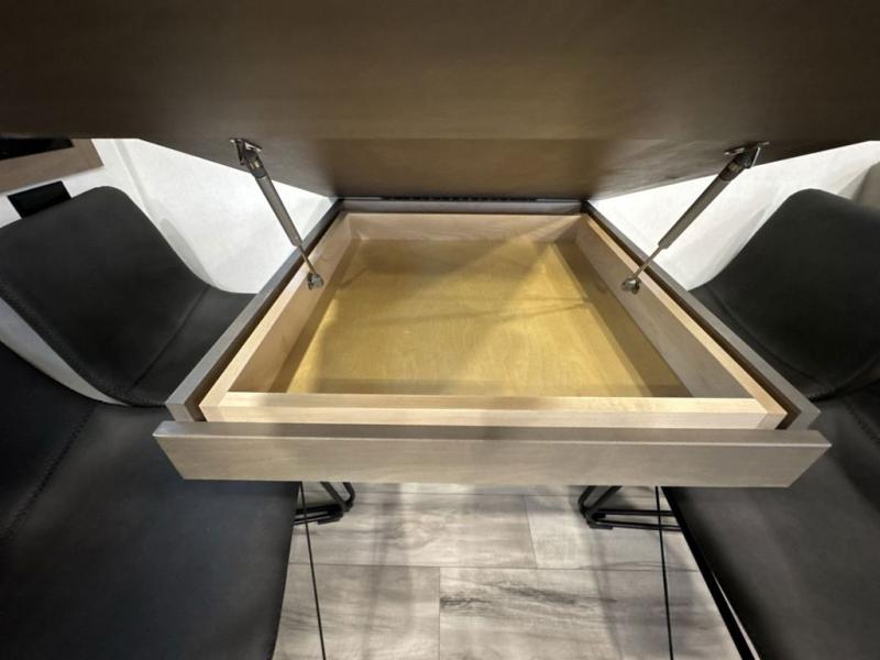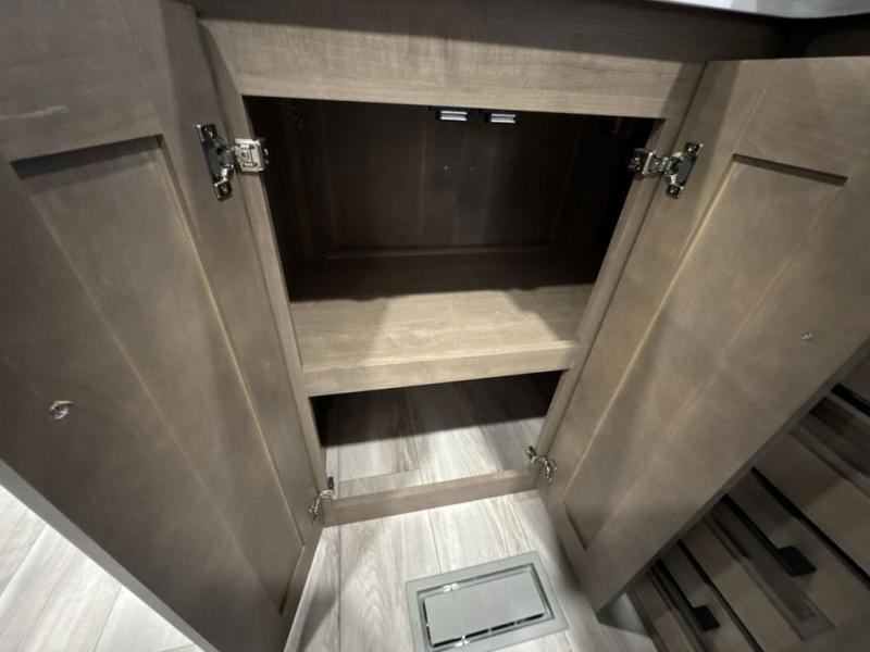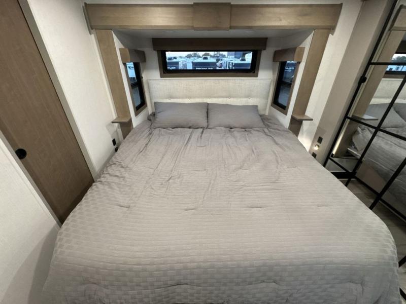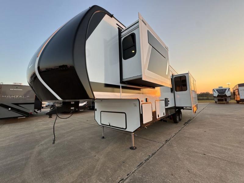 The chef will love cooking in the rear kitchen of this fifth wheel! They could even cook the catch of the day on the outside griddle while enjoying a cold beverage from the refrigerator, plus there is a smart TV at the outside kitchen. You can enjoy your meals at the table and chairs then lay down on the hide-a-bed sofa after stuffing yourself full. The theater seating with USB charging also offers a comfortable place to relax in front of the 40" fireplace at the entertainment center. Freshen up each morning in the full bathroom with the 48" x 30" residential shower with a seat and easily grab your towel from the linen closet next to it. When you're ready to wind down your nights, head to the front private bedroom to change into your pajamas stored in the dresser or from the front wardrobe with washer and dryer prep. There is also a king bed slide out or you can choose the optional queen bed if you want more floor space.
