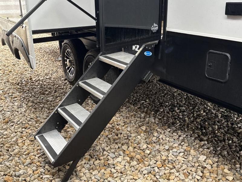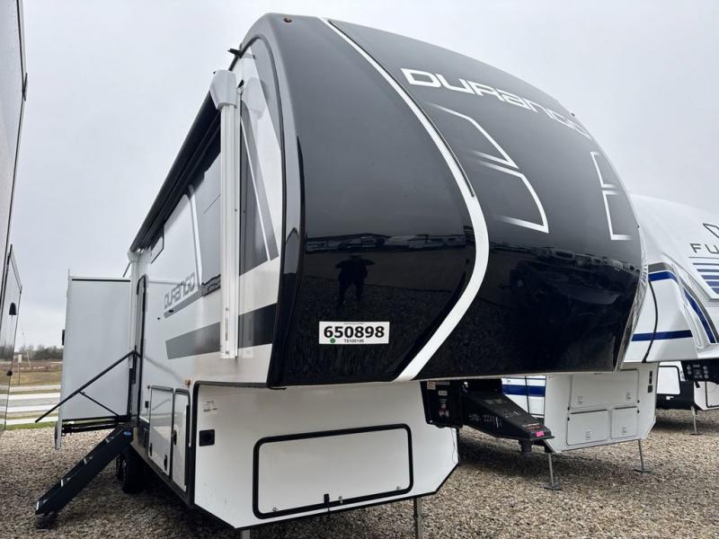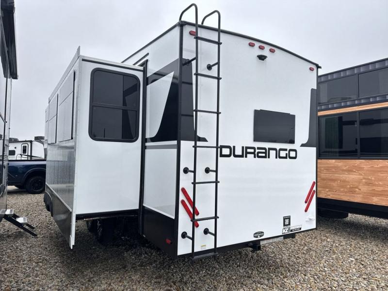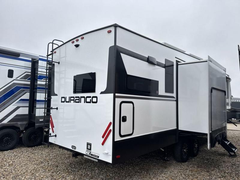 Enjoy full time living, an affordable price, and a wide body construction for more living space with every one of these KZ Durango light high-profile fifth wheels! These luxury units can be used all year round with the all-weather insulation package, the 3" x 14" foam-core in-floor straight-line heating system with a 35,000 BTU furnace, and the 15,000 BTU ducted roof A/C which optimizes the airflow by an average of 40% for better performance, cooling time, and reduction of noise. A few other construction features you will appreciate include a one piece, seamless walk-on Tufflex roofing material, Pex® in-floor heated waterlines, and a Lamilux® gelcoat fiberglass exterior. Inside, blancher maple & morel fog cabinetry , a king size bed, and smart TVs will have you feeling like you never left home!