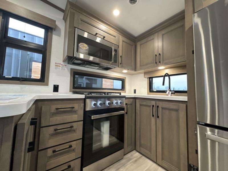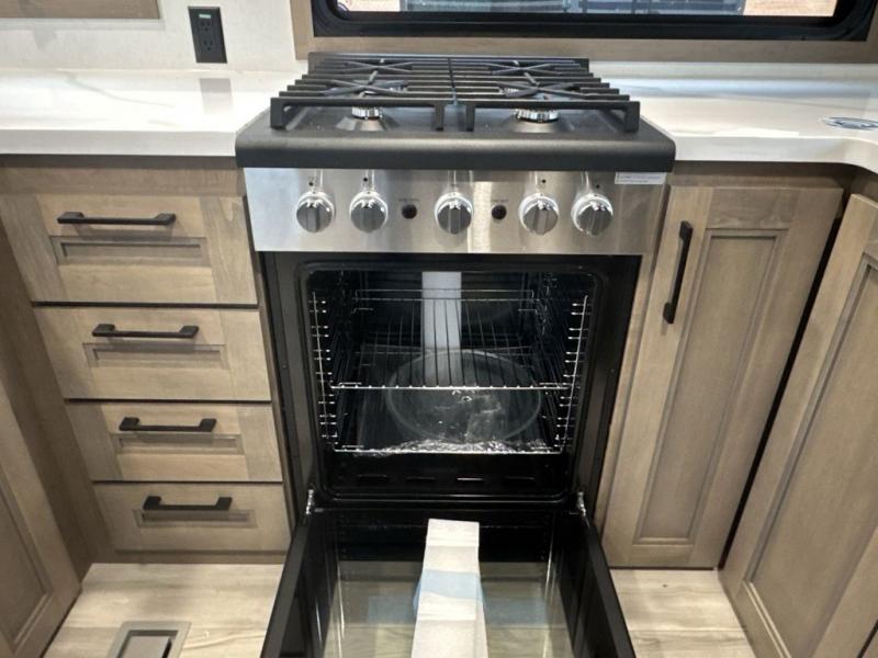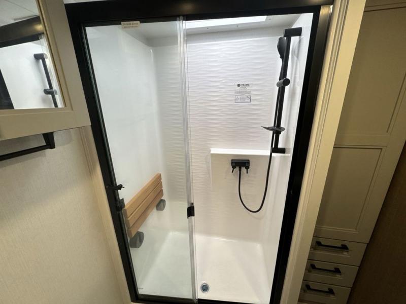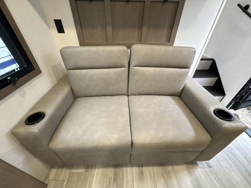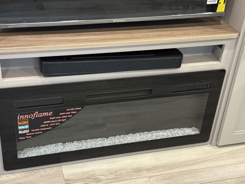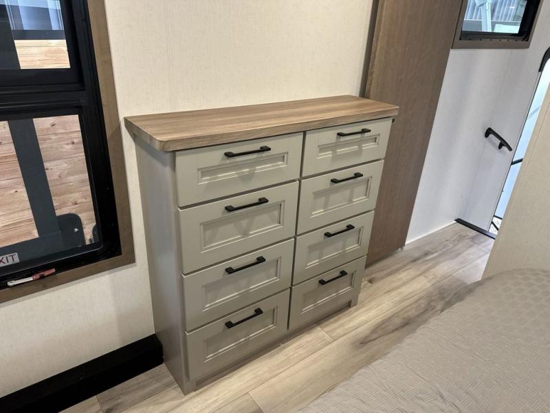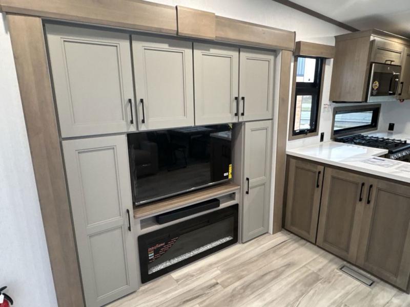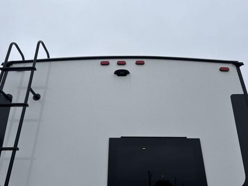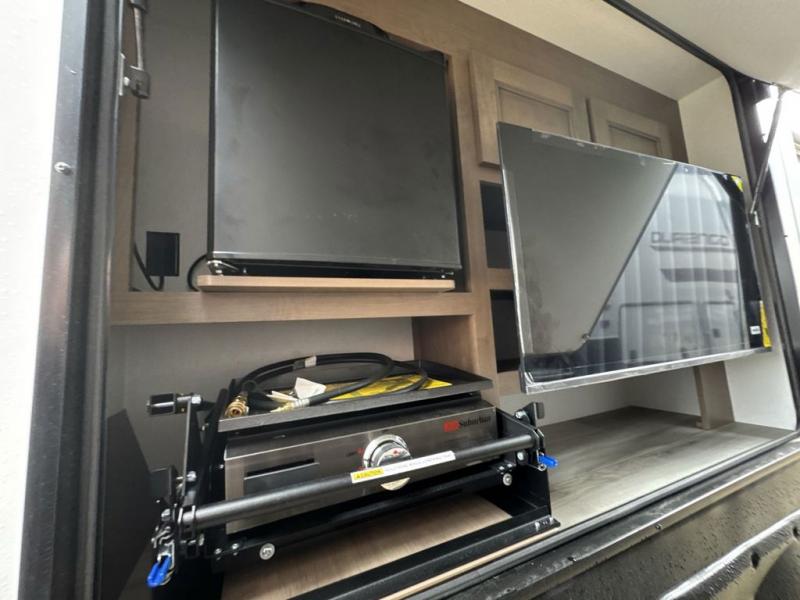 The chef will love cooking in the rear kitchen of this fifth wheel! They could even cook the catch of the day on the outside griddle while enjoying a cold beverage from the refrigerator, plus there is a smart TV at the outside kitchen. You can enjoy your meals at the table and chairs then lay down on the hide-a-bed sofa after stuffing yourself full. The theater seating with USB charging also offers a comfortable place to relax in front of the 40" fireplace at the entertainment center. Freshen up each morning in the full bathroom with the 48" x 30" residential shower with a seat and easily grab your towel from the linen closet next to it. When you're ready to wind down your nights, head to the front private bedroom to change into your pajamas stored in the dresser or from the front wardrobe with washer and dryer prep. There is also a king bed slide out or you can choose the optional queen bed if you want more floor space.