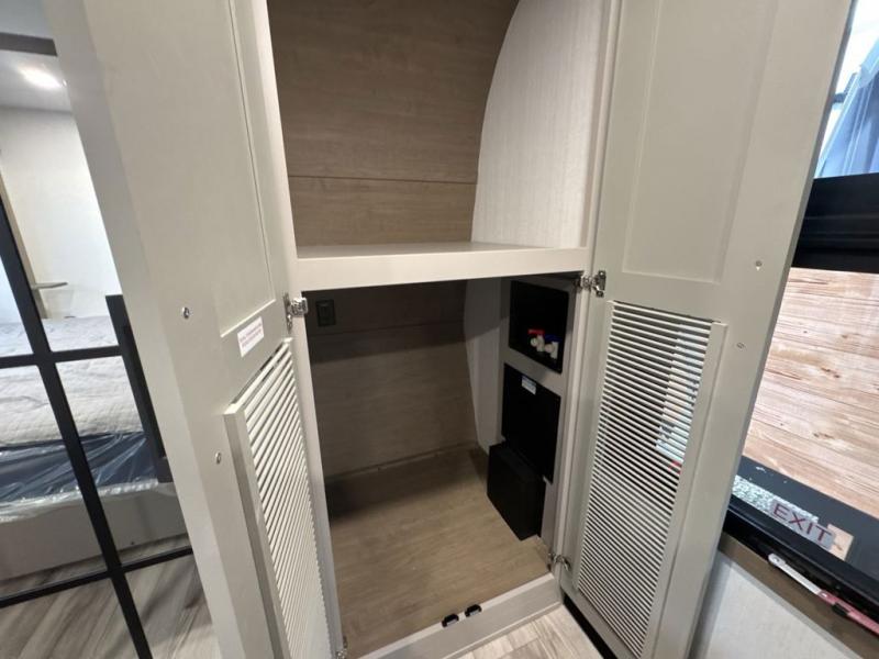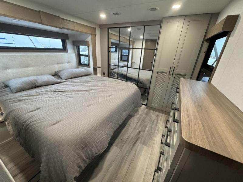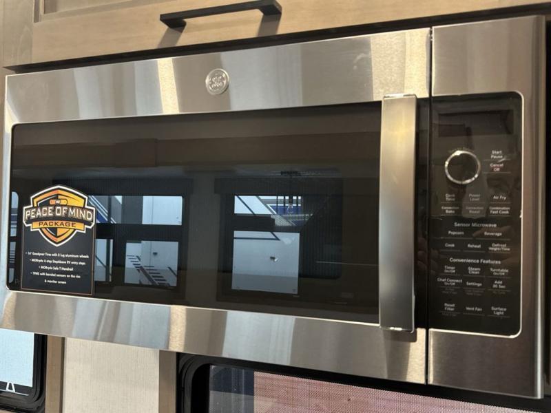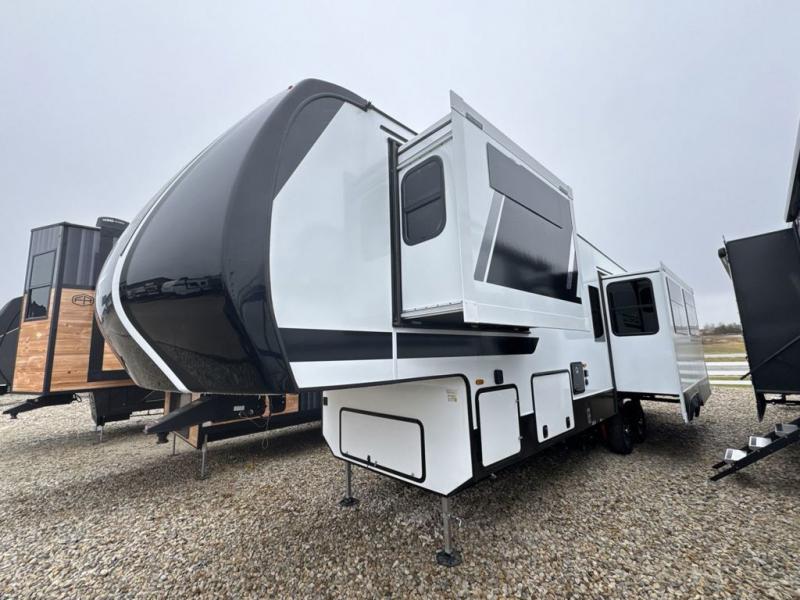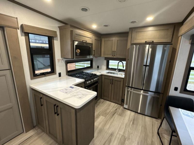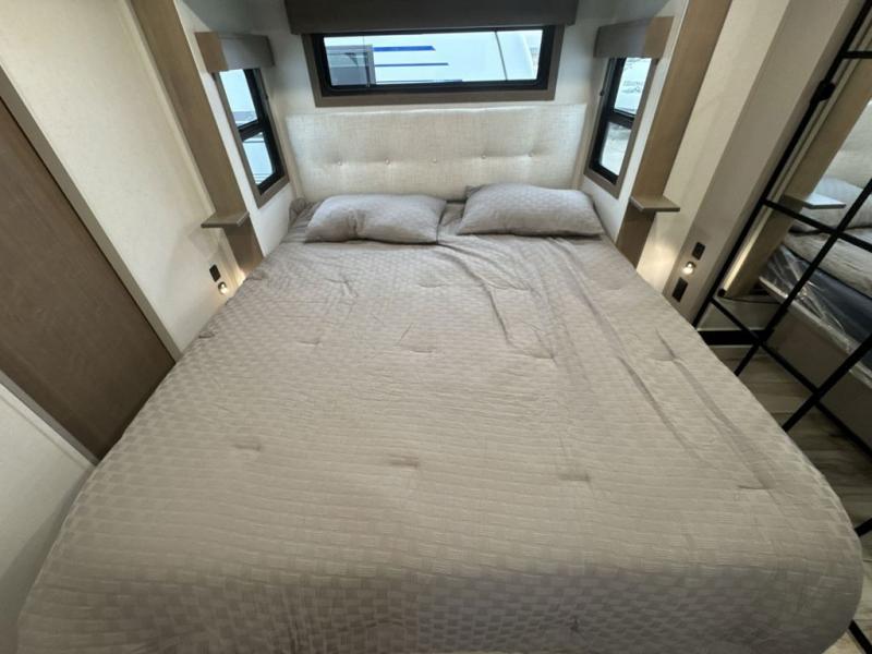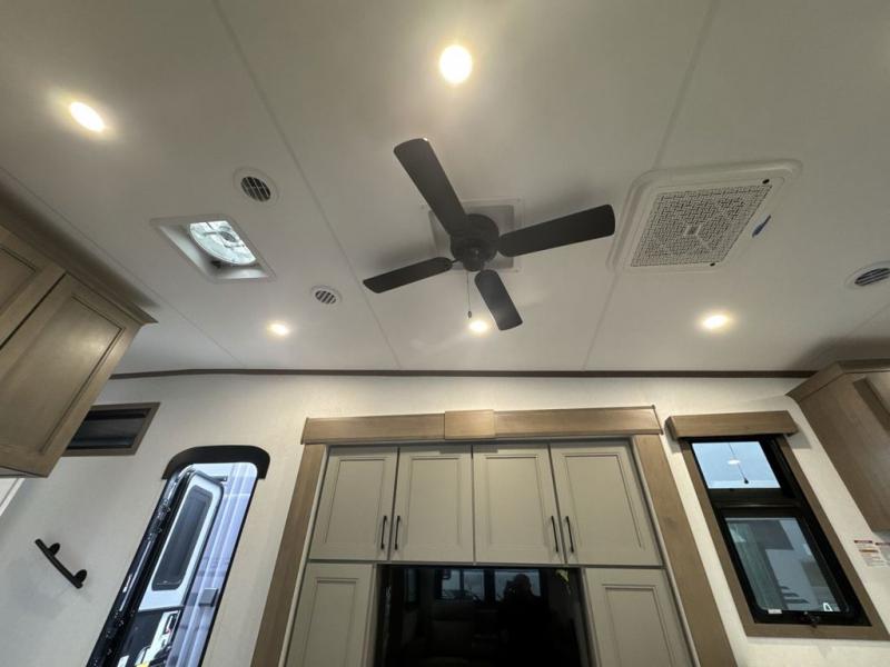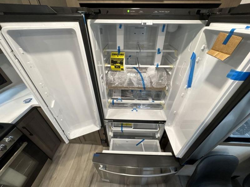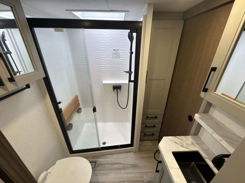 The chef will love cooking in the rear kitchen of this fifth wheel! They could even cook the catch of the day on the outside griddle while enjoying a cold beverage from the refrigerator, plus there is a smart TV at the outside kitchen. You can enjoy your meals at the table and chairs then lay down on the hide-a-bed sofa after stuffing yourself full. The theater seating with USB charging also offers a comfortable place to relax in front of the 40" fireplace at the entertainment center. Freshen up each morning in the full bathroom with the 48" x 30" residential shower with a seat and easily grab your towel from the linen closet next to it. When you're ready to wind down your nights, head to the front private bedroom to change into your pajamas stored in the dresser or from the front wardrobe with washer and dryer prep. There is also a king bed slide out or you can choose the optional queen bed if you want more floor space.