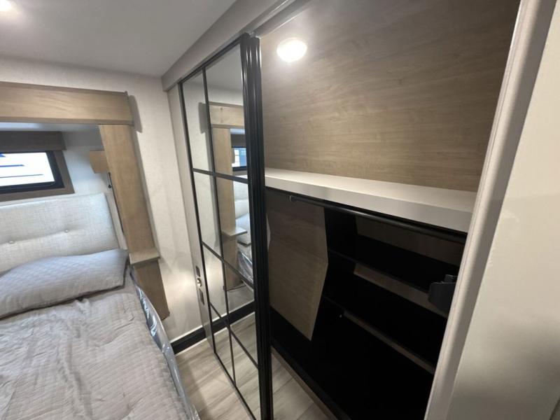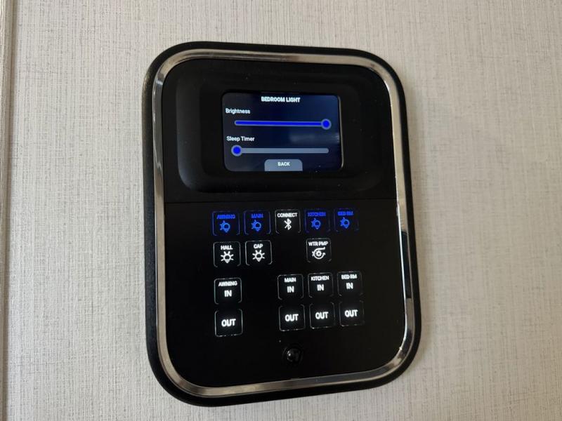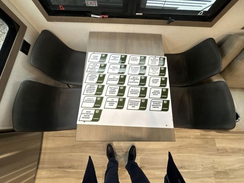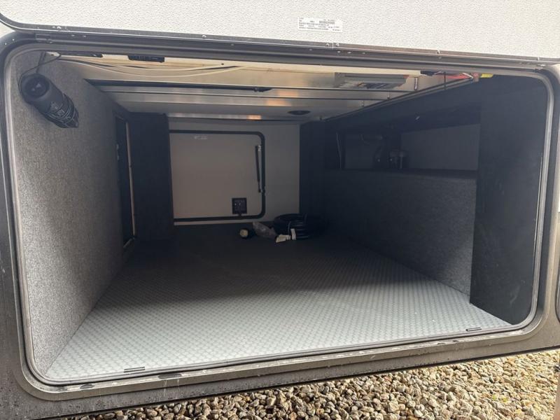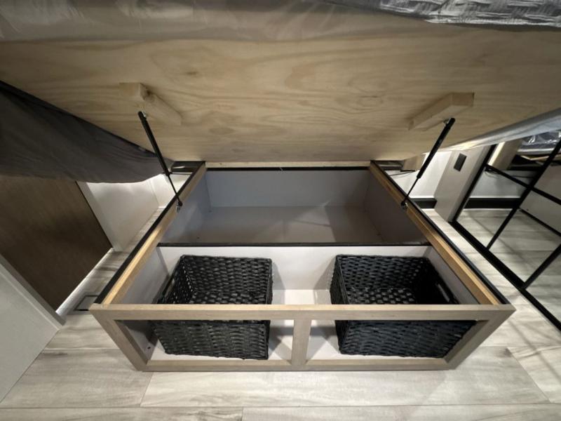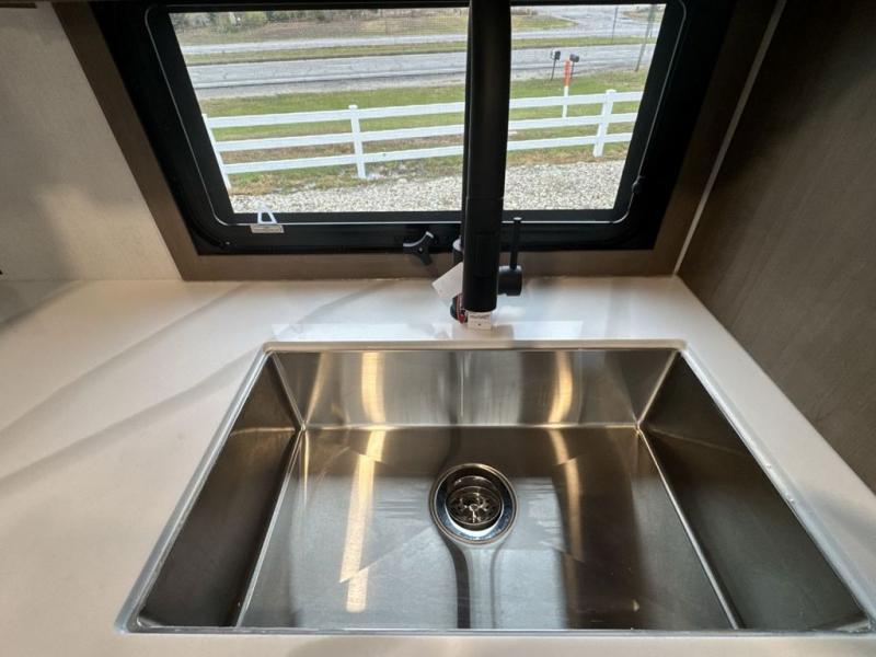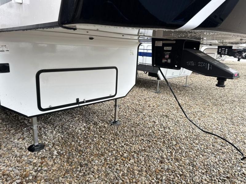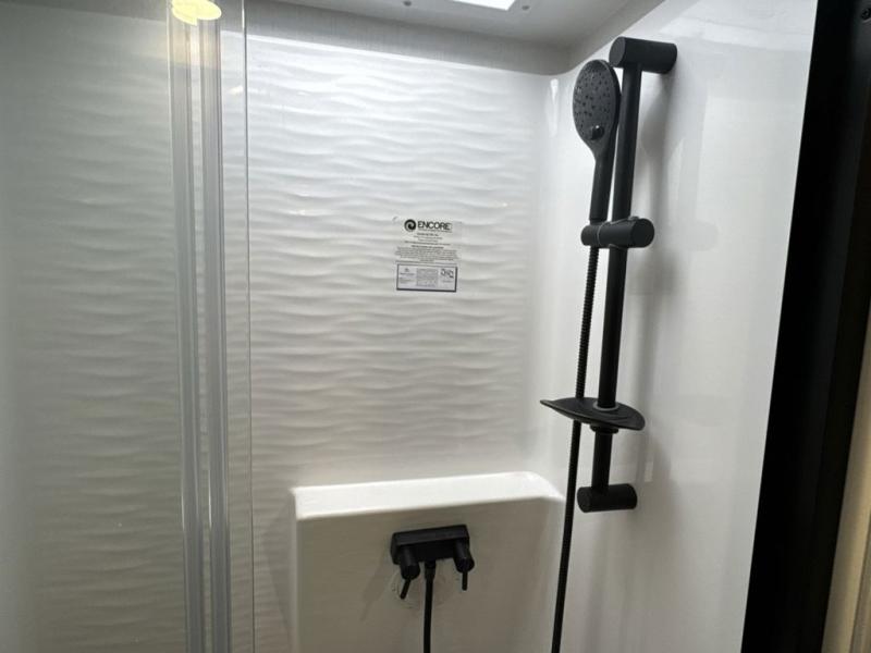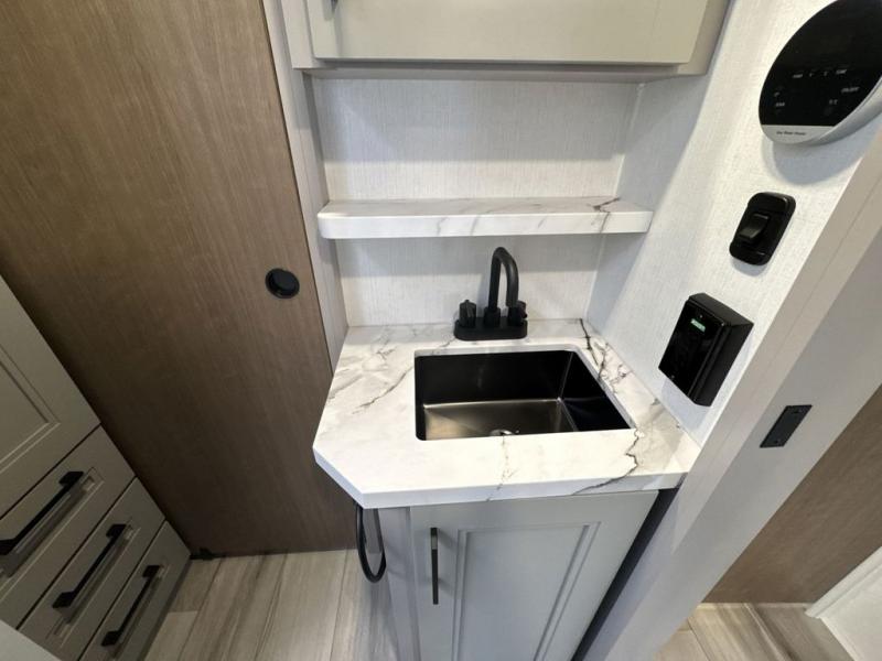 The chef will love cooking in the rear kitchen of this fifth wheel! They could even cook the catch of the day on the outside griddle while enjoying a cold beverage from the refrigerator, plus there is a smart TV at the outside kitchen. You can enjoy your meals at the table and chairs then lay down on the hide-a-bed sofa after stuffing yourself full. The theater seating with USB charging also offers a comfortable place to relax in front of the 40" fireplace at the entertainment center. Freshen up each morning in the full bathroom with the 48" x 30" residential shower with a seat and easily grab your towel from the linen closet next to it. When you're ready to wind down your nights, head to the front private bedroom to change into your pajamas stored in the dresser or from the front wardrobe with washer and dryer prep. There is also a king bed slide out or you can choose the optional queen bed if you want more floor space.