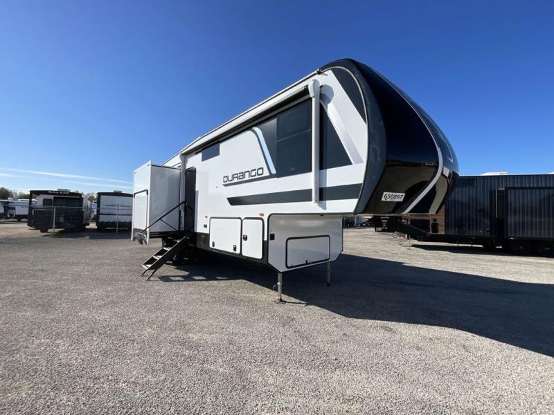 Enjoy full time living, an affordable price, and a wide body construction for more living space with every one of these KZ Durango light high-profile fifth wheels! These luxury units can be used all year round with the all-weather insulation package, the 3" x 14" foam-core in-floor straight-line heating system with a 35,000 BTU furnace, and the 15,000 BTU ducted roof A/C which optimizes the airflow by an average of 40% for better performance, cooling time, and reduction of noise. A few other construction features you will appreciate include a one piece, seamless walk-on Tufflex roofing material, Pex® in-floor heated waterlines, and a Lamilux® gelcoat fiberglass exterior. Inside, blancher maple & morel fog cabinetry , a king size bed, and smart TVs will have you feeling like you never left home!