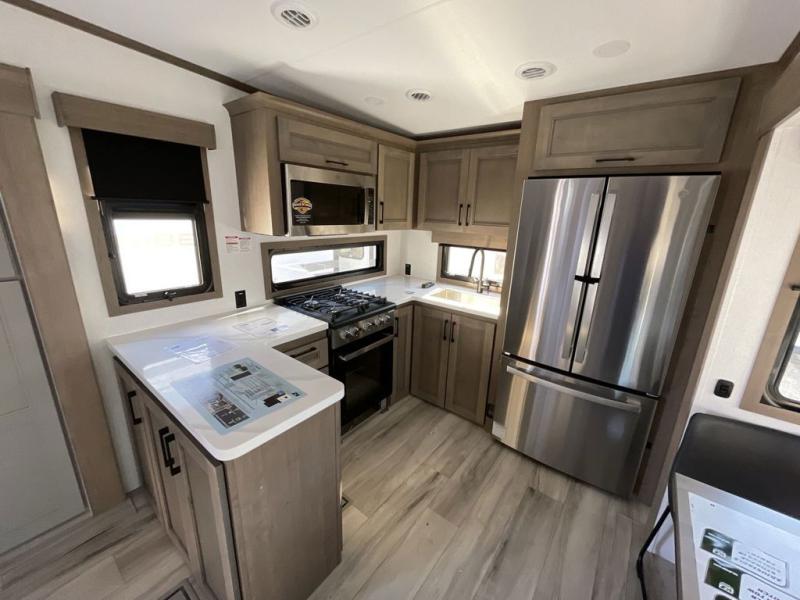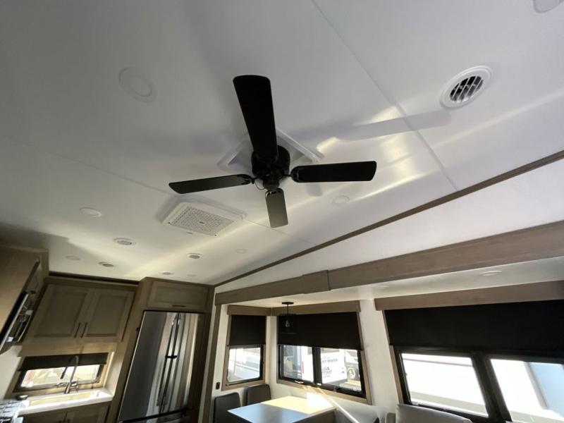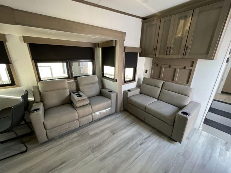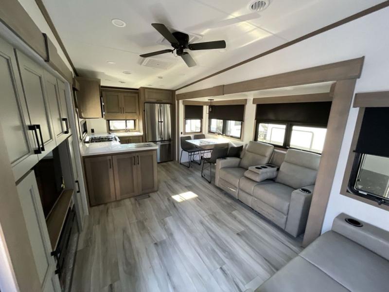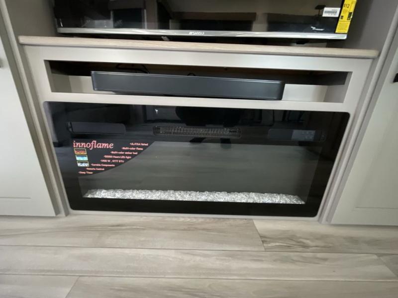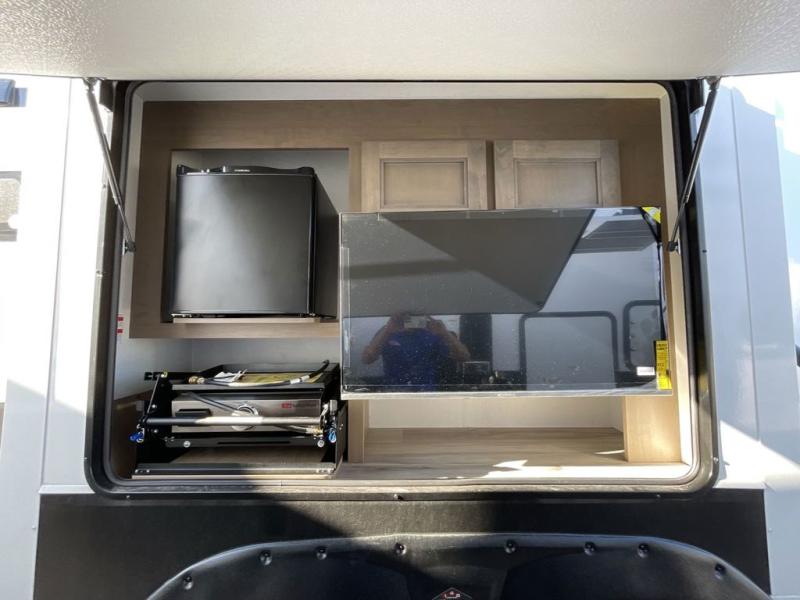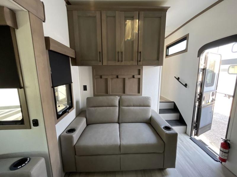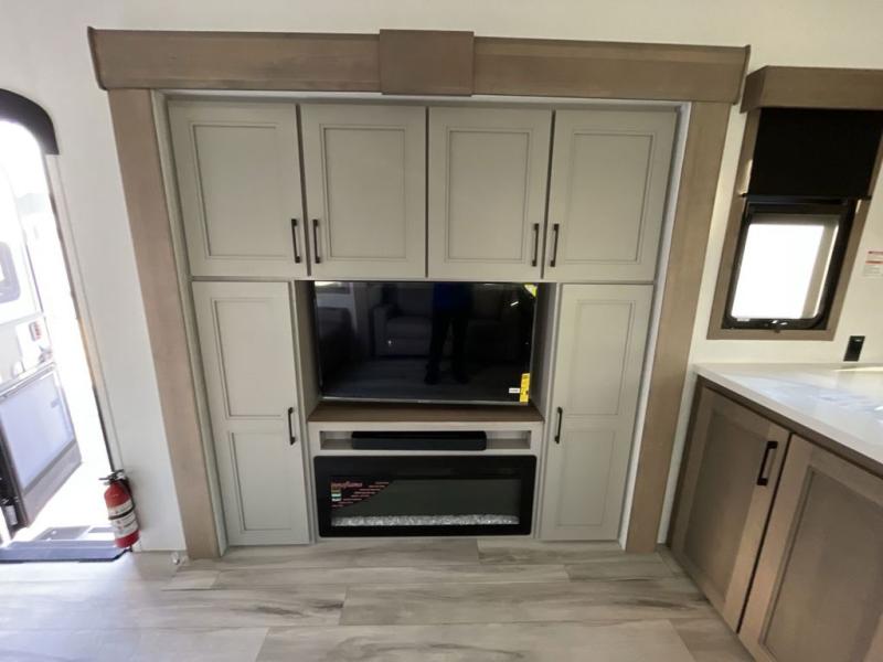 The chef will love cooking in the rear kitchen of this fifth wheel! They could even cook the catch of the day on the outside griddle while enjoying a cold beverage from the refrigerator, plus there is a smart TV at the outside kitchen. You can enjoy your meals at the table and chairs then lay down on the hide-a-bed sofa after stuffing yourself full. The theater seating with USB charging also offers a comfortable place to relax in front of the 40" fireplace at the entertainment center. Freshen up each morning in the full bathroom with the 48" x 30" residential shower with a seat and easily grab your towel from the linen closet next to it. When you're ready to wind down your nights, head to the front private bedroom to change into your pajamas stored in the dresser or from the front wardrobe with washer and dryer prep. There is also a king bed slide out or you can choose the optional queen bed if you want more floor space.