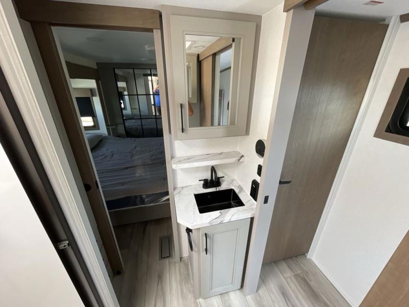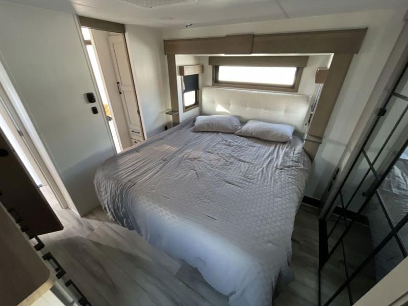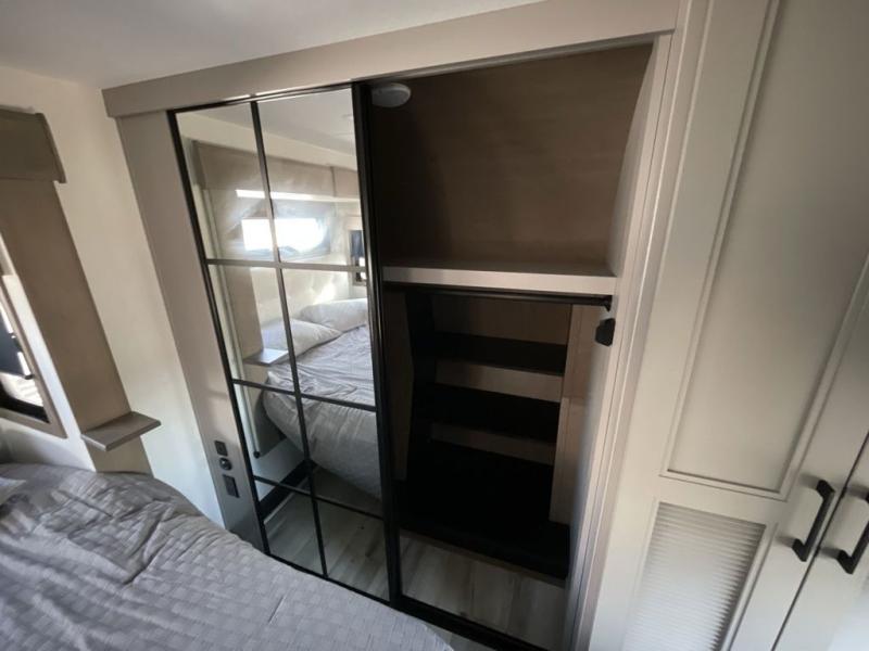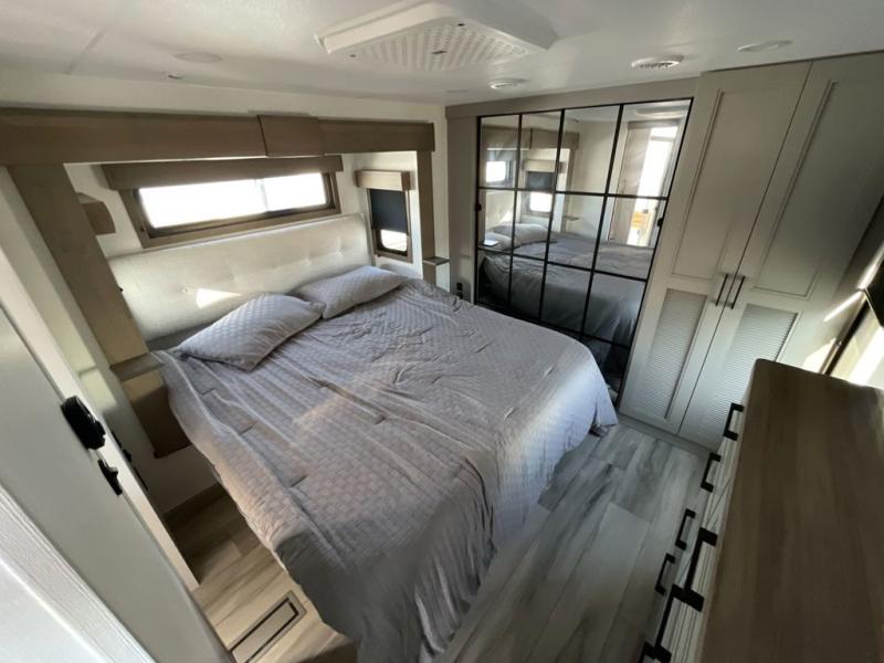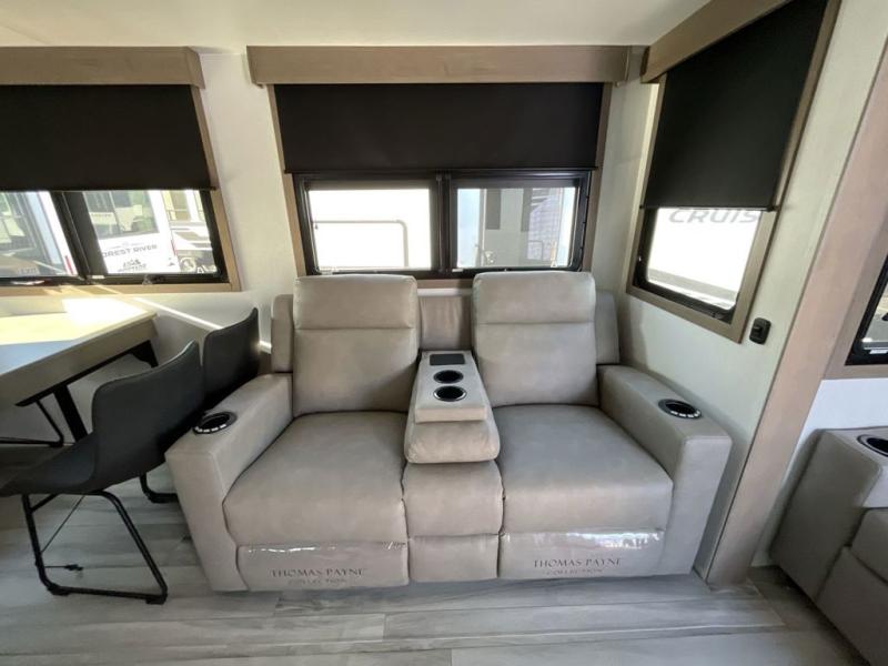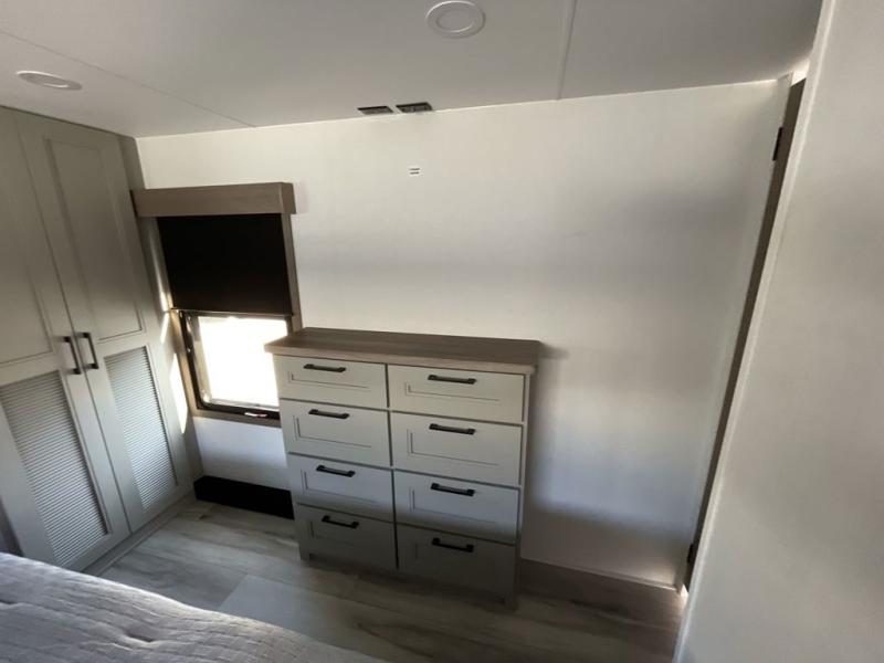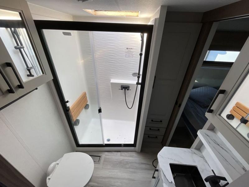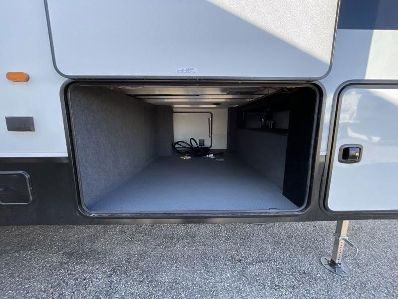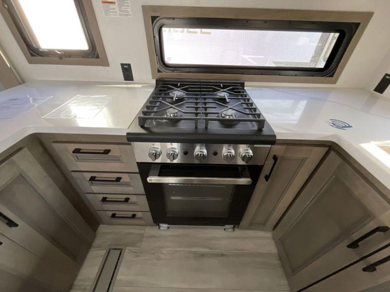The chef will love cooking in the rear kitchen of this fifth wheel! They could even cook the catch of the day on the outside griddle while enjoying a cold beverage from the refrigerator, plus there is a smart TV at the outside kitchen. You can enjoy your meals at the table and chairs then lay down on the hide-a-bed sofa after stuffing yourself full. The theater seating with USB charging also offers a comfortable place to relax in front of the 40" fireplace at the entertainment center. Freshen up each morning in the full bathroom with the 48" x 30" residential shower with a seat and easily grab your towel from the linen closet next to it. When you're ready to wind down your nights, head to the front private bedroom to change into your pajamas stored in the dresser or from the front wardrobe with washer and dryer prep. There is also a king bed slide out or you can choose the optional queen bed if you want more floor space.