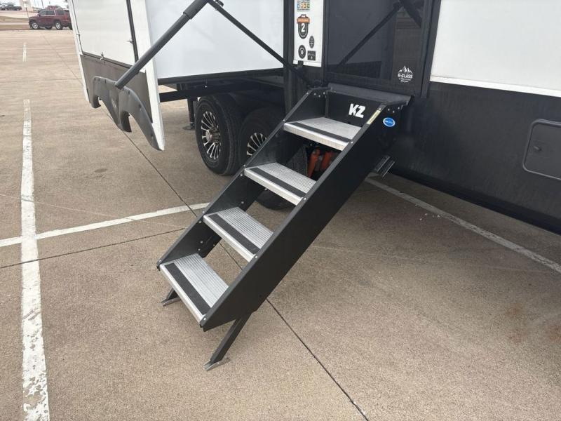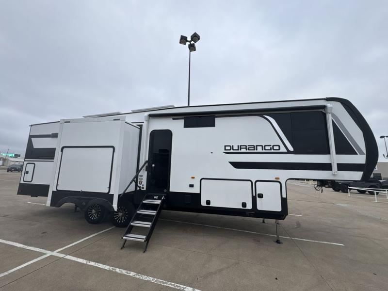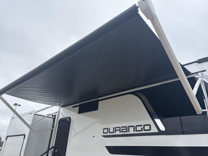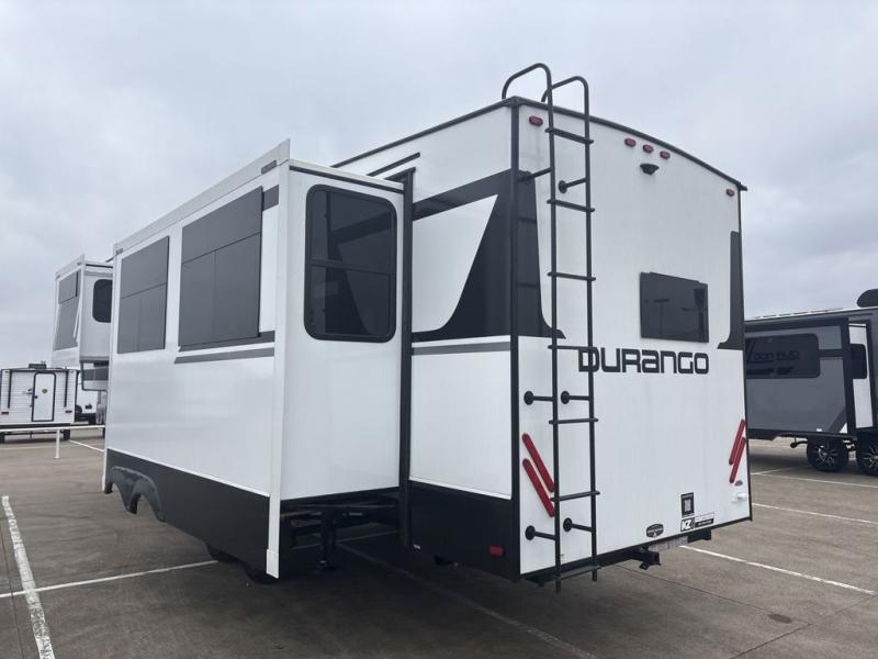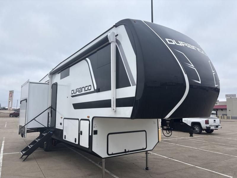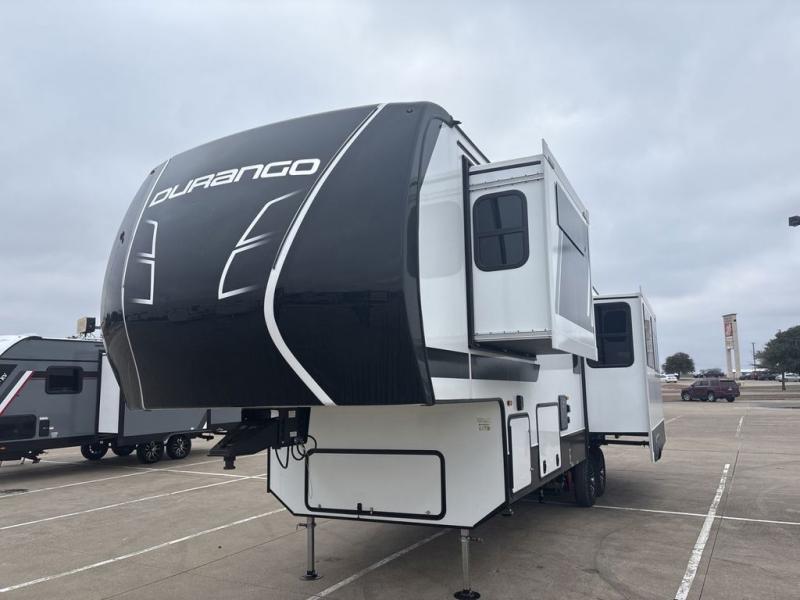 Enjoy full time living, an affordable price, and a wide body construction for more living space with every one of these KZ Durango light high-profile fifth wheels! These luxury units can be used all year round with the all-weather insulation package, the 3" x 14" foam-core in-floor straight-line heating system with a 35,000 BTU furnace, and the 15,000 BTU ducted roof A/C which optimizes the airflow by an average of 40% for better performance, cooling time, and reduction of noise. A few other construction features you will appreciate include a one piece, seamless walk-on Tufflex roofing material, Pex® in-floor heated waterlines, and a Lamilux® gelcoat fiberglass exterior. Inside, blancher maple & morel fog cabinetry , a king size bed, and smart TVs will have you feeling like you never left home!