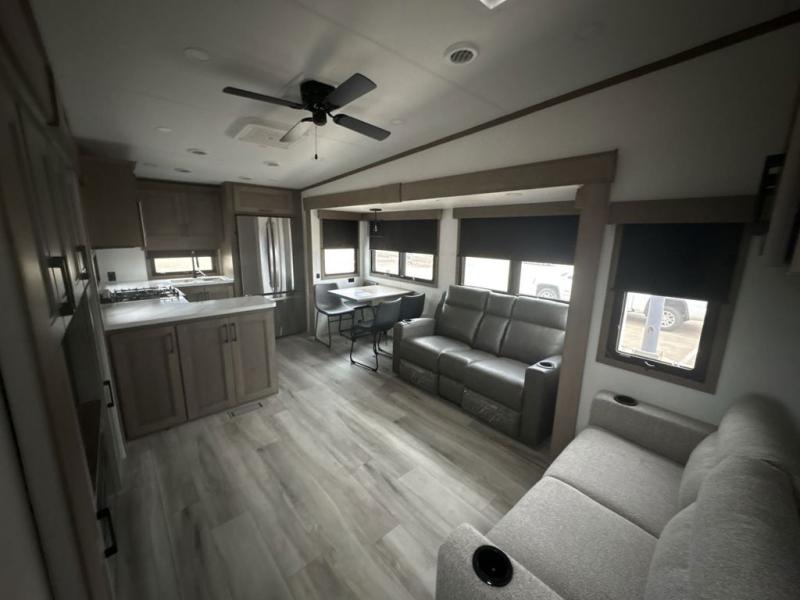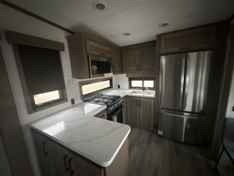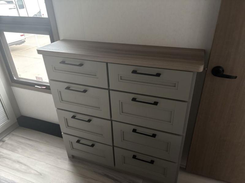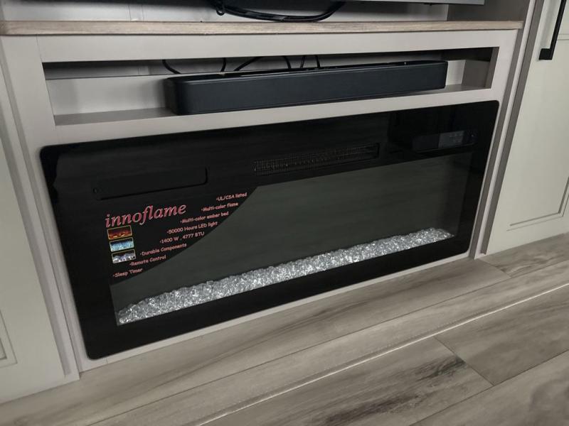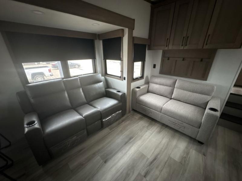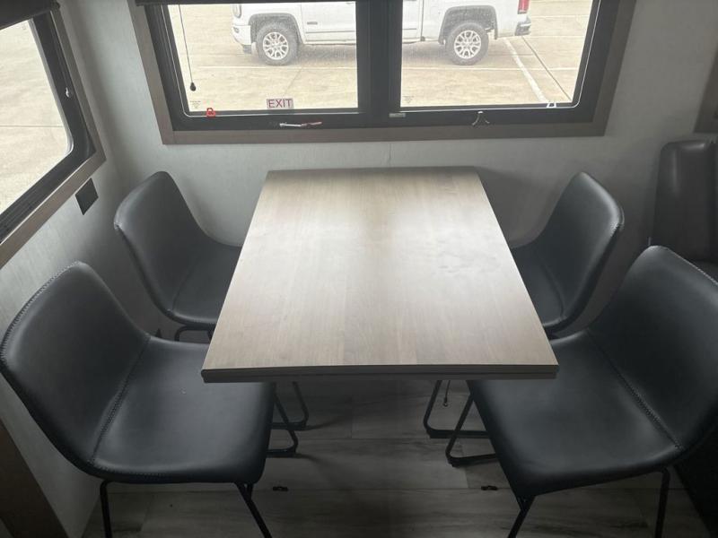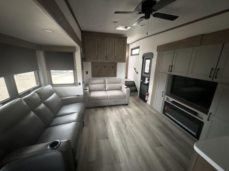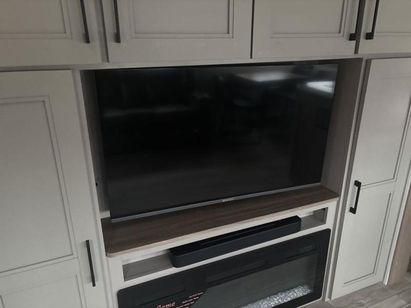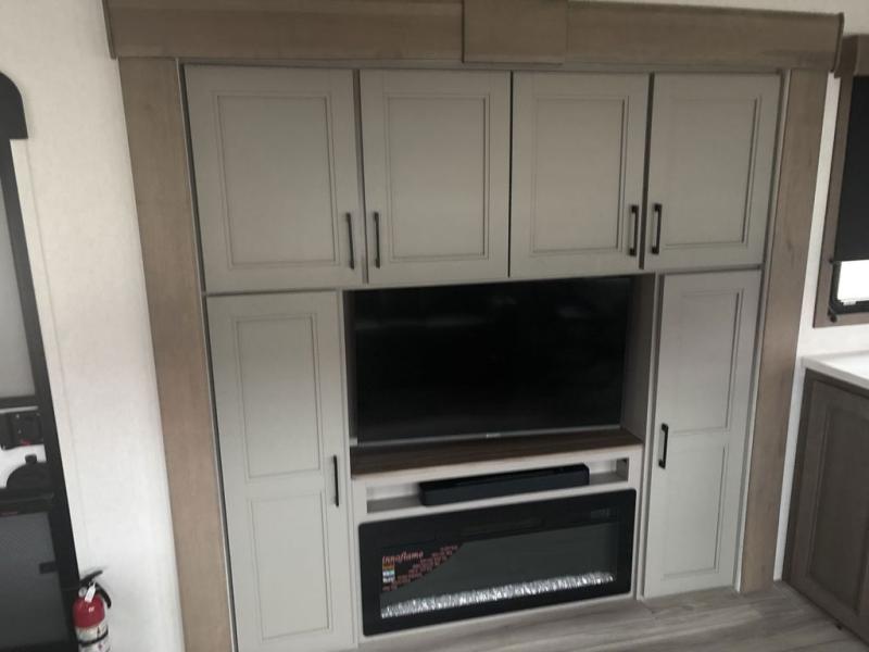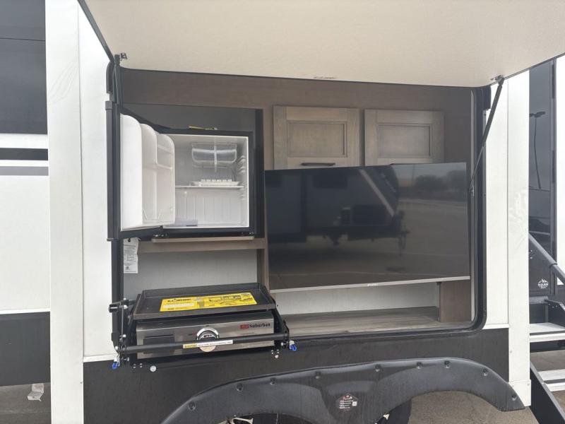 The chef will love cooking in the rear kitchen of this fifth wheel! They could even cook the catch of the day on the outside griddle while enjoying a cold beverage from the refrigerator, plus there is a smart TV at the outside kitchen. You can enjoy your meals at the table and chairs then lay down on the hide-a-bed sofa after stuffing yourself full. The theater seating with USB charging also offers a comfortable place to relax in front of the 40" fireplace at the entertainment center. Freshen up each morning in the full bathroom with the 48" x 30" residential shower with a seat and easily grab your towel from the linen closet next to it. When you're ready to wind down your nights, head to the front private bedroom to change into your pajamas stored in the dresser or from the front wardrobe with washer and dryer prep. There is also a king bed slide out or you can choose the optional queen bed if you want more floor space.