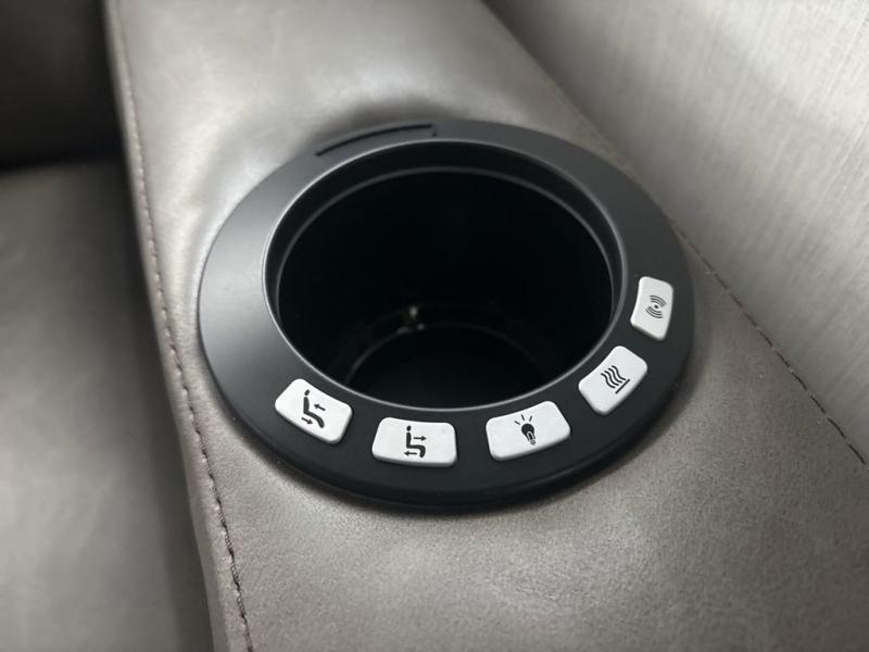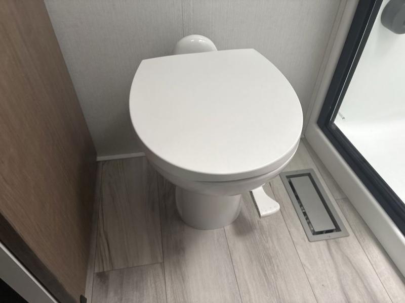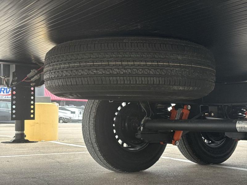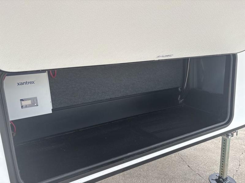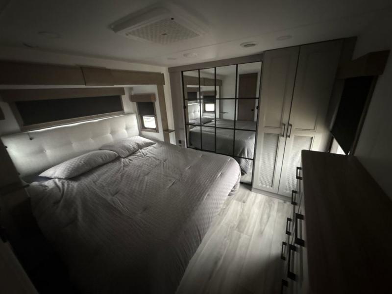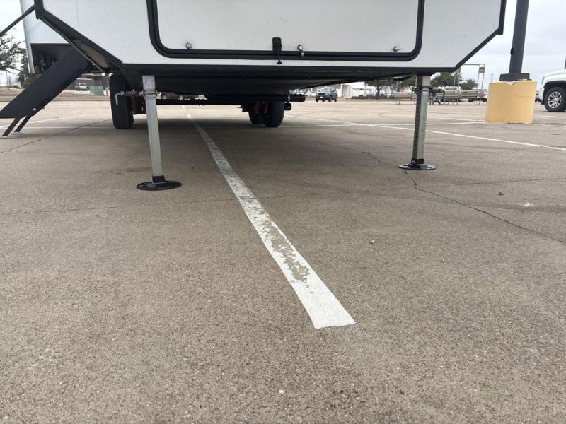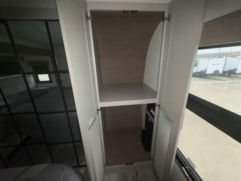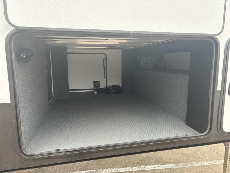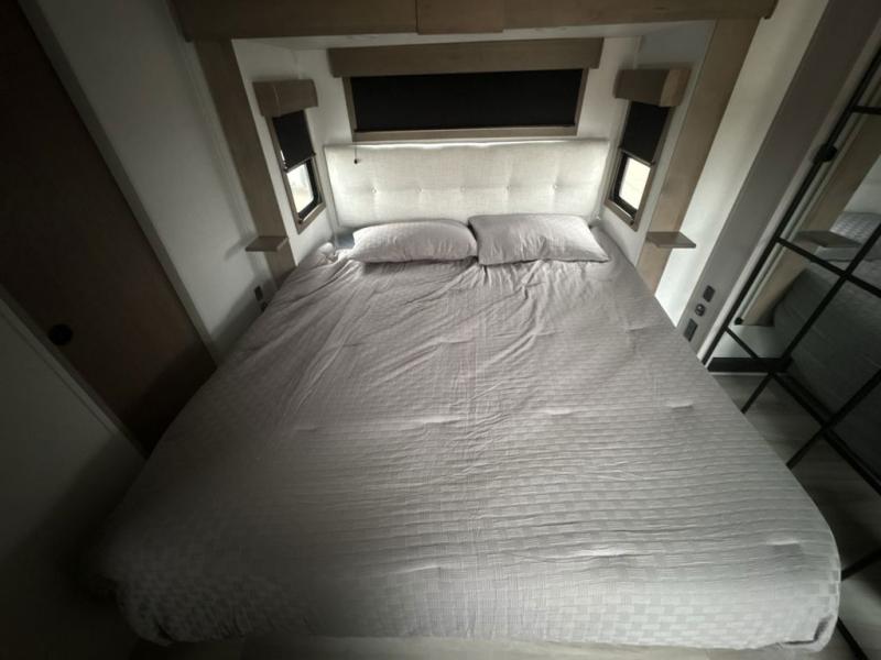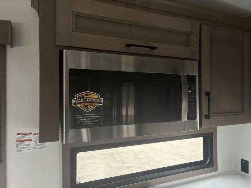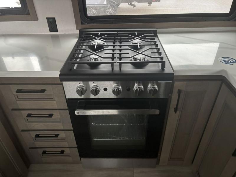 The chef will love cooking in the rear kitchen of this fifth wheel! They could even cook the catch of the day on the outside griddle while enjoying a cold beverage from the refrigerator, plus there is a smart TV at the outside kitchen. You can enjoy your meals at the table and chairs then lay down on the hide-a-bed sofa after stuffing yourself full. The theater seating with USB charging also offers a comfortable place to relax in front of the 40" fireplace at the entertainment center. Freshen up each morning in the full bathroom with the 48" x 30" residential shower with a seat and easily grab your towel from the linen closet next to it. When you're ready to wind down your nights, head to the front private bedroom to change into your pajamas stored in the dresser or from the front wardrobe with washer and dryer prep. There is also a king bed slide out or you can choose the optional queen bed if you want more floor space.