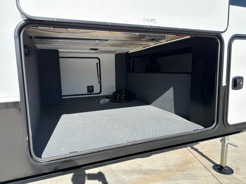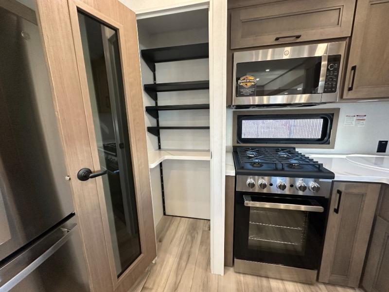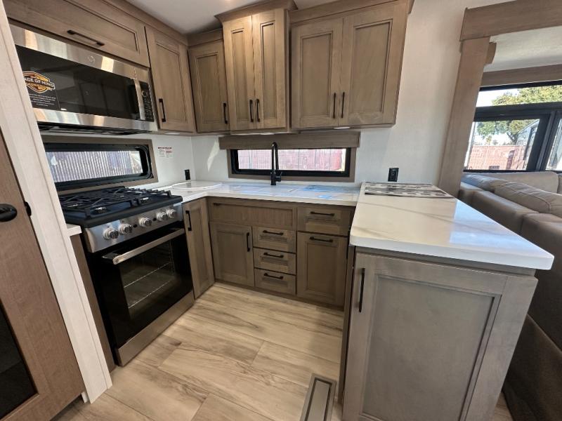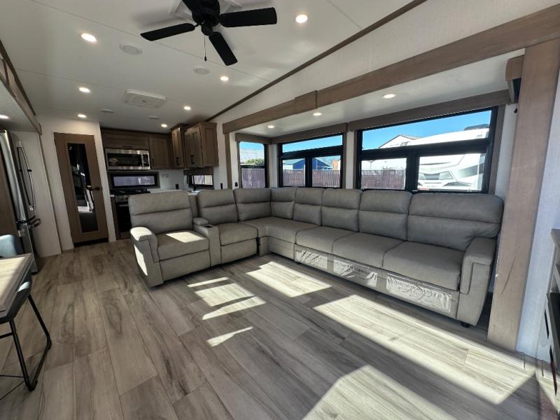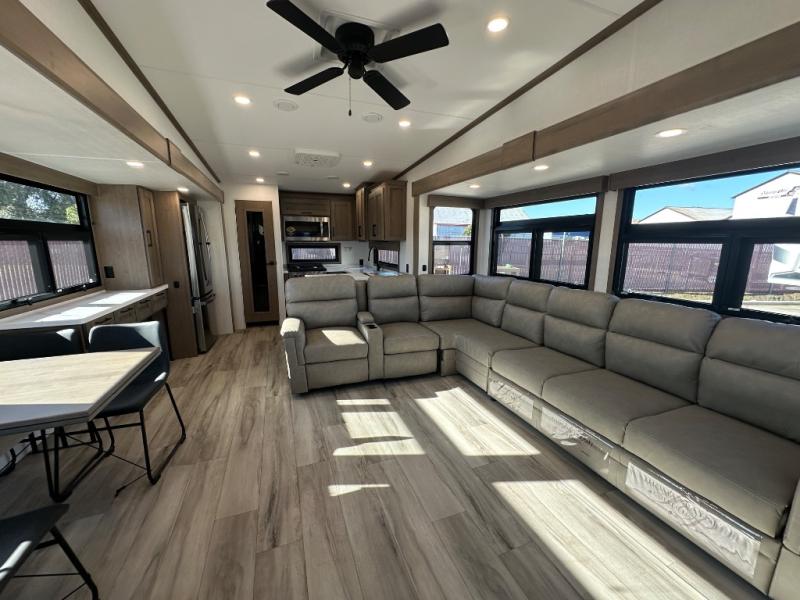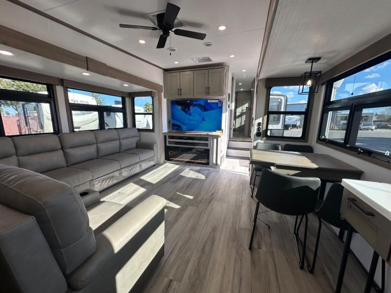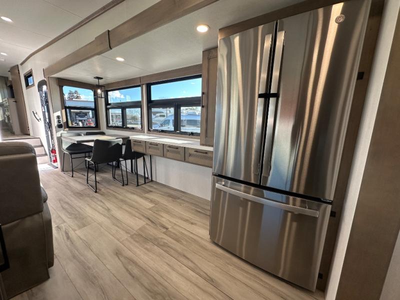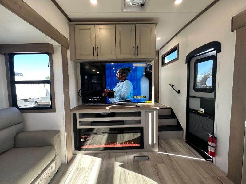 Start camping in luxury with this fifth wheel! The front private bedroom has a king bed slide which can be switched for an optional queen instead, a dresser, and a front wardrobe with washer and dryer prep. Start each morning feeling clean and fresh after showering in the 48" x 30" residential shower with a seat in the full bathroom. The kitchen has an island ideal for enjoying your morning coffee while reading the newspaper and socializing with the chef whipping up some scrambled eggs on the four burner range. The hutch can store your dishes, the pantry can store your canned goods, and the 18 cu. ft. refrigerator will keep your perishables fresh. If mother nature is raining on your parade then read a book on the rear hide-a-bed sofa or relax in the theater seating which has USB charging. And the entertainment center with a fireplace and 43" smart LED TV will keep you entertained!