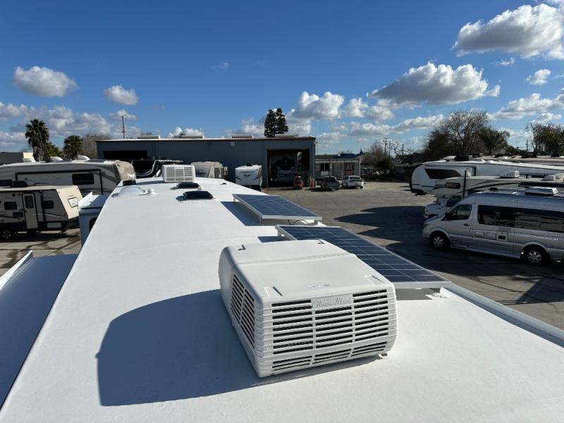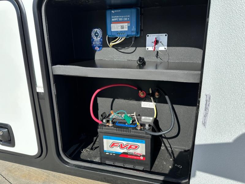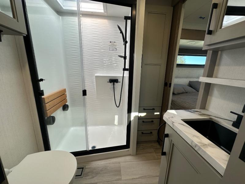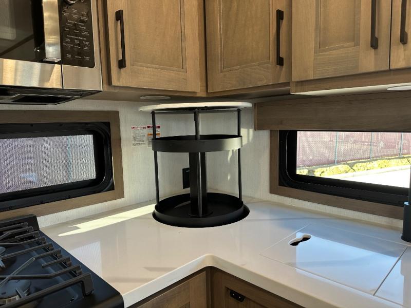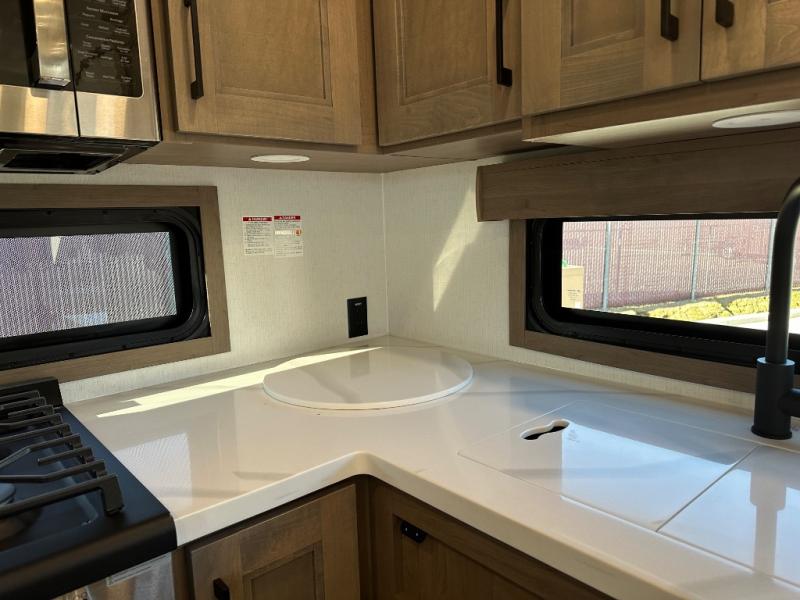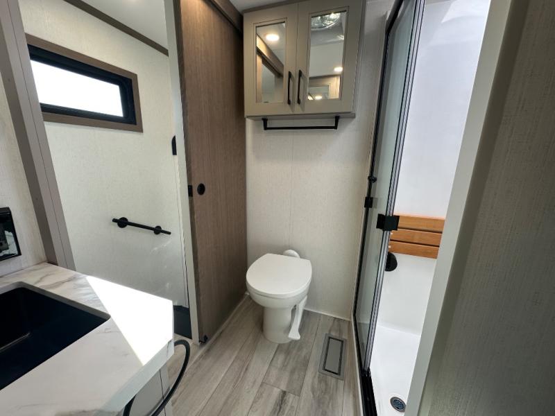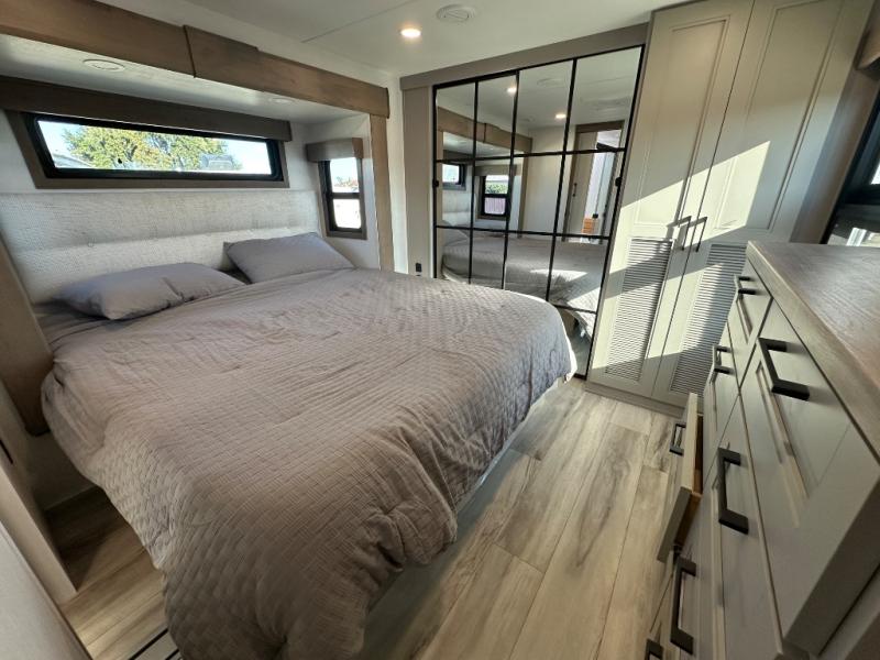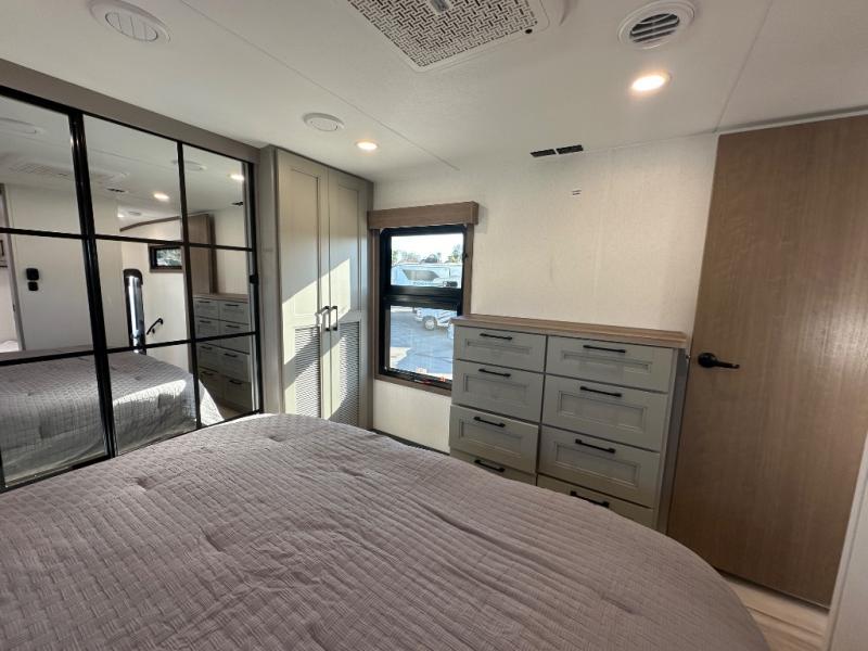 Start camping in luxury with this fifth wheel! The front private bedroom has a king bed slide which can be switched for an optional queen instead, a dresser, and a front wardrobe with washer and dryer prep. Start each morning feeling clean and fresh after showering in the 48" x 30" residential shower with a seat in the full bathroom. The kitchen has an island ideal for enjoying your morning coffee while reading the newspaper and socializing with the chef whipping up some scrambled eggs on the four burner range. The hutch can store your dishes, the pantry can store your canned goods, and the 18 cu. ft. refrigerator will keep your perishables fresh. If mother nature is raining on your parade then read a book on the rear hide-a-bed sofa or relax in the theater seating which has USB charging. And the entertainment center with a fireplace and 43" smart LED TV will keep you entertained!