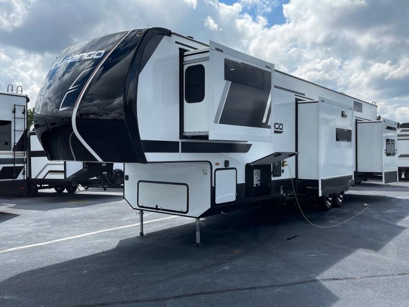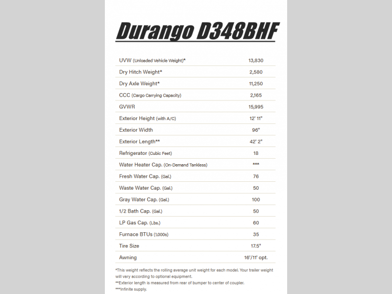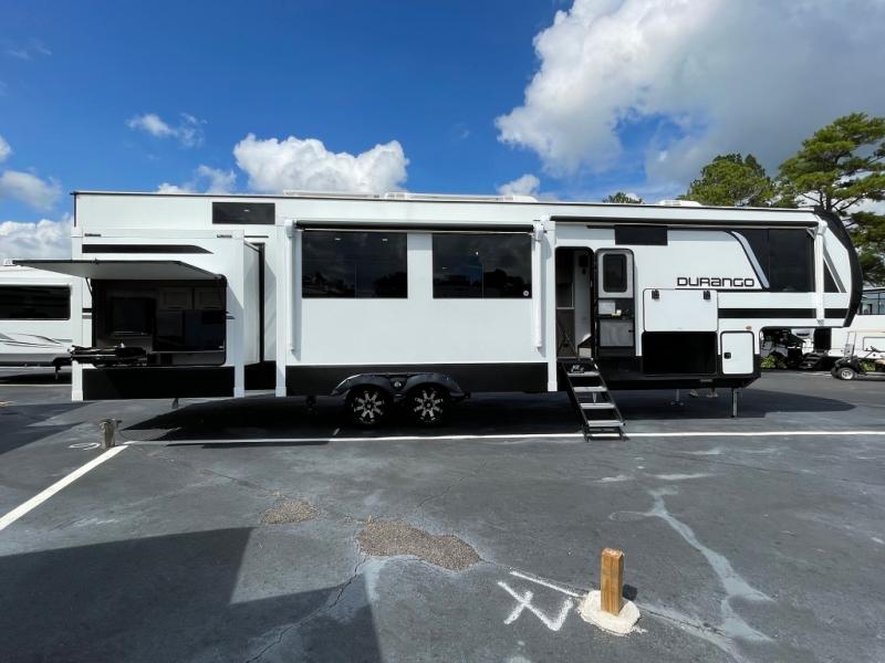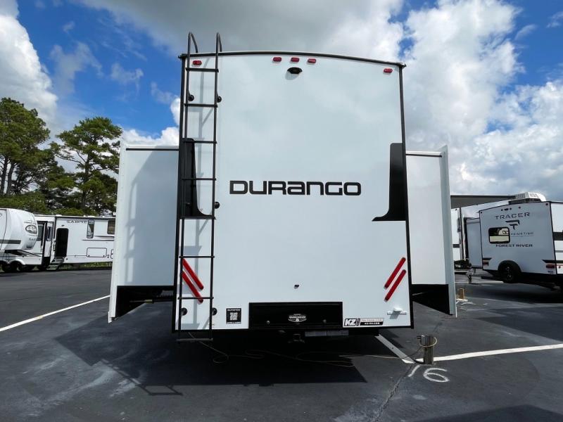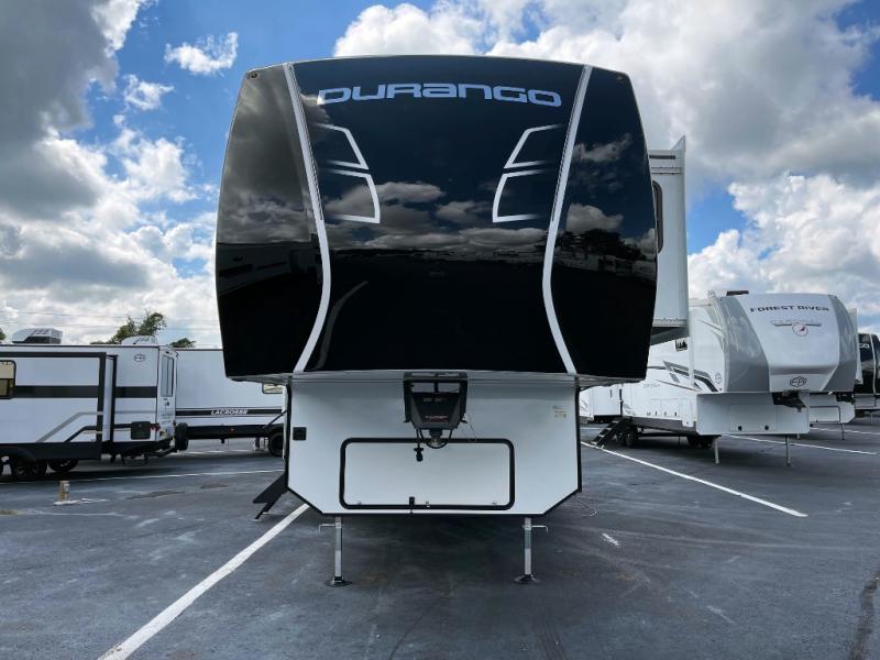 Enjoy full time living, an affordable price, and a wide body construction for more living space with every one of these KZ Durango light high-profile fifth wheels! These luxury units can be used all year round with the all-weather insulation package, the 3" x 14" foam-core in-floor straight-line heating system with a 35,000 BTU furnace, and the 15,000 BTU ducted roof A/C which optimizes the airflow by an average of 40% for better performance, cooling time, and reduction of noise. A few other construction features you will appreciate include a one piece, seamless walk-on Tufflex roofing material, Pex® in-floor heated waterlines, and a Lamilux® gelcoat fiberglass exterior. Inside, blancher maple & morel fog cabinetry , a king size bed, and smart TVs will have you feeling like you never left home!