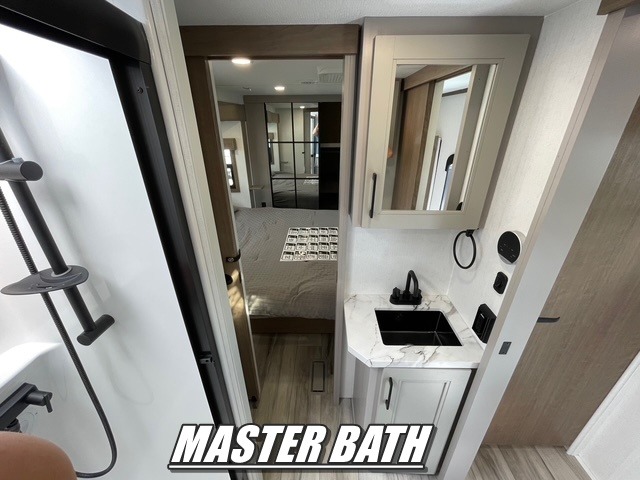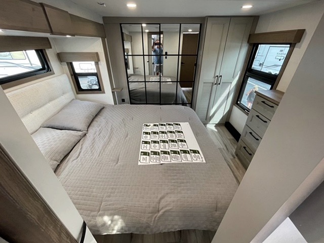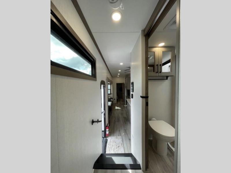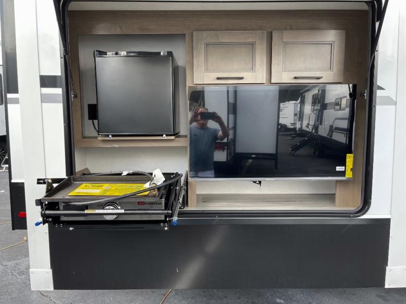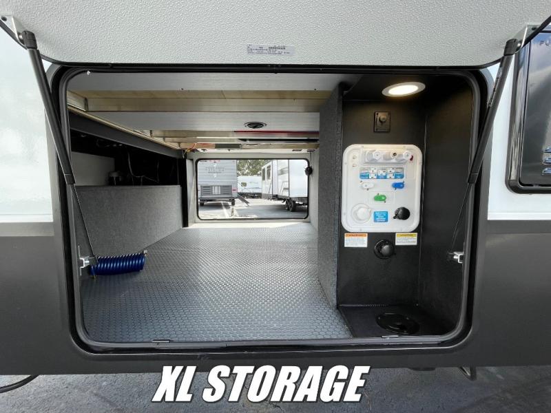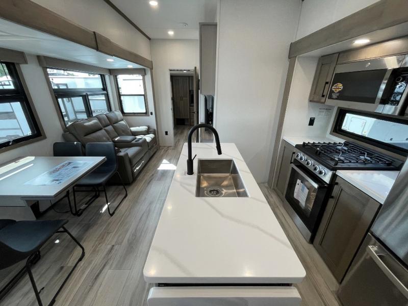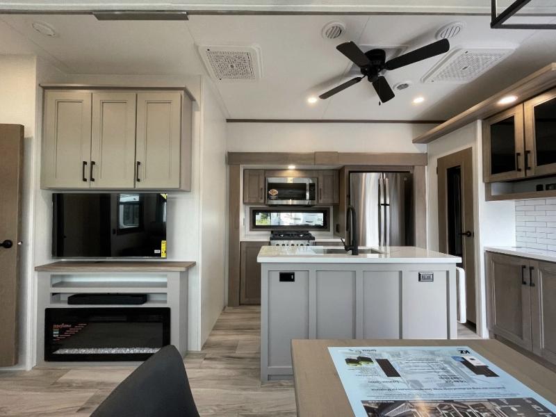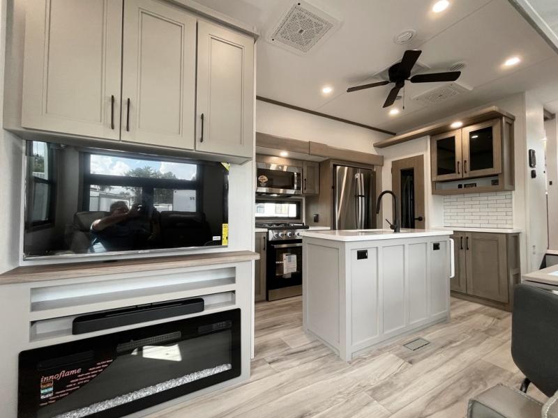 All of your friends and family can camp together in this fifth wheel! It features a rear private bunkhouse with a bunk above a hide-a-bed sofa, a full bathroom with a 30" x 36" shower, and an entertainment center with wardrobes on either side. There is also a folding bunk and a bunk over the outside kitchen. Across from the hide-a-bed sofa is an entertainment center with a 40" fireplace and a 43" smart TV to watch your favorite movies at night. The kitchen island will allow you to cook with ease and you can prepare your best meals with the four burner range with a 24" oven. The second bathroom has a residential shower with a seat and a linen closet to keep your towel close. Enjoy a good night's rest on the king bed slide in the front private bedroom which also has a dresser and a front wardrobe with washer and dryer prep!