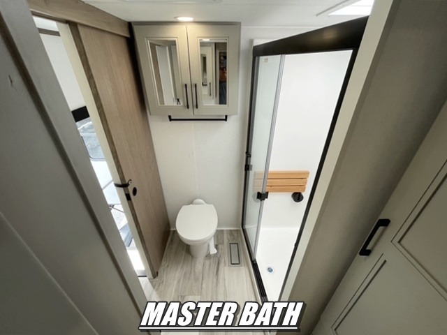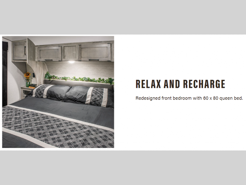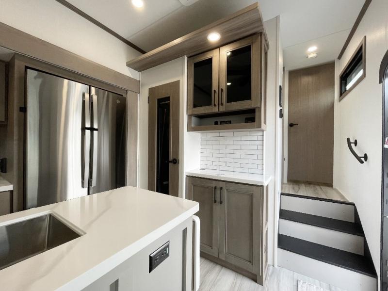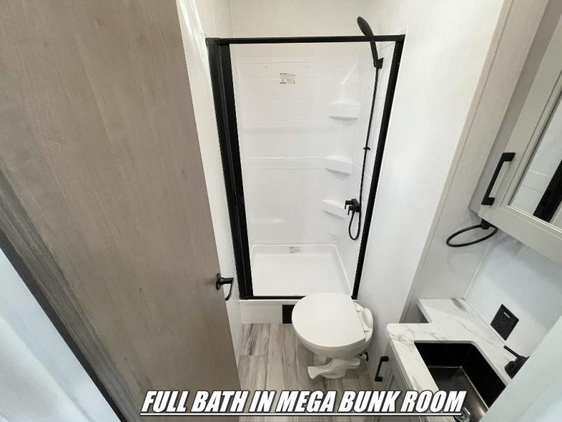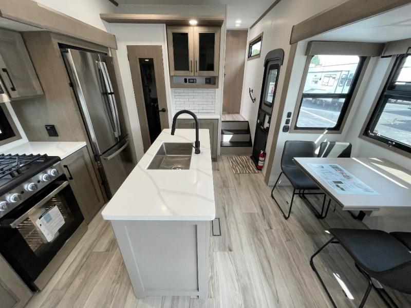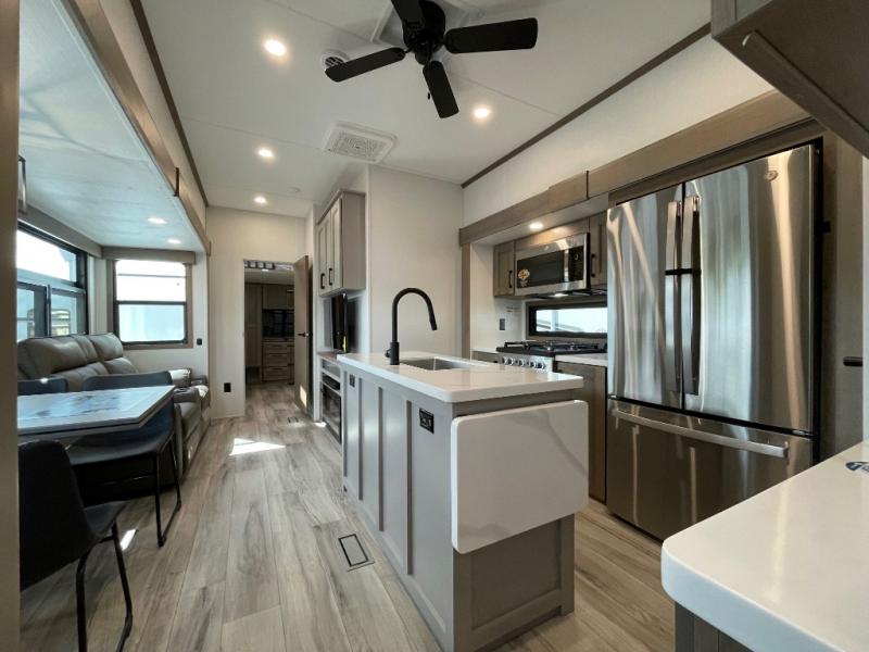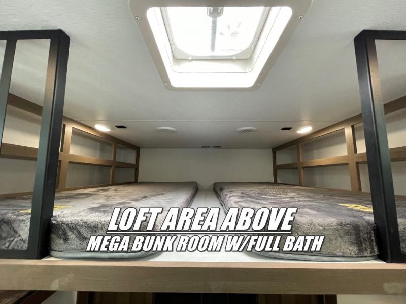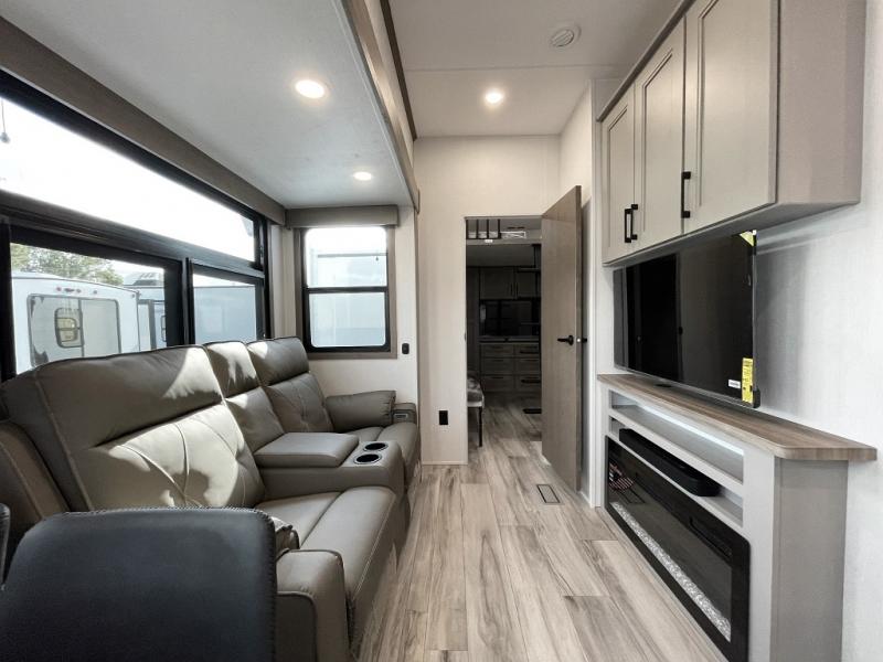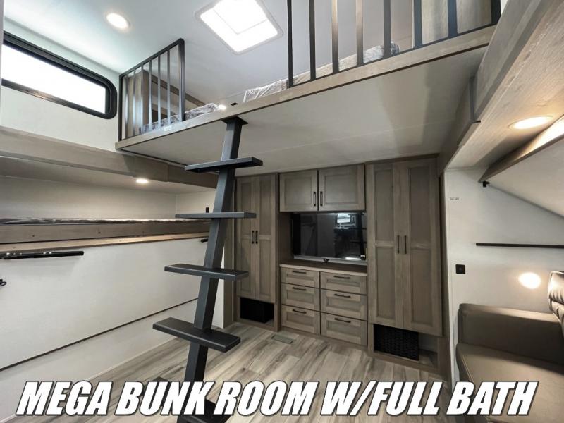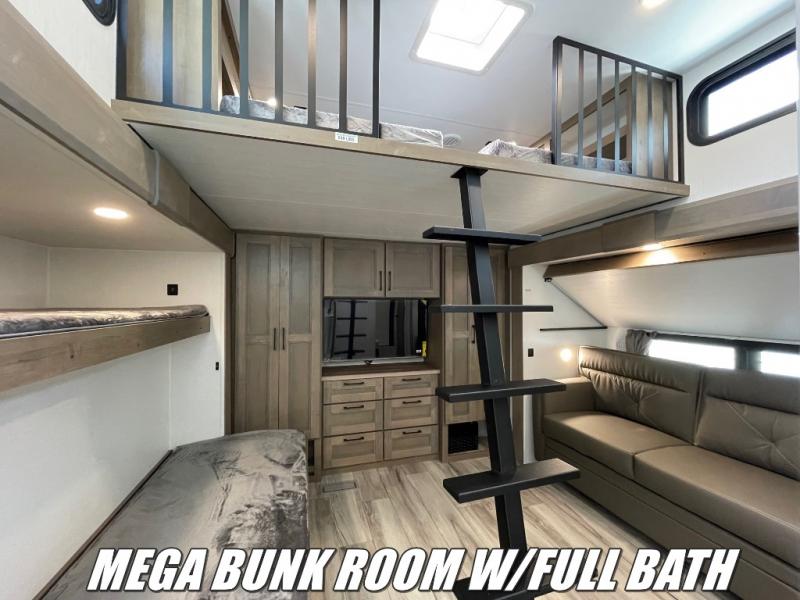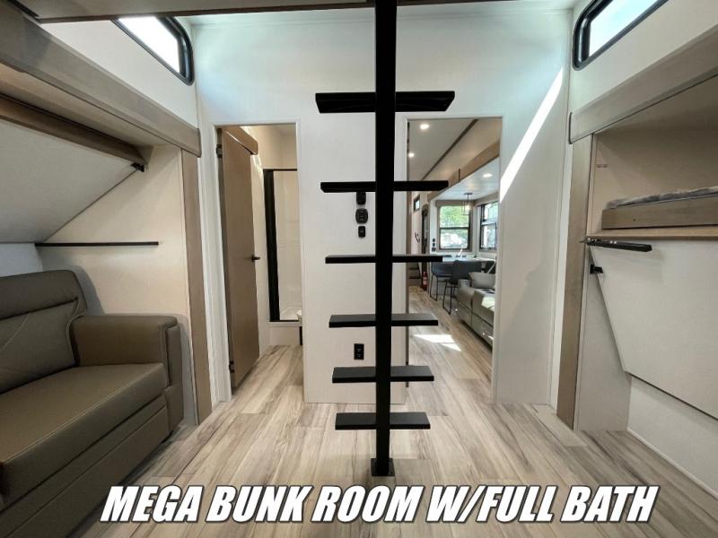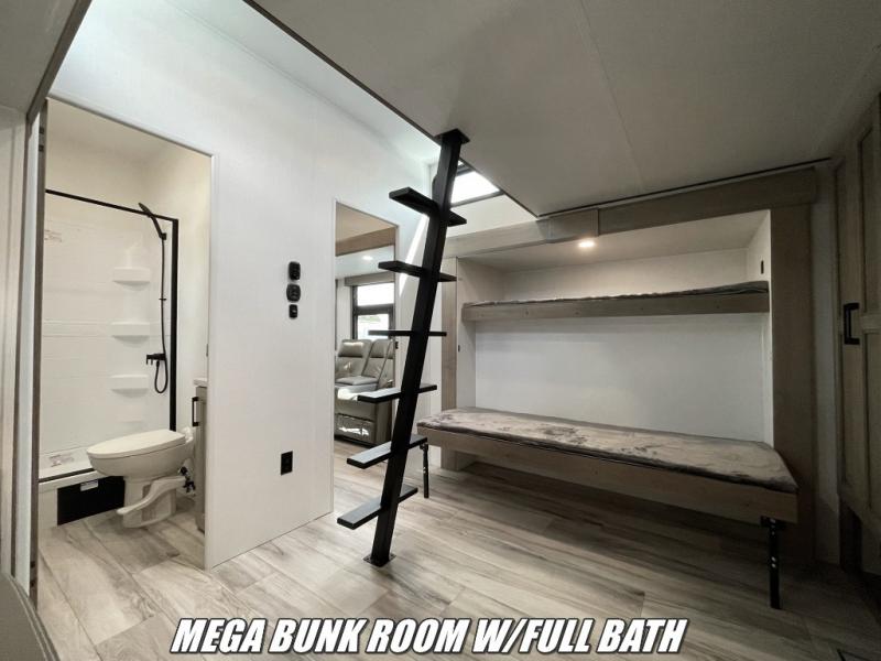 All of your friends and family can camp together in this fifth wheel! It features a rear private bunkhouse with a bunk above a hide-a-bed sofa, a full bathroom with a 30" x 36" shower, and an entertainment center with wardrobes on either side. There is also a folding bunk and a bunk over the outside kitchen. Across from the hide-a-bed sofa is an entertainment center with a 40" fireplace and a 43" smart TV to watch your favorite movies at night. The kitchen island will allow you to cook with ease and you can prepare your best meals with the four burner range with a 24" oven. The second bathroom has a residential shower with a seat and a linen closet to keep your towel close. Enjoy a good night's rest on the king bed slide in the front private bedroom which also has a dresser and a front wardrobe with washer and dryer prep!