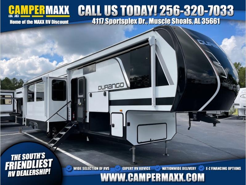 Enjoy full time living, an affordable price, and a wide body construction for more living space with every one of these KZ Durango light high-profile fifth wheels! These luxury units can be used all year round with the all-weather insulation package, the 3" x 14" foam-core in-floor straight-line heating system with a 35,000 BTU furnace, and the 15,000 BTU ducted roof A/C which optimizes the airflow by an average of 40% for better performance, cooling time, and reduction of noise. A few other construction features you will appreciate include a one piece, seamless walk-on Tufflex roofing material, Pex® in-floor heated waterlines, and a Lamilux® gelcoat fiberglass exterior. Inside, blancher maple & morel fog cabinetry , a king size bed, and smart TVs will have you feeling like you never left home!