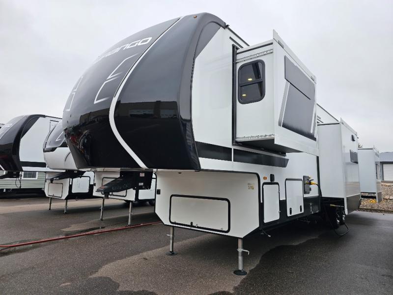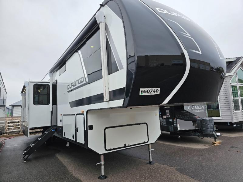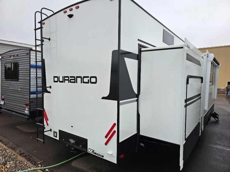 Enjoy full time living, an affordable price, and a wide body construction for more living space with every one of these KZ Durango light high-profile fifth wheels! These luxury units can be used all year round with the all-weather insulation package, the 3" x 14" foam-core in-floor straight-line heating system with a 35,000 BTU furnace, and the 15,000 BTU ducted roof A/C which optimizes the airflow by an average of 40% for better performance, cooling time, and reduction of noise. A few other construction features you will appreciate include a one piece, seamless walk-on Tufflex roofing material, Pex® in-floor heated waterlines, and a Lamilux® gelcoat fiberglass exterior. Inside, blancher maple & morel fog cabinetry , a king size bed, and smart TVs will have you feeling like you never left home!