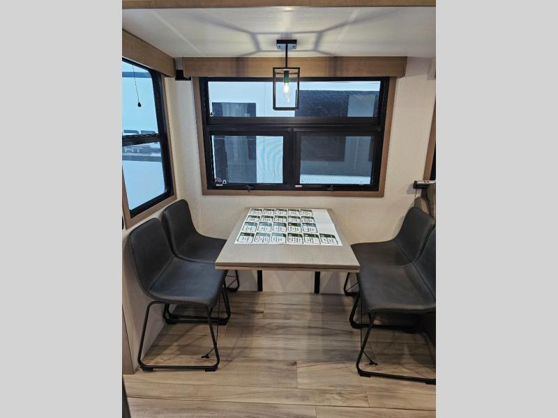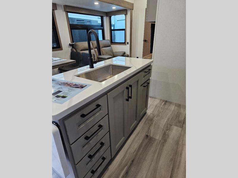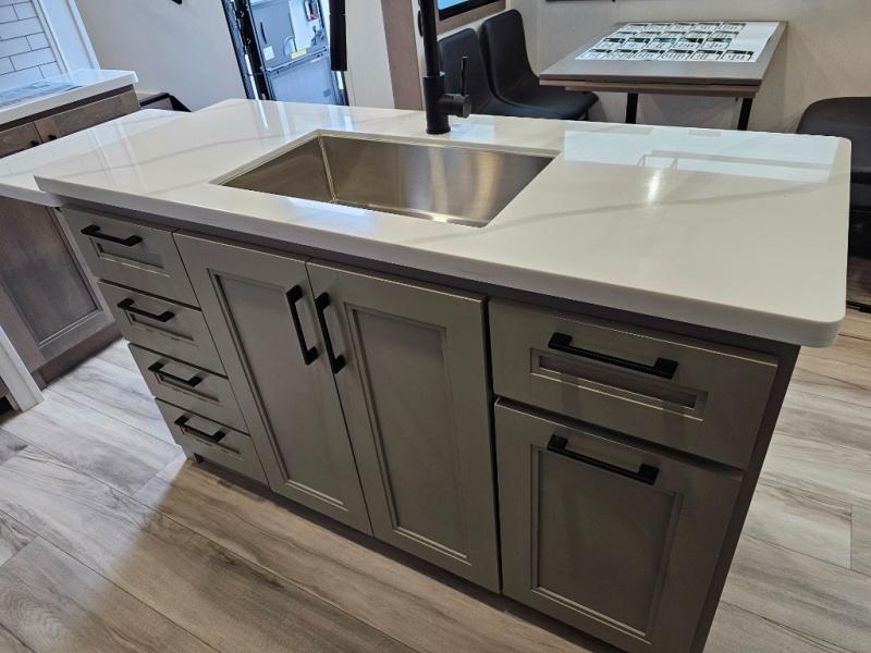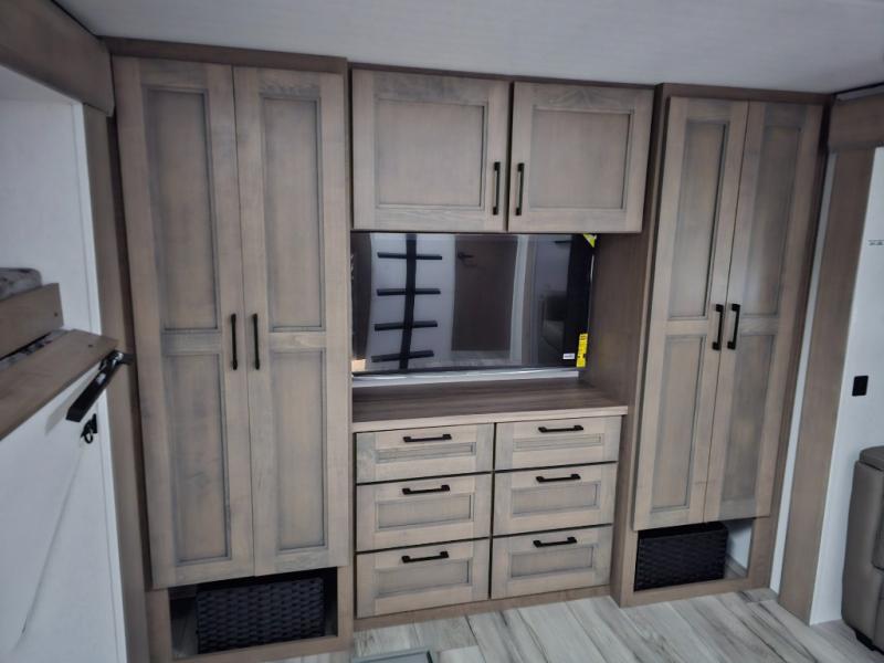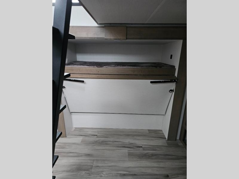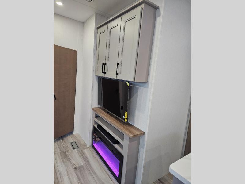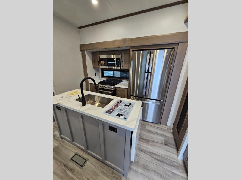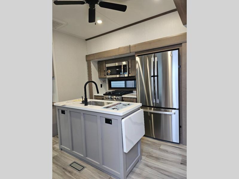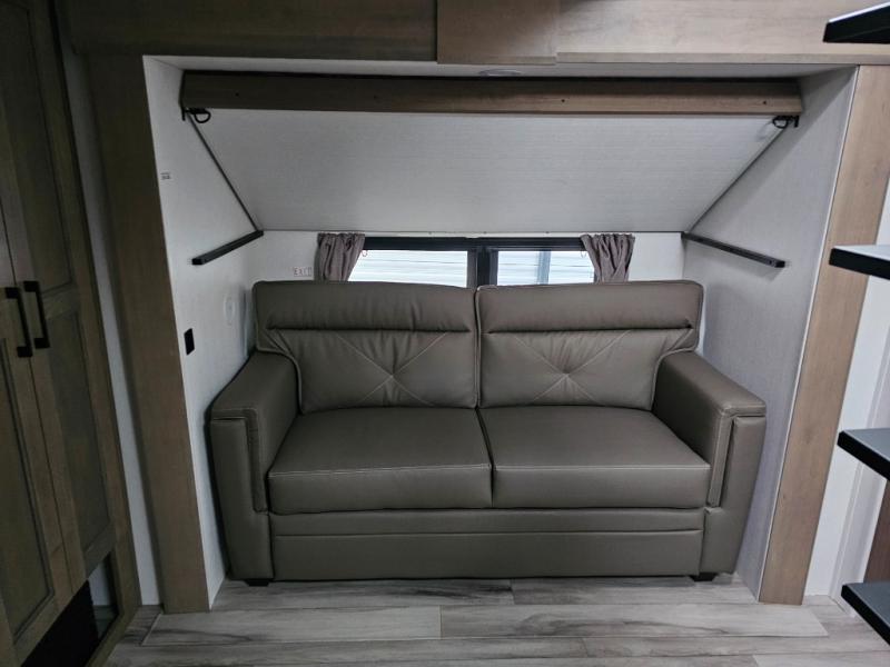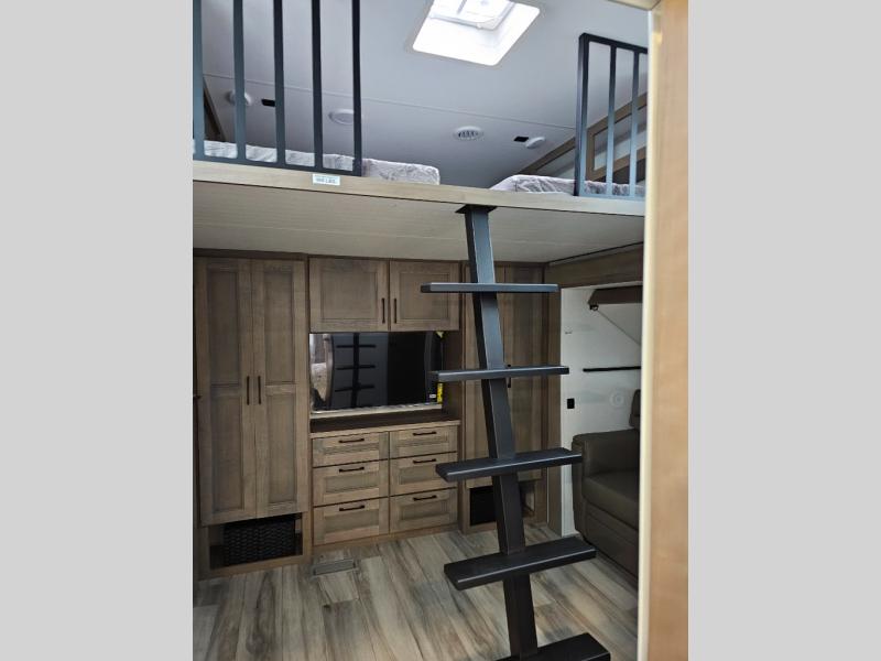 All of your friends and family can camp together in this fifth wheel! It features a rear private bunkhouse with a bunk above a hide-a-bed sofa, a full bathroom with a 30" x 36" shower, and an entertainment center with wardrobes on either side. There is also a folding bunk and a bunk over the outside kitchen. Across from the hide-a-bed sofa is an entertainment center with a 40" fireplace and a 43" smart TV to watch your favorite movies at night. The kitchen island will allow you to cook with ease and you can prepare your best meals with the four burner range with a 24" oven. The second bathroom has a residential shower with a seat and a linen closet to keep your towel close. Enjoy a good night's rest on the king bed slide in the front private bedroom which also has a dresser and a front wardrobe with washer and dryer prep!