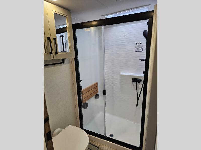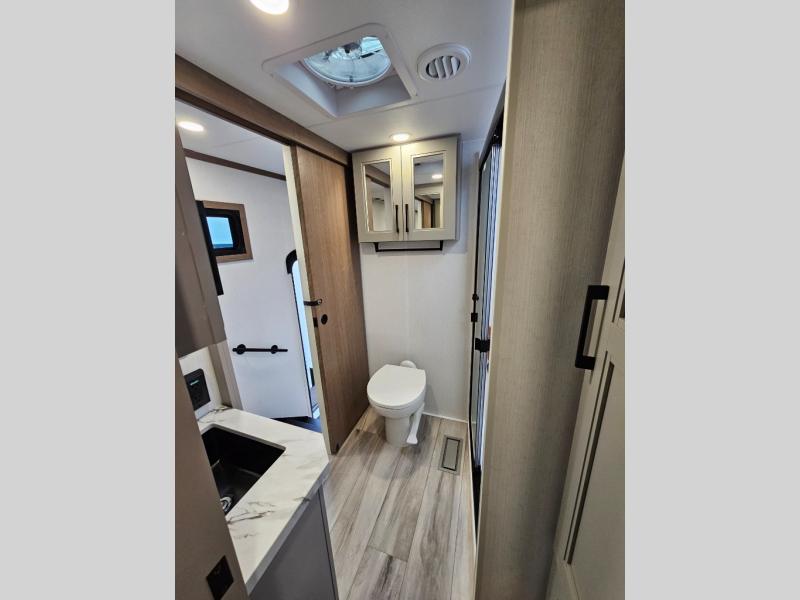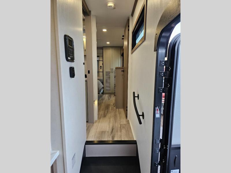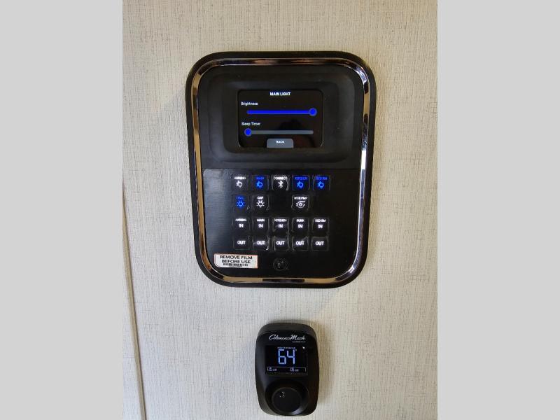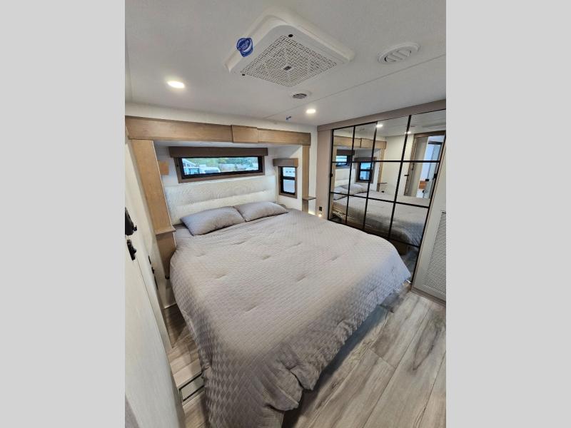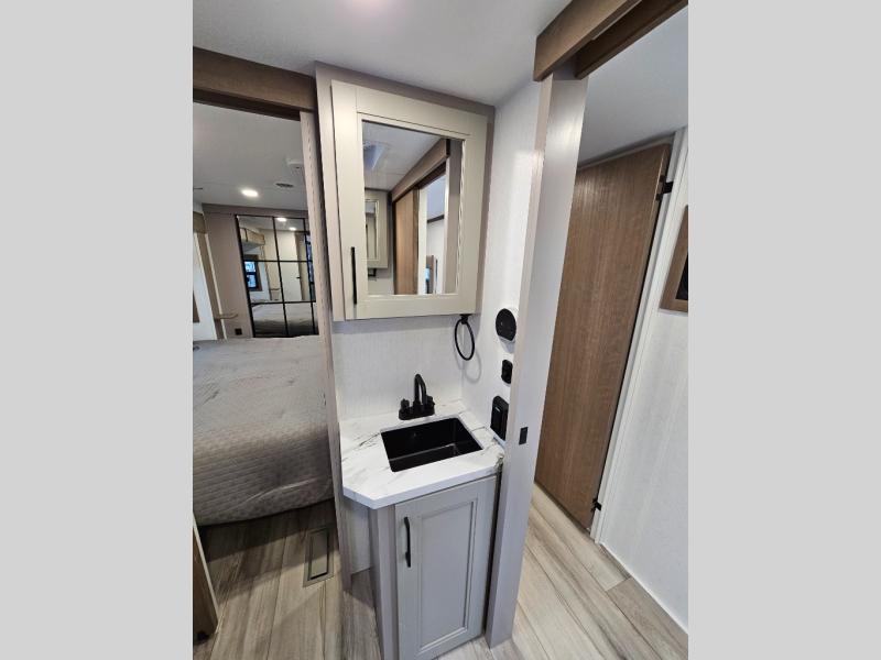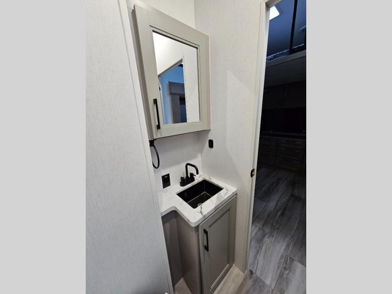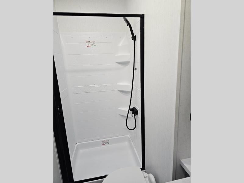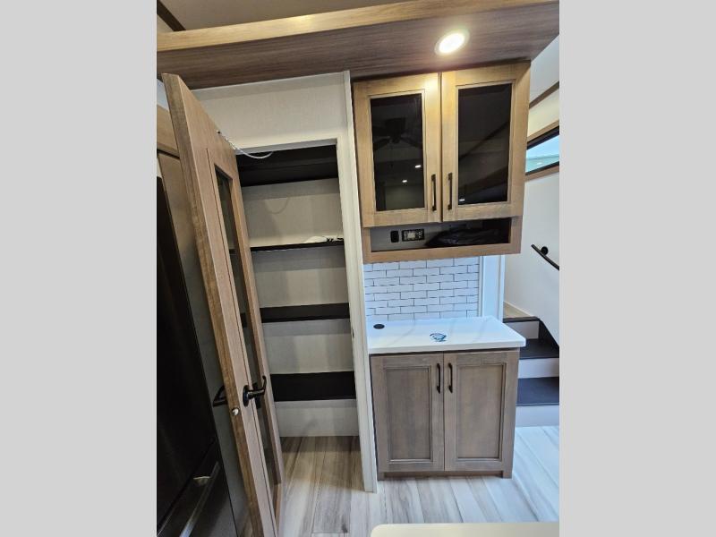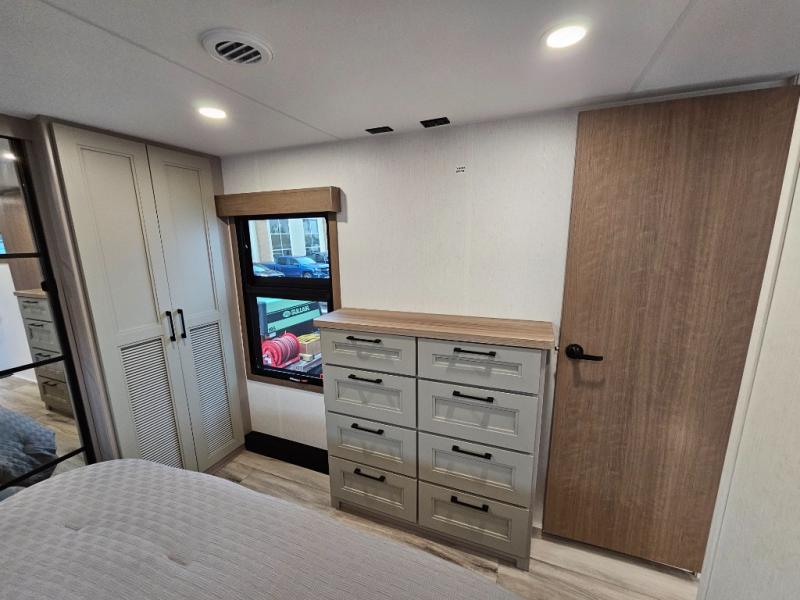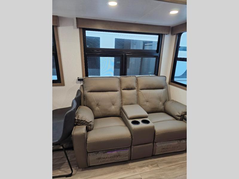All of your friends and family can camp together in this fifth wheel! It features a rear private bunkhouse with a bunk above a hide-a-bed sofa, a full bathroom with a 30" x 36" shower, and an entertainment center with wardrobes on either side. There is also a folding bunk and a bunk over the outside kitchen. Across from the hide-a-bed sofa is an entertainment center with a 40" fireplace and a 43" smart TV to watch your favorite movies at night. The kitchen island will allow you to cook with ease and you can prepare your best meals with the four burner range with a 24" oven. The second bathroom has a residential shower with a seat and a linen closet to keep your towel close. Enjoy a good night's rest on the king bed slide in the front private bedroom which also has a dresser and a front wardrobe with washer and dryer prep!