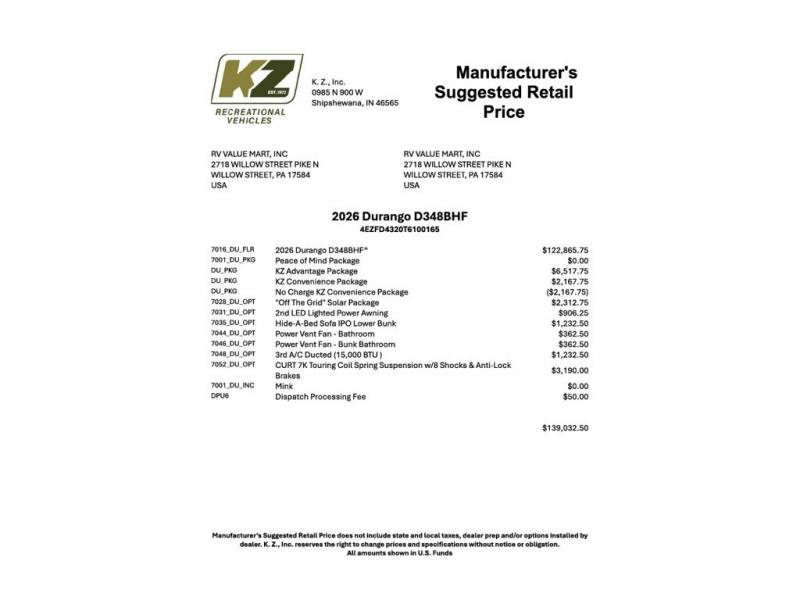 Enjoy full time living, an affordable price, and a wide body construction for more living space with every one of these KZ Durango light high-profile fifth wheels! These luxury units can be used all year round with the all-weather insulation package, the 3" x 14" foam-core in-floor straight-line heating system with a 35,000 BTU furnace, and the 15,000 BTU ducted roof A/C which optimizes the airflow by an average of 40% for better performance, cooling time, and reduction of noise. A few other construction features you will appreciate include a one piece, seamless walk-on Tufflex roofing material, Pex® in-floor heated waterlines, and a Lamilux® gelcoat fiberglass exterior. Inside, blancher maple & morel fog cabinetry , a king size bed, and smart TVs will have you feeling like you never left home!