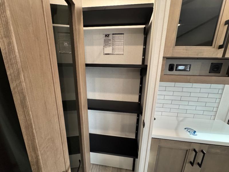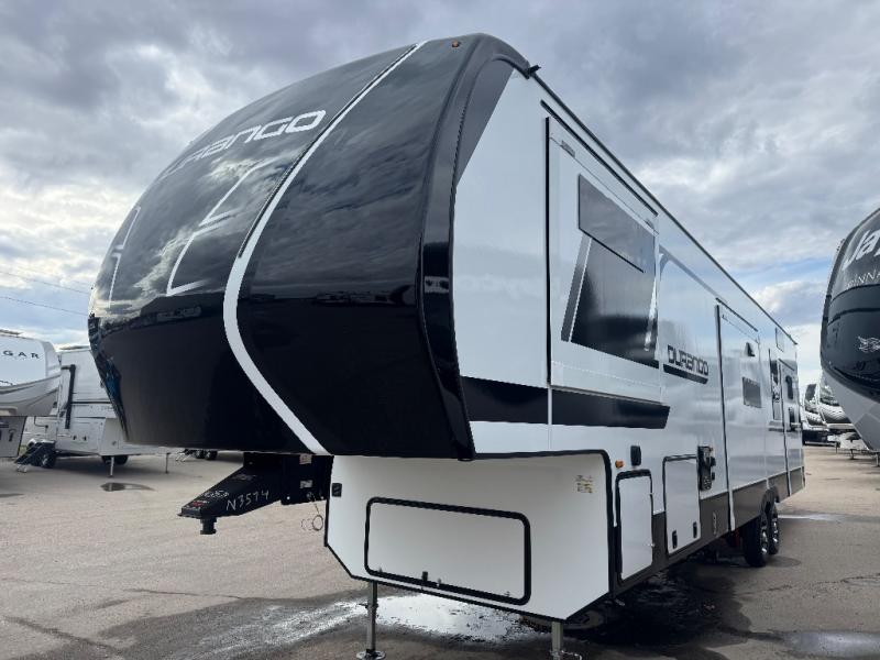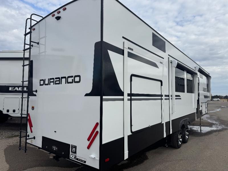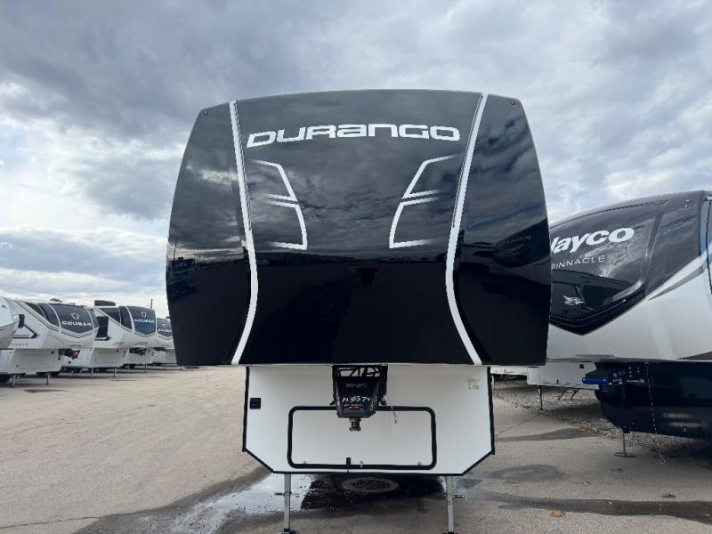 Enjoy full time living, an affordable price, and a wide body construction for more living space with every one of these KZ Durango light high-profile fifth wheels! These luxury units can be used all year round with the all-weather insulation package, the 3" x 14" foam-core in-floor straight-line heating system with a 35,000 BTU furnace, and the 15,000 BTU ducted roof A/C which optimizes the airflow by an average of 40% for better performance, cooling time, and reduction of noise. A few other construction features you will appreciate include a one piece, seamless walk-on Tufflex roofing material, Pex® in-floor heated waterlines, and a Lamilux® gelcoat fiberglass exterior. Inside, blancher maple & morel fog cabinetry , a king size bed, and smart TVs will have you feeling like you never left home!